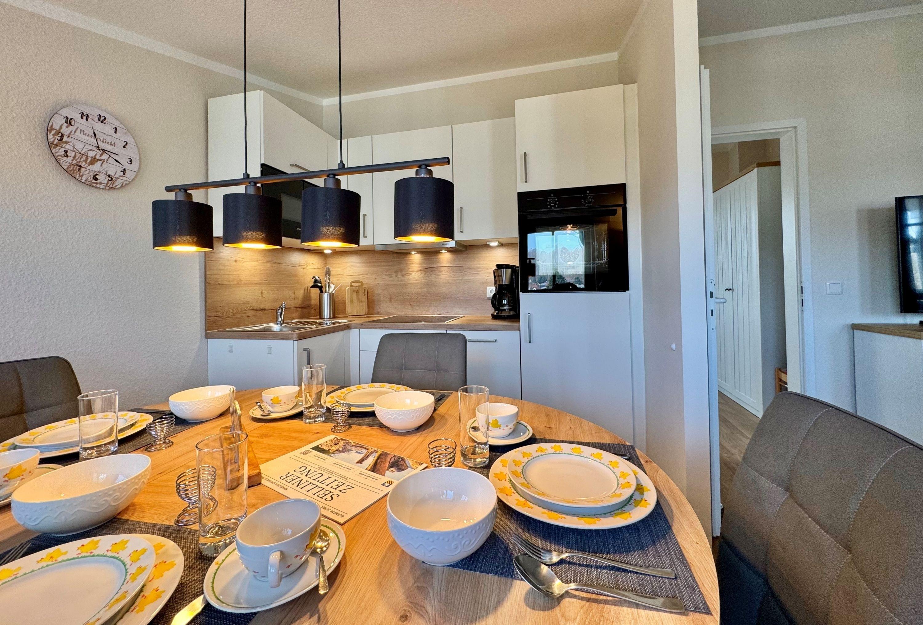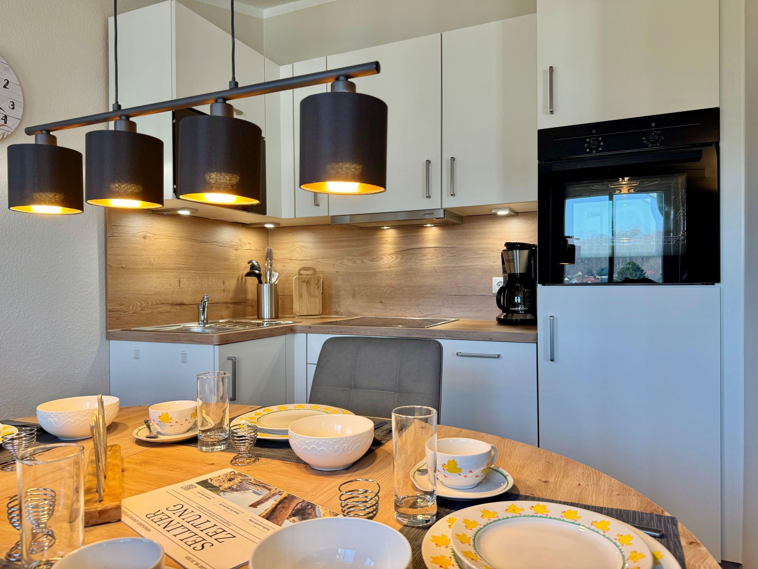 Das Badezimmer verfügt über eine Badewanne/WC, einen Föhn und einen Kosmetikspiegel. Die offene Küche ist voll ausgestattet mit Backofen, Kaffeemaschine und Toaster – hier können Sie nach Herzenslust kochen. Ein Fernseher mit drei Sky-Sendern sorgt für Unterhaltung.