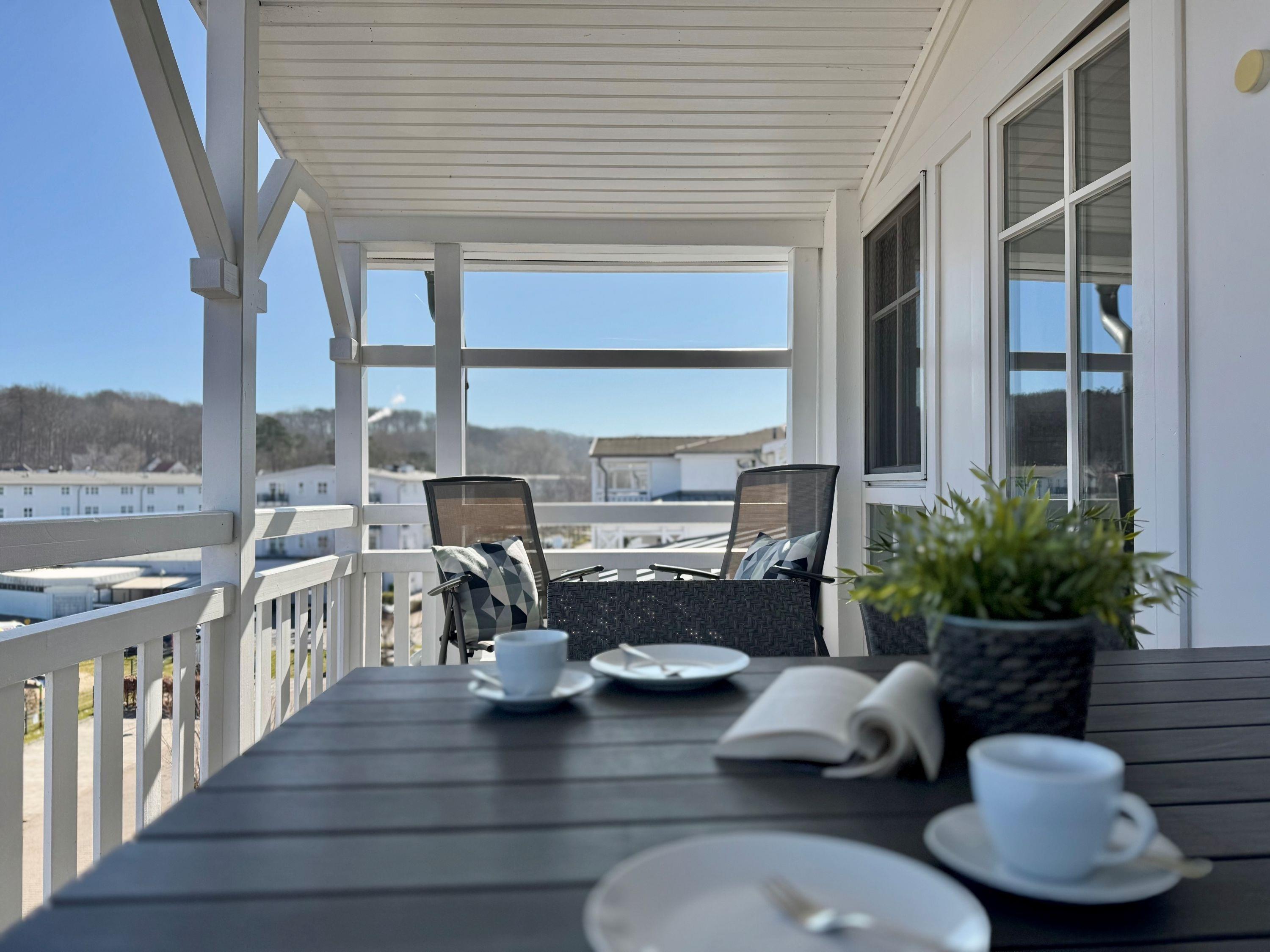 Auf dem Balkon mit Nordost-Ausrichtung können die Gäste nach einem erlebnisreichen Urlaubstag entspannen. Von hier aus lässt sich ein wunderbarer Ausblick genießen und es gibt eine Sitzgruppe zum Verweilen. In der Nichtraucher-Ferienwohnung ist es erlaubt, ein Haustier mitzubringen.