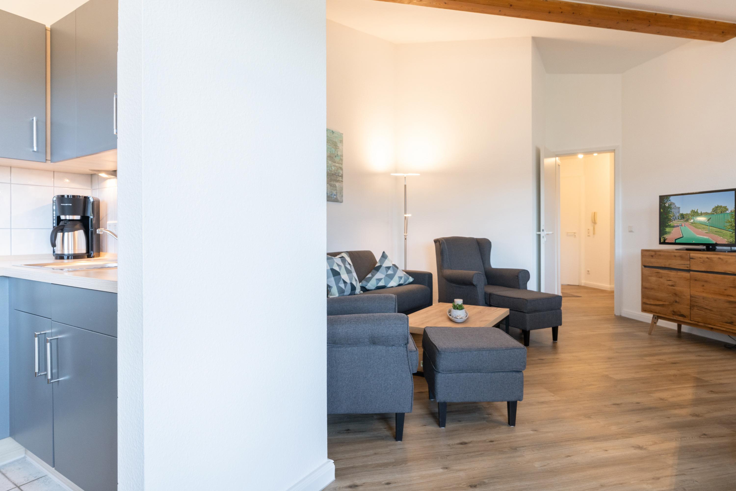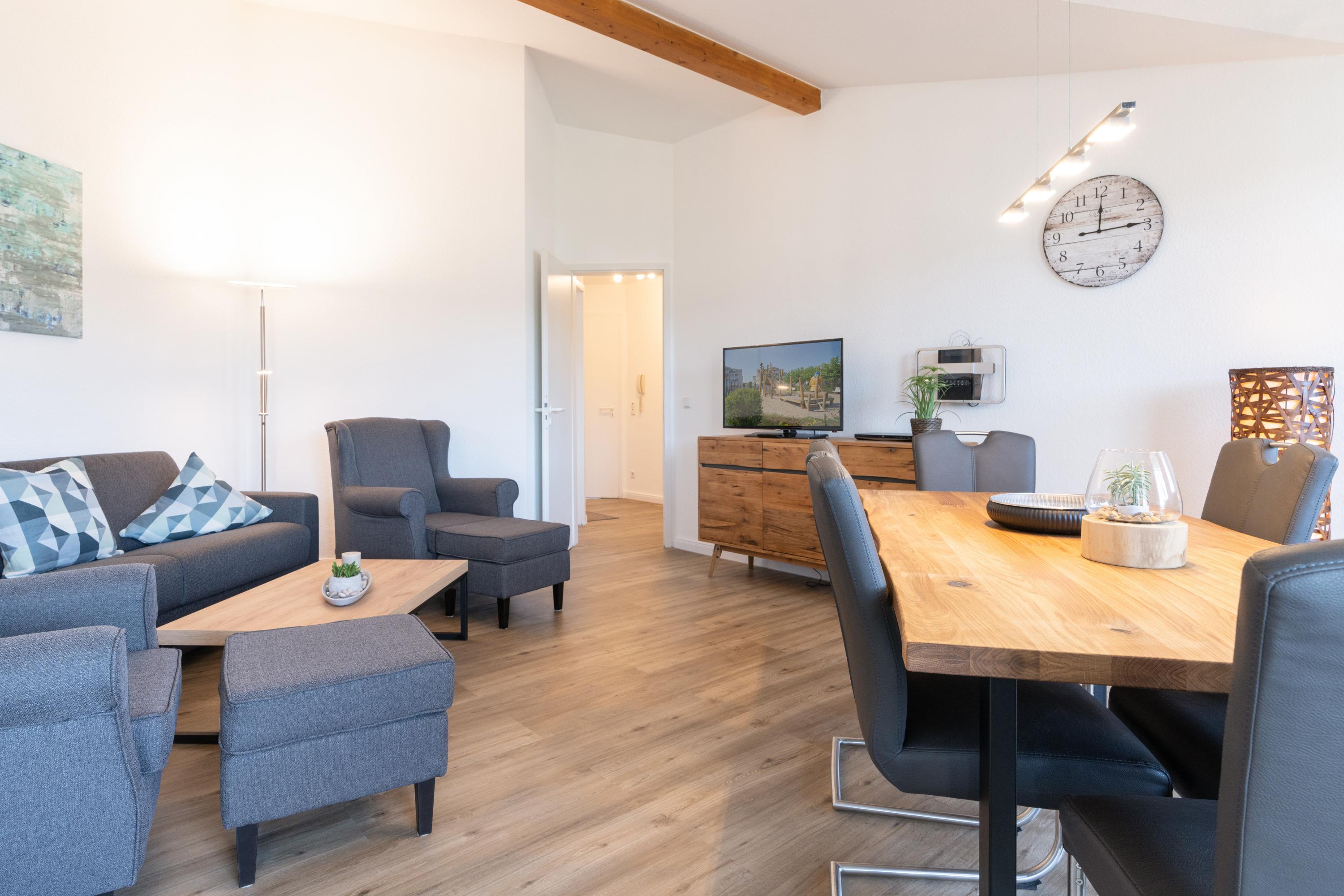 In der Ferienwohnung steht den Gästen kostenfreies WLAN zur Verfügung und die Erstausstattung an Bettwäsche ist bereits inklusive. Die beiden Schlafzimmer sind mit Verdunklung ausgestattet und verfügen jeweils über ein Doppelbett. Im Wohnzimmer gibt es außerdem eine Doppelschlafcouch. Das Badezimmer ist mit einer Badewanne, einem Föhn und einem Kosmetikspiegel ausgestattet. Zusätzlich gibt es ein separates WC. Die offene Küche ist voll ausgestattet mit einem Backofen, einer Mikrowelle, einem Geschirrspüler, einer Kaffeemaschine und einem Toaster. Auch ein Fernseher mit 3 Sky-Sendern steht zur Verfügung.