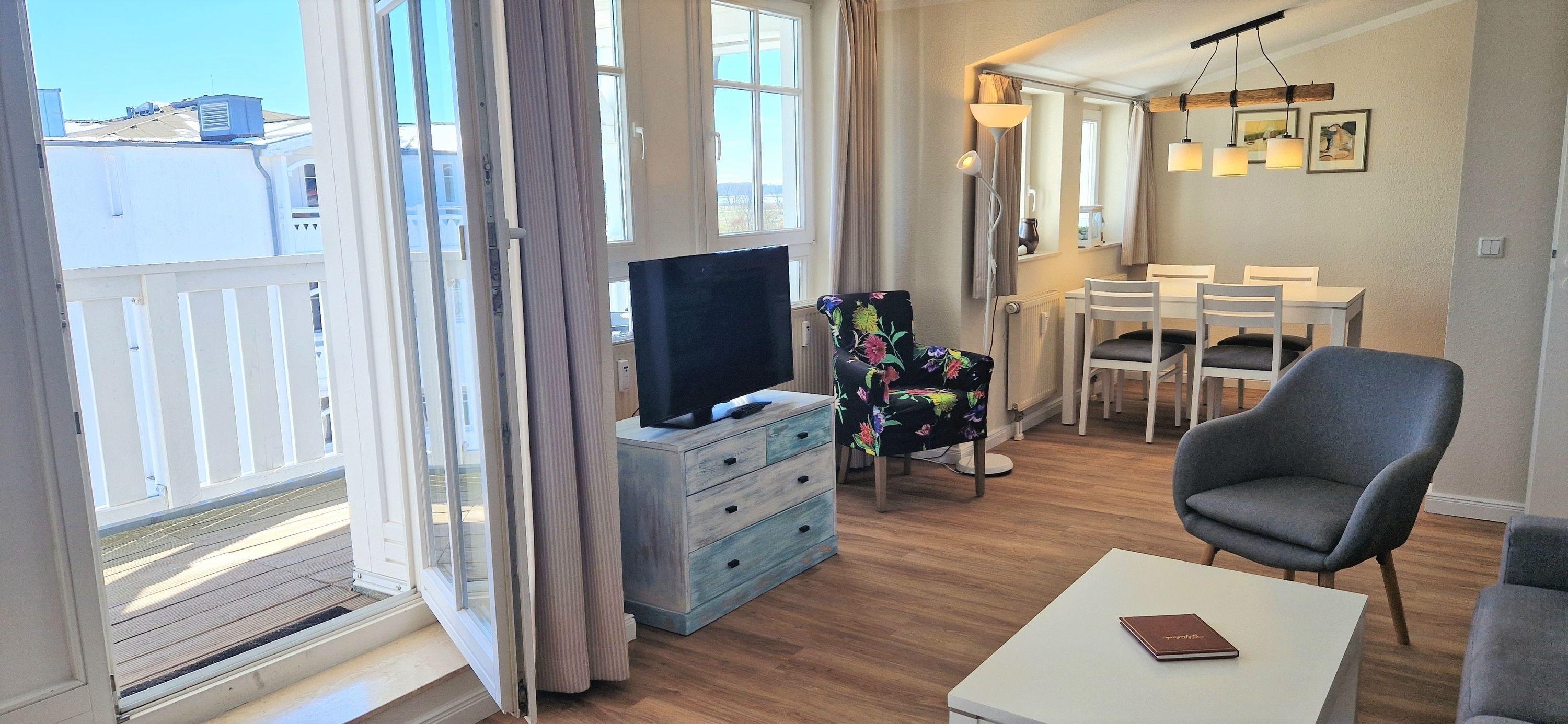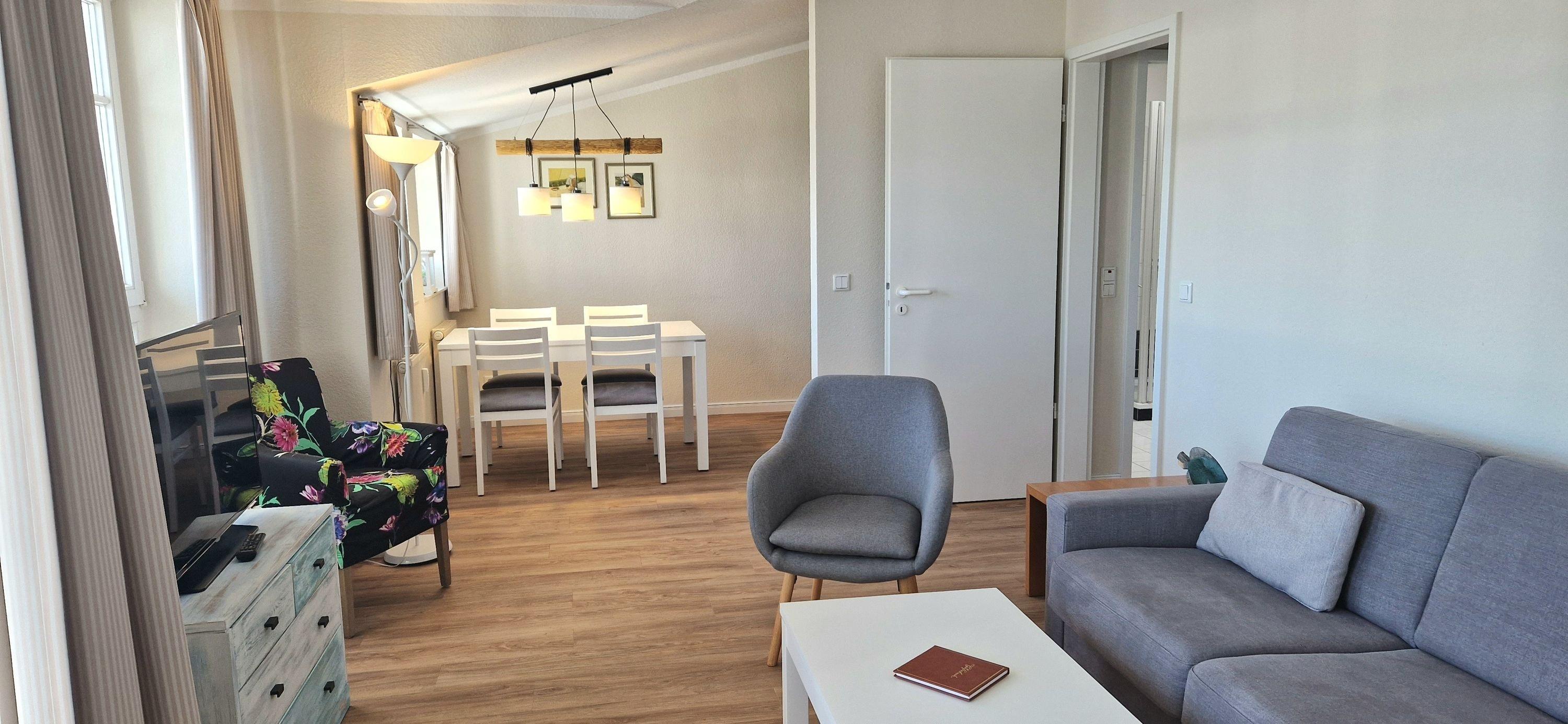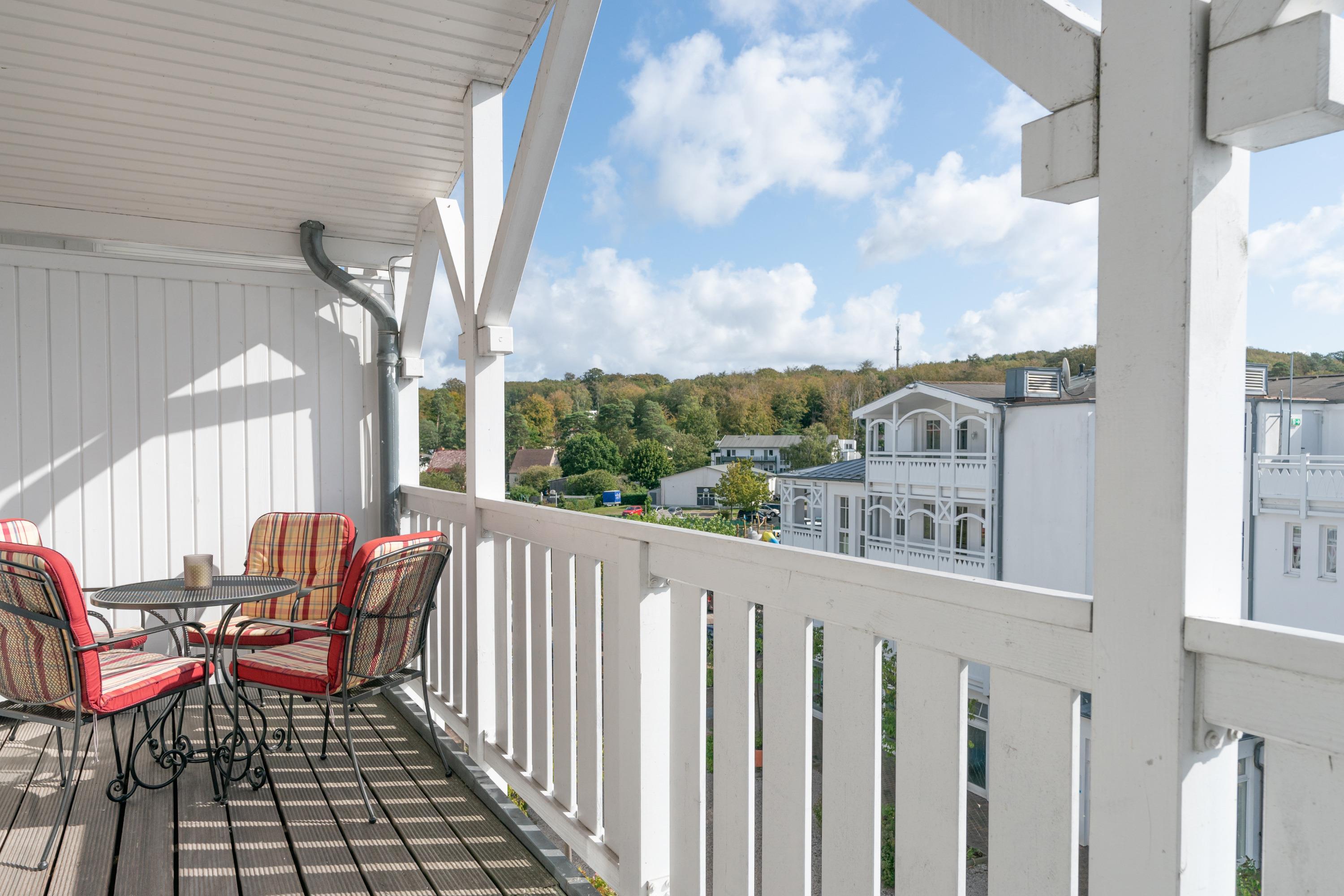 Auf dem Balkon in Südostlage können Sie nach einem ereignisreichen Tag entspannen und den Ausblick sowie die Sitzgruppe genießen. Das Nichtraucher-Apartment erlaubt keine Haustiere.