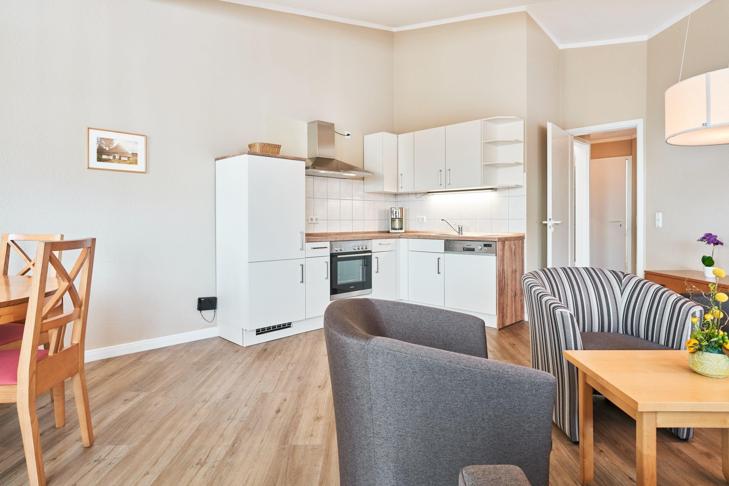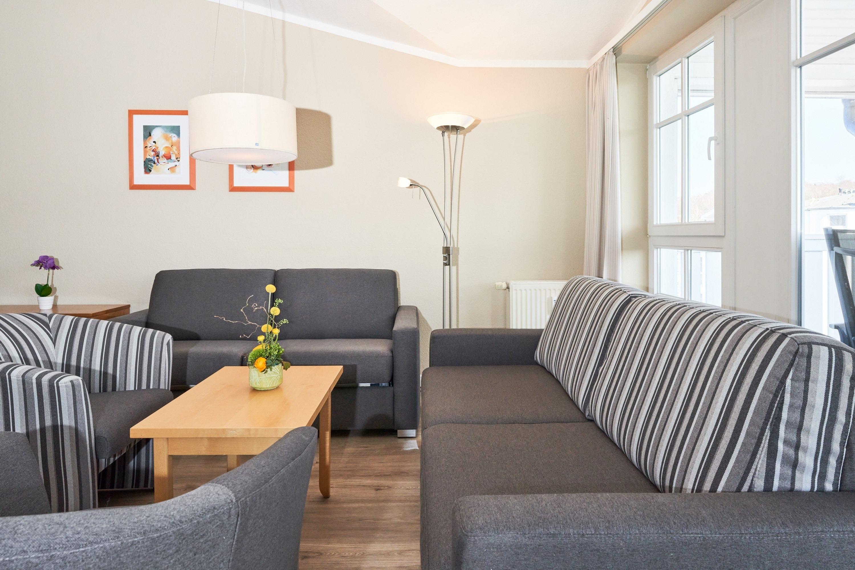 Sie befindet sich im 3. Obergeschoss, bequem mit einem Aufzug zu erreichen, der Ferienanlage Seepark Sellin und ist ca. 900 m vom Ostseestrand und dem Selliner See entfernt. Einkaufsmöglichkeiten und ein Bäcker sind in der Ferienanlage bequem zu Fuß erreichbar.