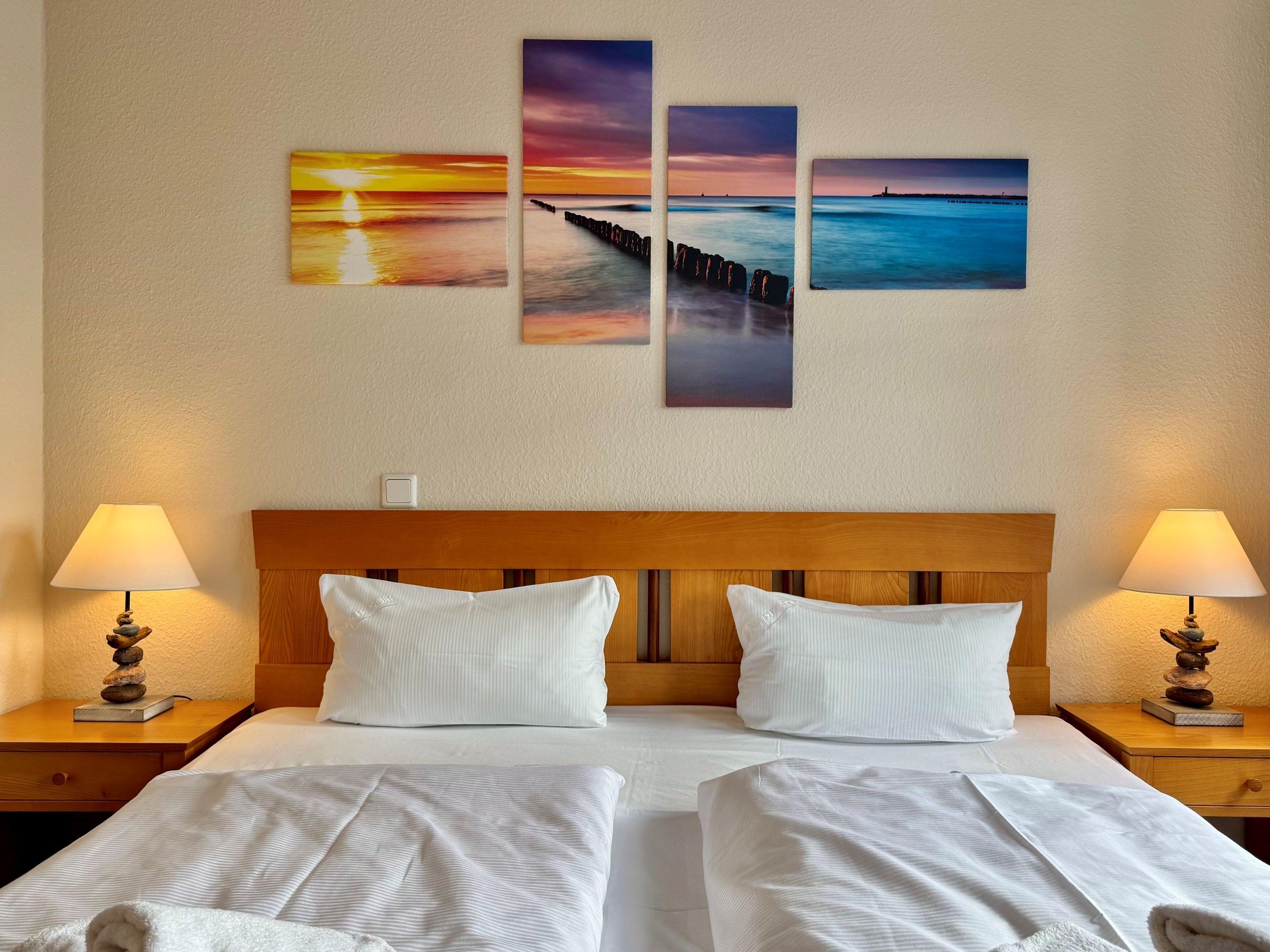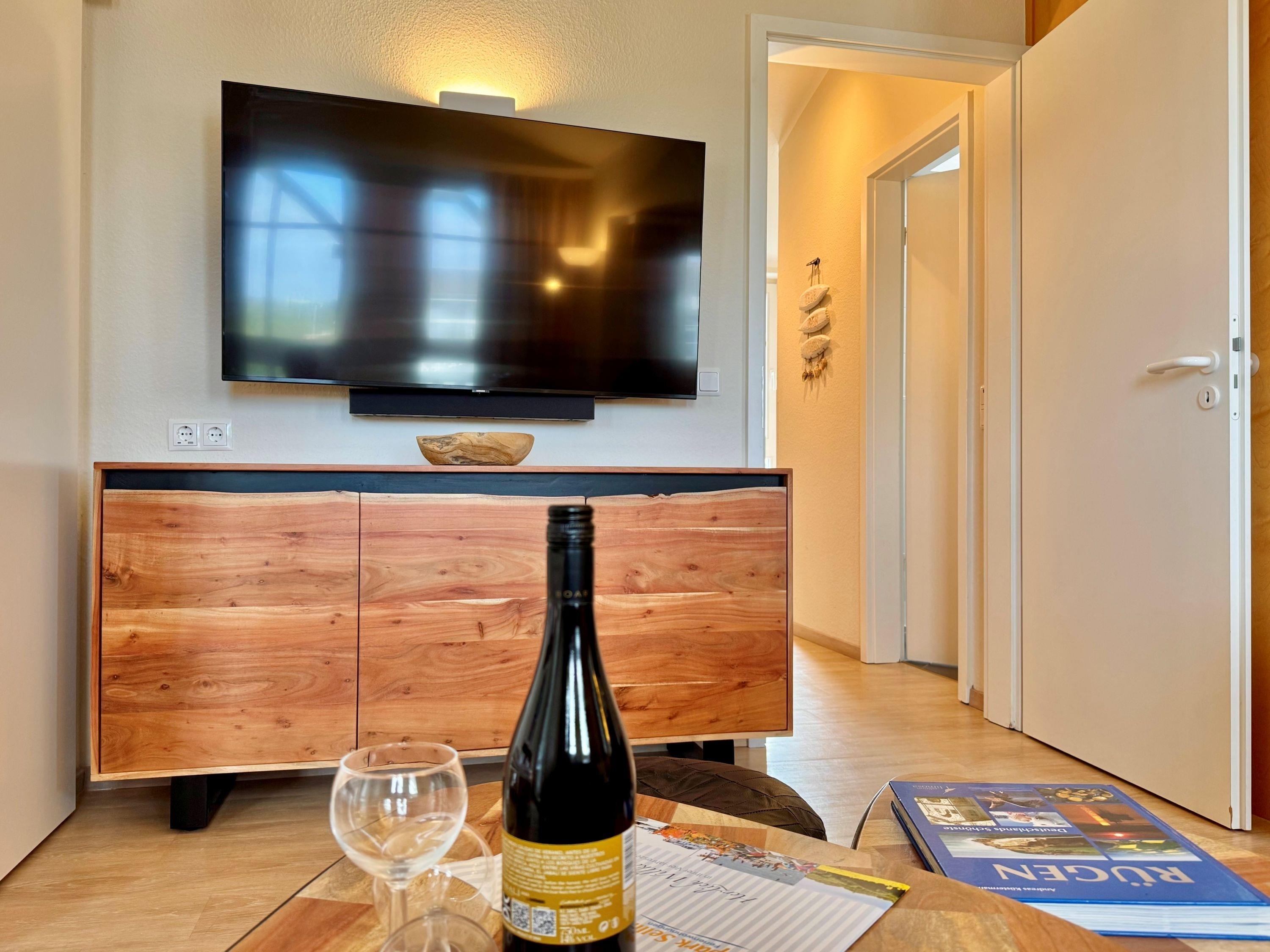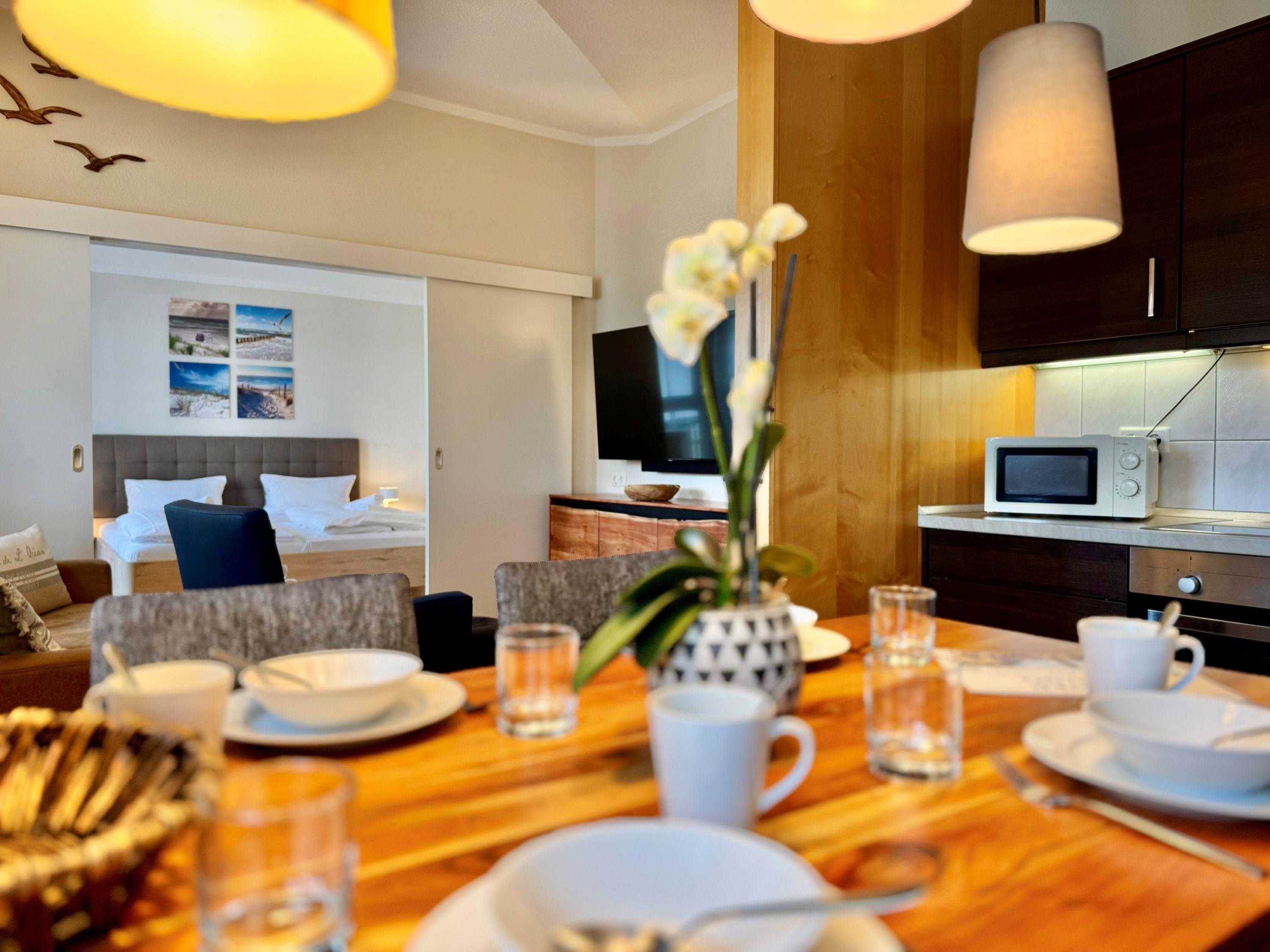 Die Ausstattung umfasst einen TV-Flachbild, eine Kaffeemaschine (Filter), eine Mikrowelle und Bettwäsche, die bereits im Preis inkludiert ist. Auch Haustiere sind in der Ferienunterkunft herzlich willkommen. Ein Balkon, ein Fahrradkeller und ein WLAN Anschluss stehen den Gästen ebenfalls zur Verfügung. Für Unterhaltung sorgt ein TV mit Sky-Sendern. Zur sicheren Unterbringung des Autos steht ein Tiefgaragenstellplatz bereit. Für den morgendlichen Brötchenservice ist ebenfalls gesorgt.