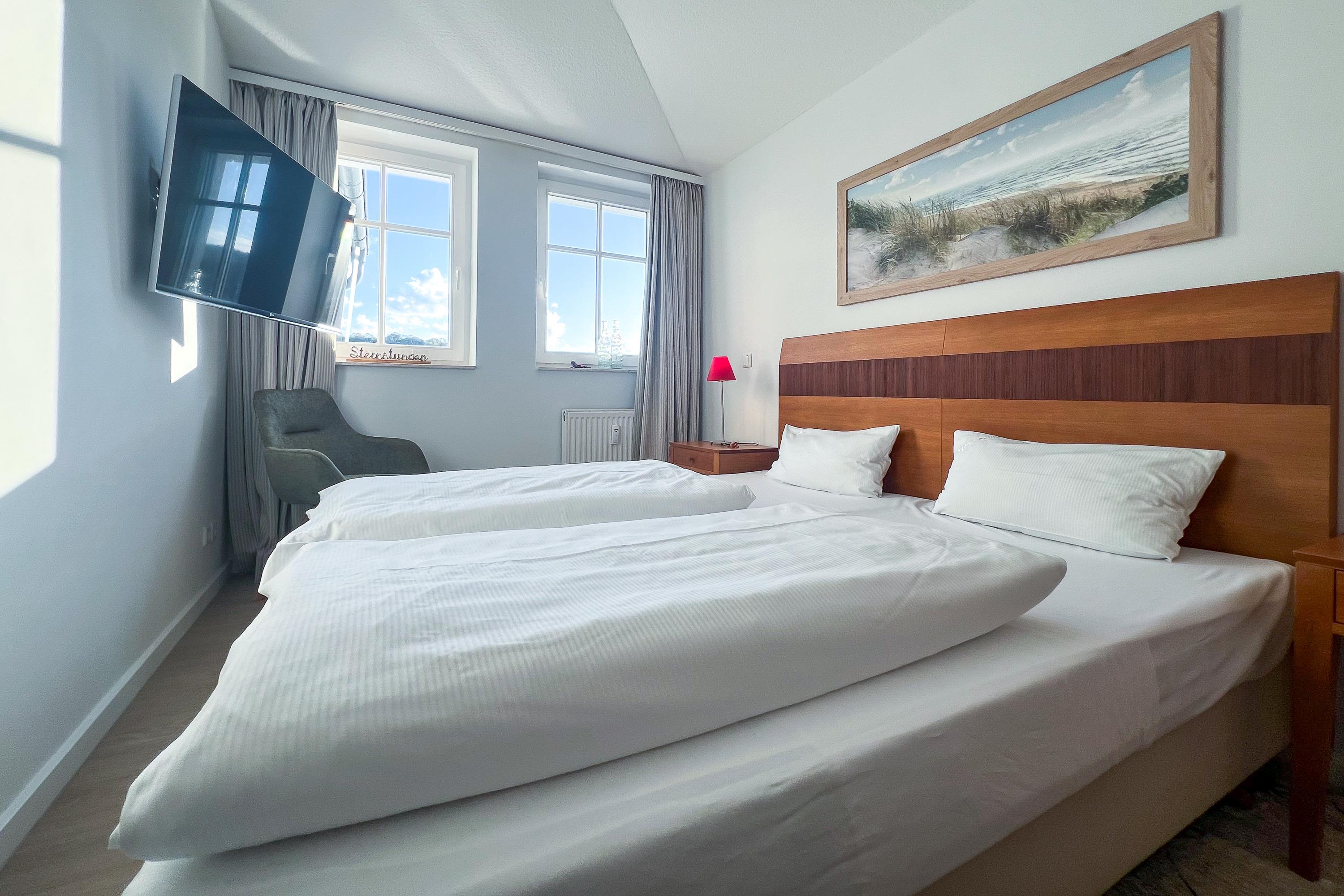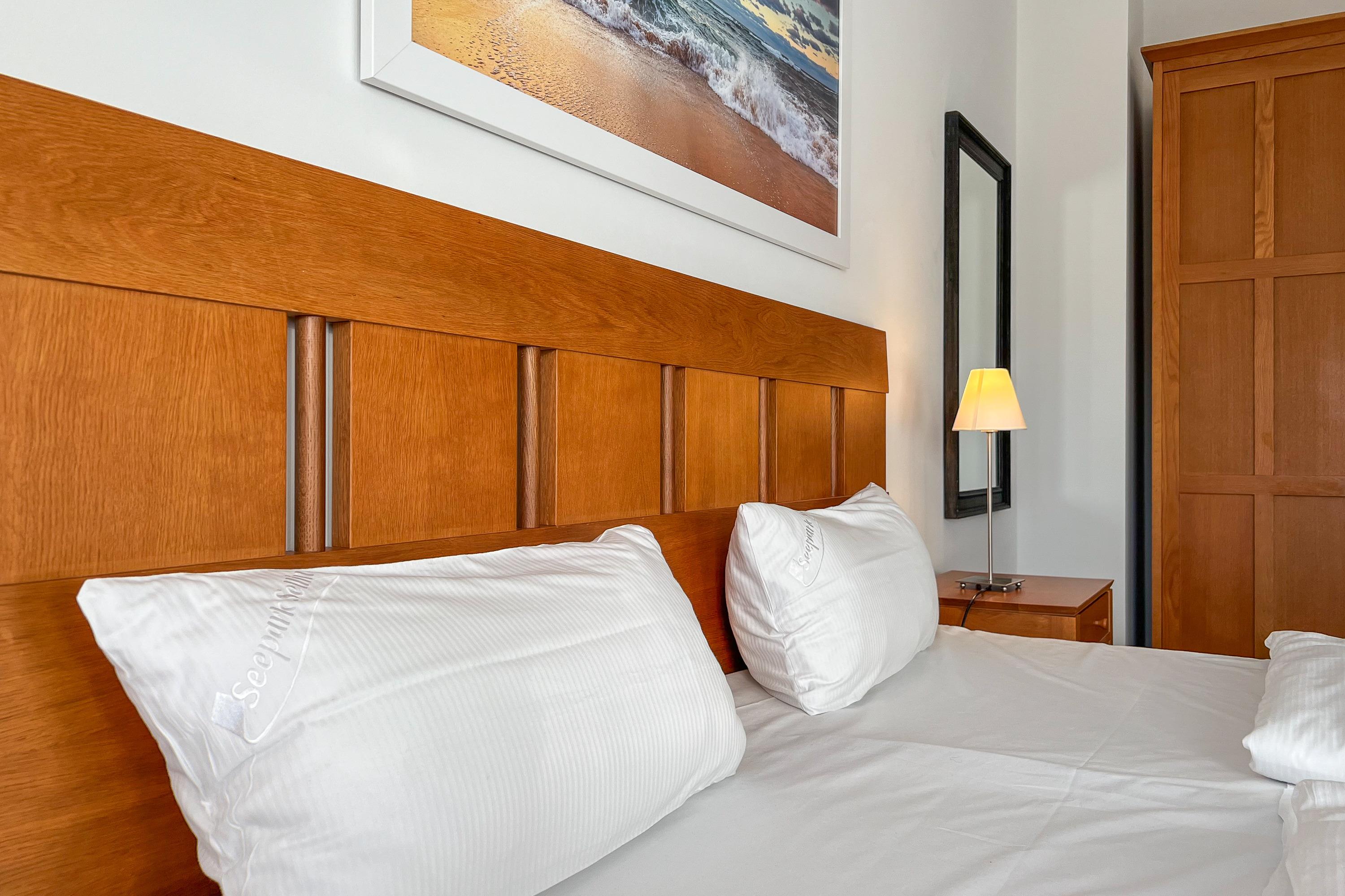 Die beiden Schlafzimmer sind mit Verdunklungsmöglichkeiten ausgestattet, haben jeweils ein Doppelbett und in einem Schlafzimmer kommen Sie zudem in den Genuss eines Fernsehers.