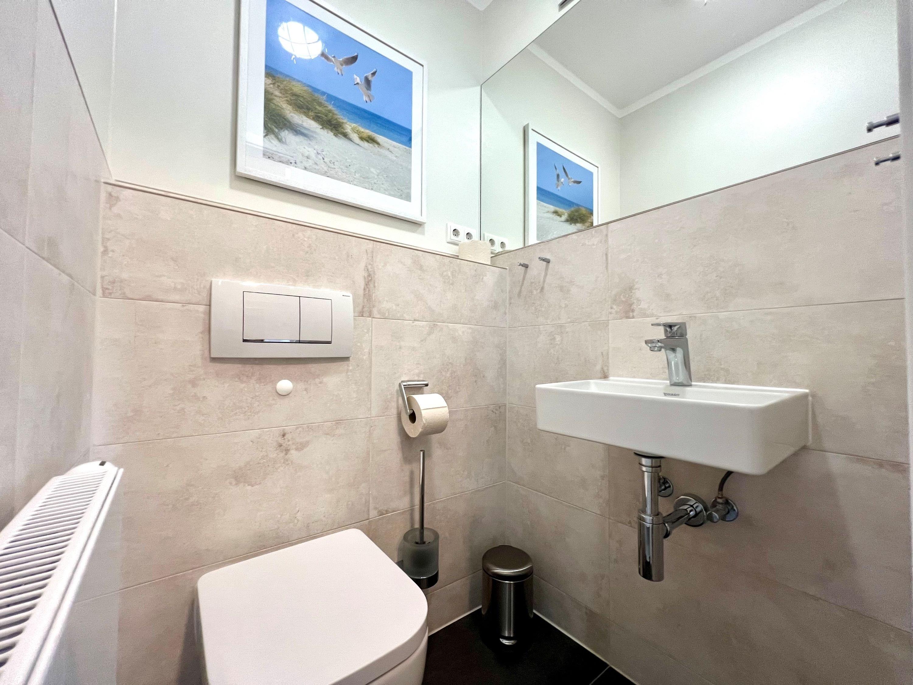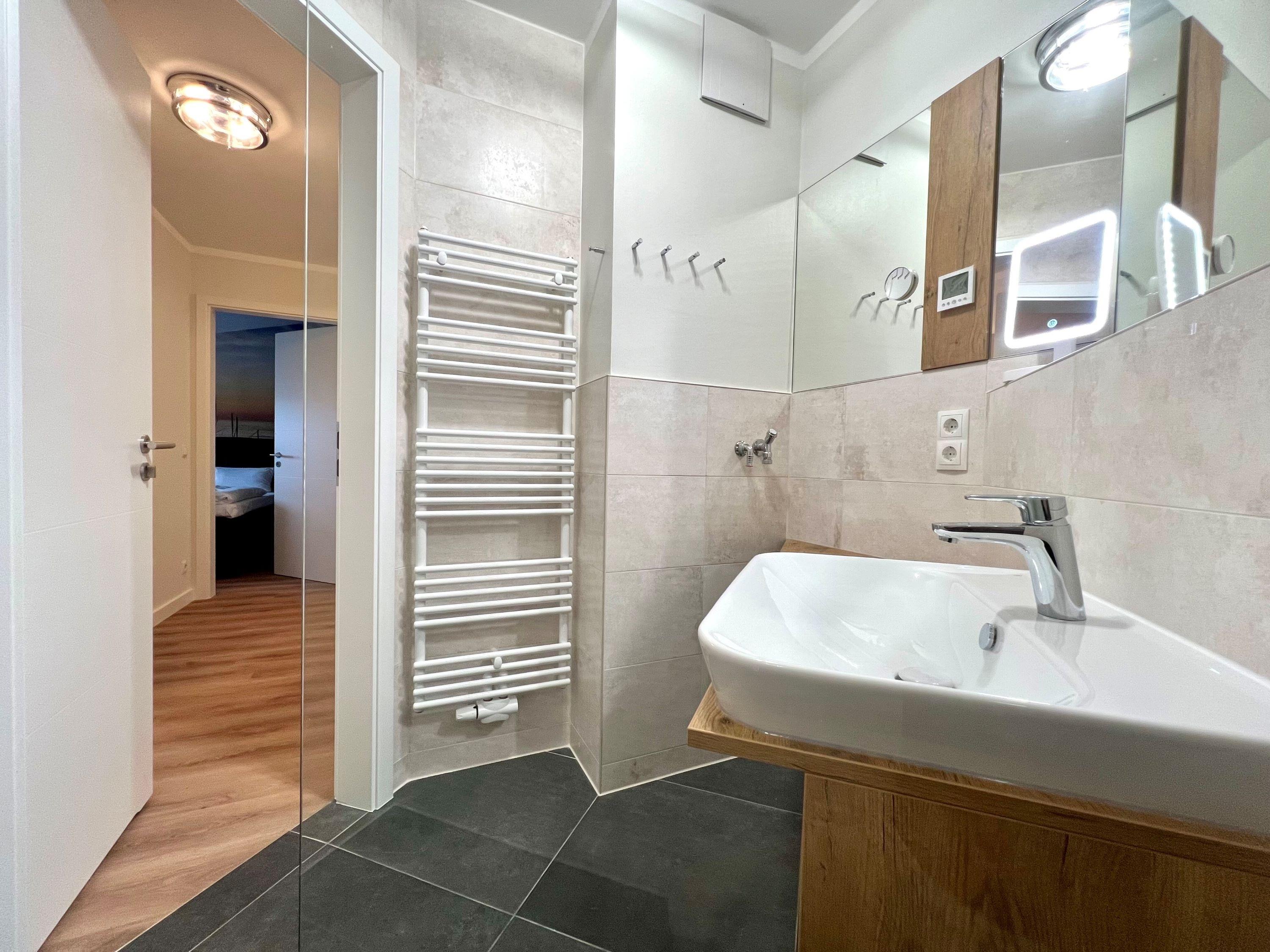 Die offene Küche ist mit hochwertigen Elektrogeräten wie Backofen, Geschirrspüler, Kaffeemaschine, Toaster, Wasserkocher und Rührgerät ausgestattet. Im geräumigen Badezimmer stehen eine ebenerdige Dusche, Fußbodenerwärmung, Föhn und Kosmetikspiegel zur Verfügung. Zudem gibt es ein separates WC und ein kleines Waschbecken.
