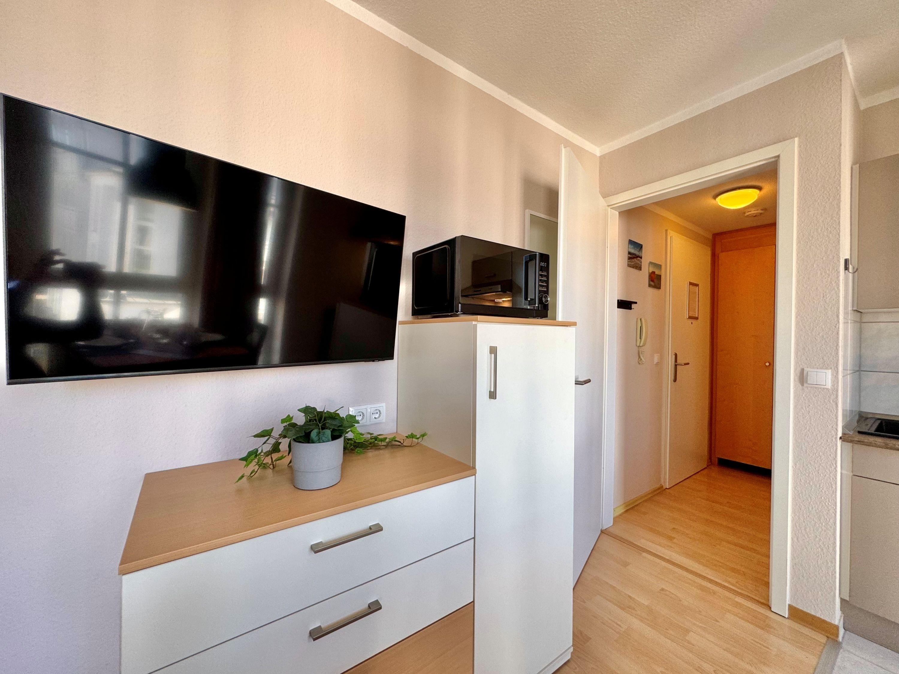 Die Ausstattung umfasst unter anderem einen TV-Flachbild, eine Kaffeemaschine (Filter), eine Mikrowelle und Bettwäsche, die bereits im Preis inbegriffen ist. Auch Haustiere sind in der Unterkunft willkommen. Vom Balkon aus können Sie die Umgebung genießen und den Blick schweifen lassen. Die Küche ist mit einer Pantry/Mini-Küche ausgestattet und im Fahrradkeller können Sie Ihre Fahrräder sicher unterstellen. Ein WLAN Anschluss sowie ein TV mit Sky-Sendern stehen Ihnen ebenfalls zur Verfügung. Für einen angenehmen Start in den Tag können Sie den Brötchenservice nutzen.