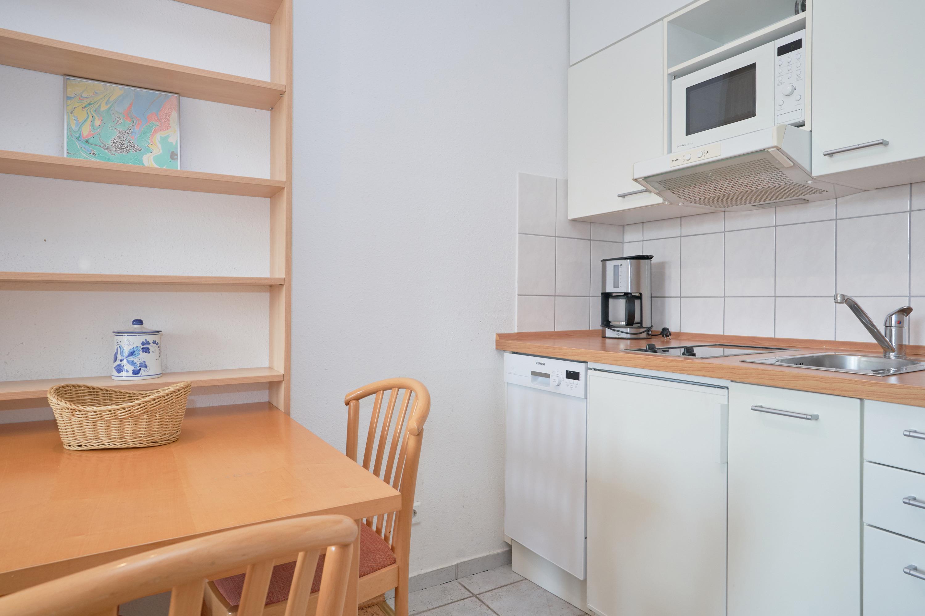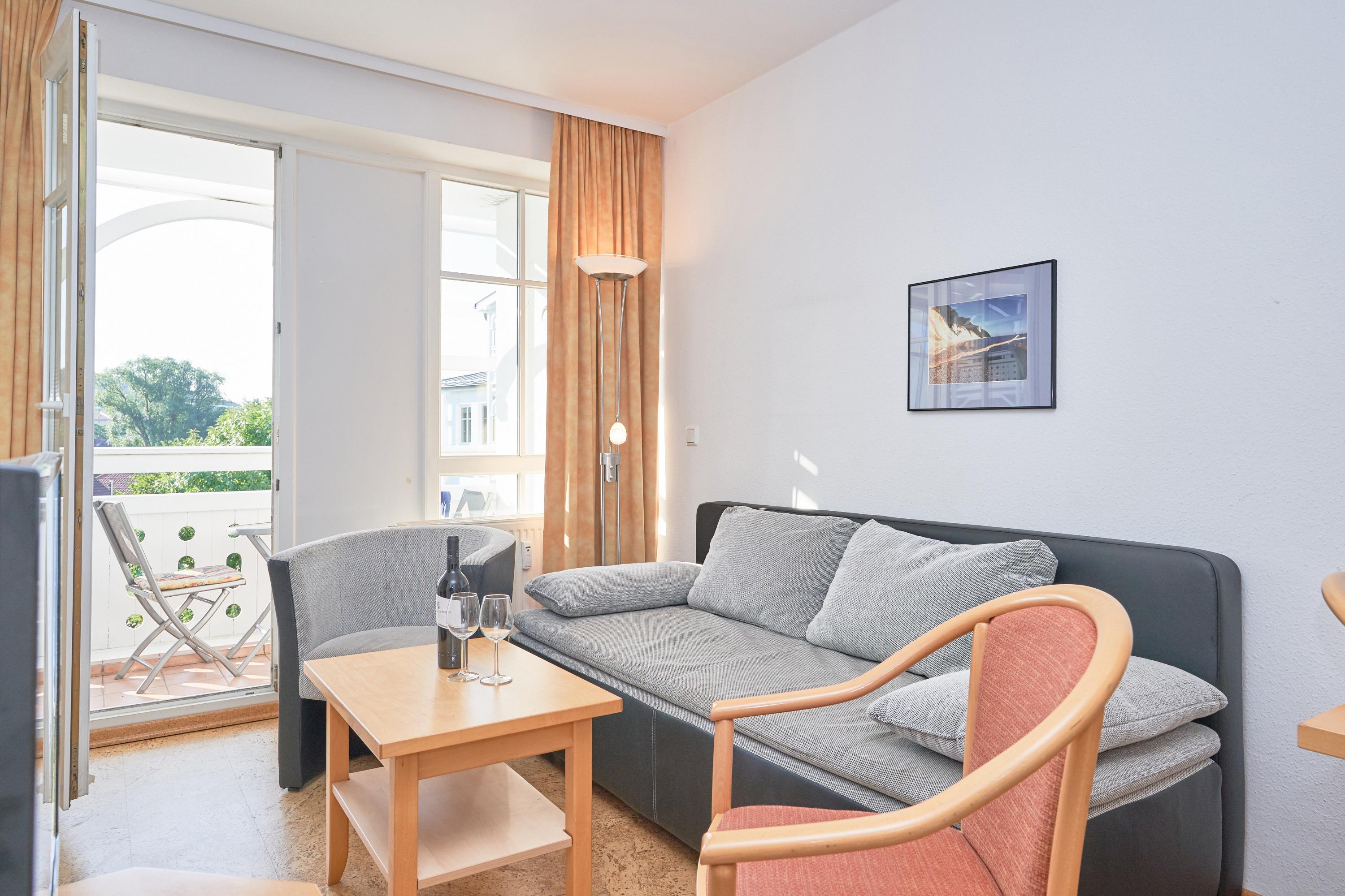 Die Ferienwohnung verfügt über kostenfreies WLAN und die Erstausstattung an Bettwäsche ist inklusive. Das Schlafzimmer verfügt über ein Doppelbett, im Wohnzimmer befindet sich zusätzlich eine Doppelschlafcouch. Darüber hinaus verfügt die Ferienwohnung über ein Bad mit Dusche/WC. Die voll ausgestattete, offene Küche mit Geschirrspüler, Mikrowelle, Kaffeemaschine und Toaster lässt keine Wünsche offen. Ein Fernseher inkl. 3 Sky-Sender rundet die Einrichtung ab. Nach einem erlebnisreichen Urlaubstag können Sie auf dem Balkon in Südostlage Platz nehmen. Der Ausblick und die Sitzgruppe sorgen hier für ein wunderbares Urlaubsgefühl. Im Nichtraucher-Apartment sind Haustiere nicht gestattet.