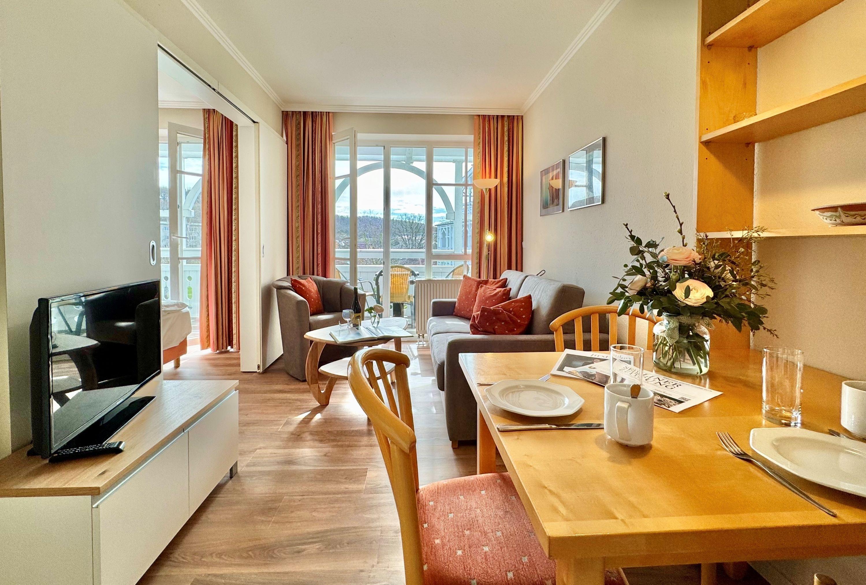 Die Ferienwohnung verfügt über kostenfreies WLAN und die Erstausstattung an Bettwäsche ist inklusive. Das Schlafzimmer mit Verdunklung verfügt über ein Doppelbett, im Wohnzimmer befindet sich zusätzlich eine Doppelschlafcouch. Darüber hinaus verfügt die Ferienwohnung über ein Bad mit Dusche/WC, Föhn sowie einem Kosmetikspiegel. Die voll ausgestattete, offene Küche mit Geschirrspüler, Mikrowelle, Kaffeemaschine und Toaster lässt keine Wünsche offen. Ein Fernseher inkl. 3 Sky-Sender rundet die hochwertige Einrichtung ab. Nach einem erlebnisreichen Urlaubstag können Sie auf dem Balkon in Südostlage Platz nehmen. Der Ausblick und die Sitzgruppe sorgen hier für ein wunderbares Urlaubsgefühl. Im Nichtraucher-Apartment ist ein mitreisendes Haustier gestattet.