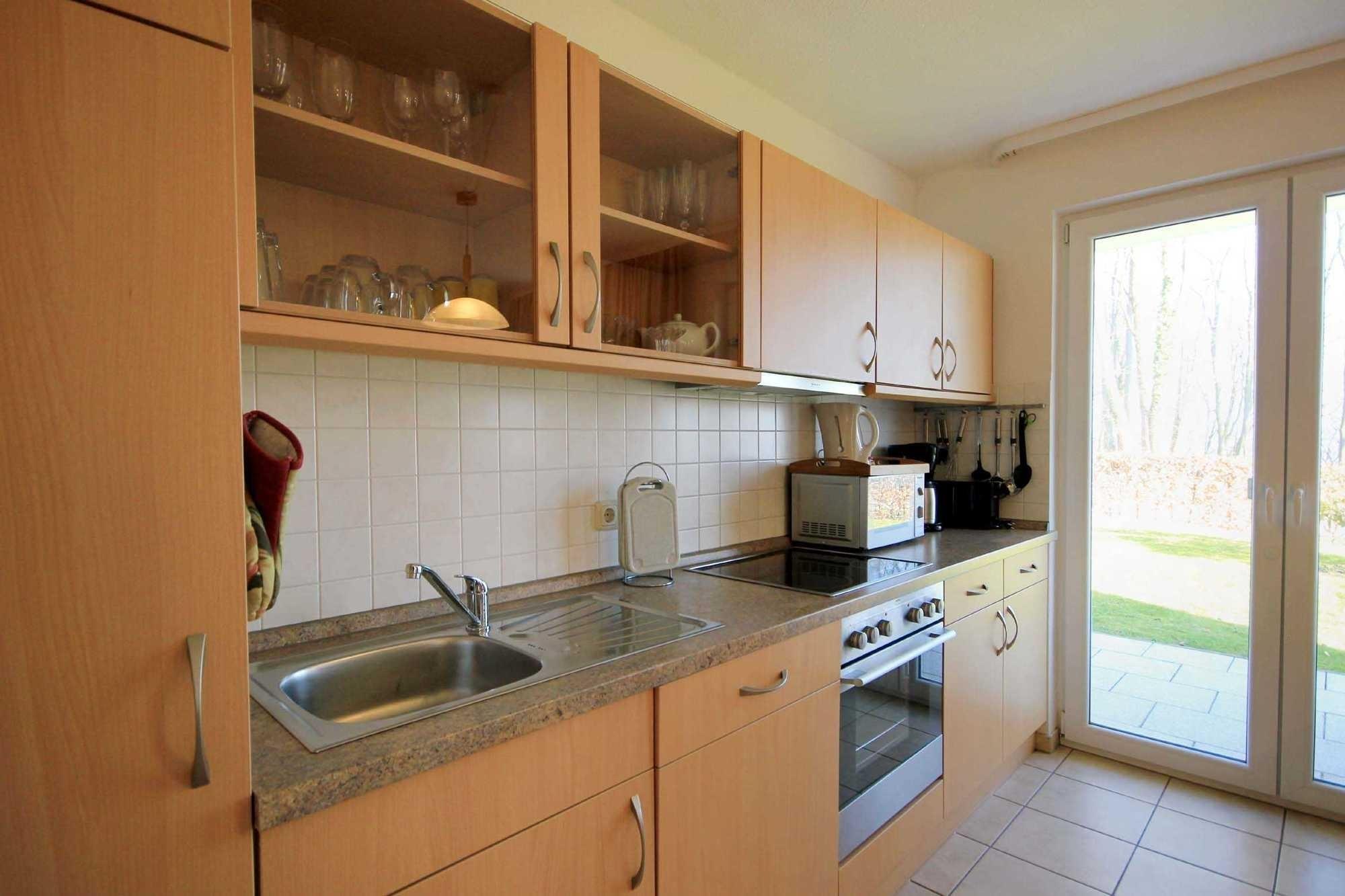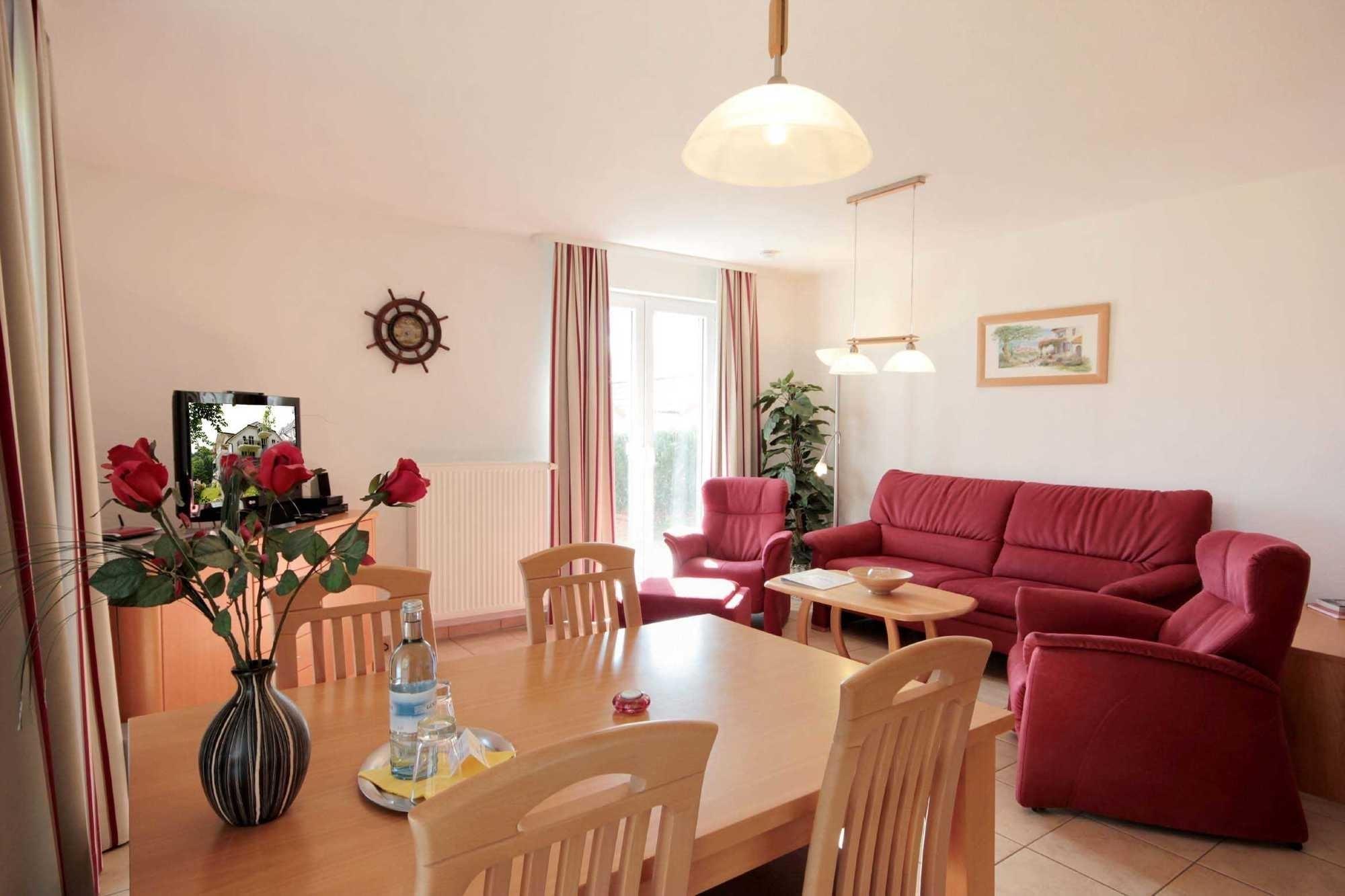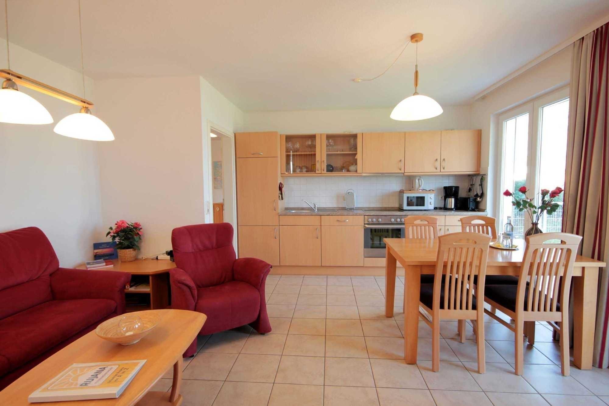 Ihr große freundliche 3 - Raum Ferienwohnung 57RB2 befindet sich im Erdgeschoss. Sie hat eine Größe von ca. 70 qm und ist für maximal 6 Personen eingerichtet. Die Wohnung verfügt über einen Wohnraum mit Schlafsofa, zwei Schlafzimmer, eine offene Küche und ein Badezimmer. Von einem Schlafraum, sowie vom Wohnraum haben Sie Zugang zu jeweils einer Ost- und einer Südterrasse mit großem umzäunten Gartenbereich. Das Haus ist mit einem Aufzug ausgestattet, von dem aus Sie bequem die Wohnung erreichen können. Neben dem behaglichen Wohnraum mit LCD - Fernseher, DVD - Heimkino - System und Schlafcouch, gibt es zwei weitere Schlafräume mit je zwei Betten. Die Küche ist komplett ausgestattet mit Geschirrspüler, Backofen, Kühlschrank, extra Sitzgelegenheit und diversen Kleingeräten. Im Badezimmer finden Sie eine Dusche, Badewanne, Waschtisch und eine Waschmaschine. Ab sofort können unsere Gäste einen kostenfreien Internetzugang nutzen.