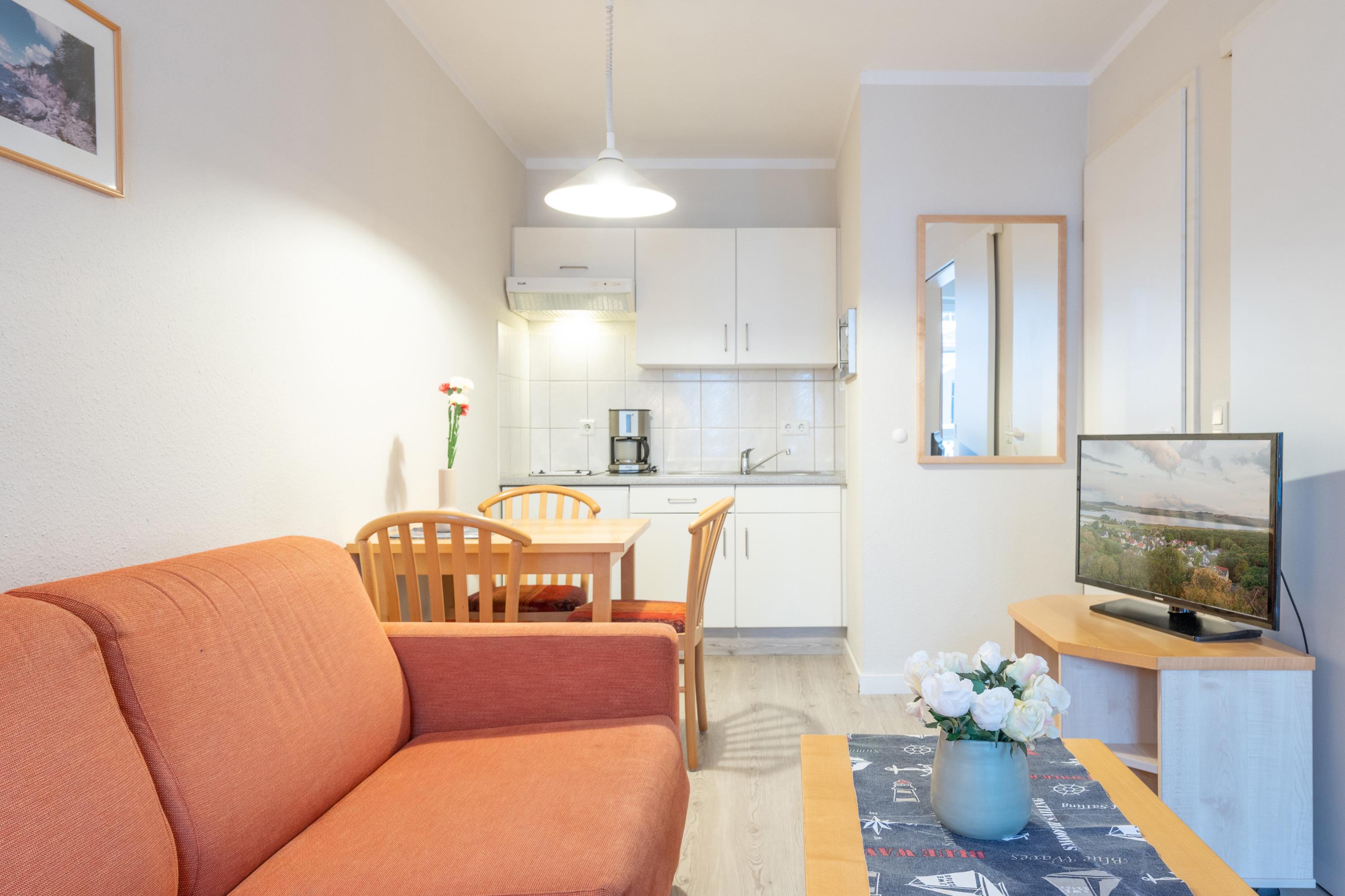 Die Ferienwohnung verfügt über kostenfreies WLAN und die Erstausstattung an Bettwäsche ist inklusive. Das Schlafzimmer mit Verdunklung verfügt über ein Doppelbett, im Wohnzimmer befindet sich zusätzlich eine Doppelschlafcouch. Darüber hinaus verfügt die Ferienwohnung über ein Bad mit Dusche/WC, Föhn sowie einem Kosmetikspiegel. Die voll ausgestattete, offene Küche mit Mikrowelle, Kaffeemaschine und Toaster lässt keine Wünsche offen. Ein Fernseher inkl. 3 Sky-Sender rundet die Einrichtung ab. Nach einem erlebnisreichen Urlaubstag können Sie auf dem Balkon in Nordwestlage Platz nehmen. Der Ausblick und die Sitzgruppe sorgen hier für ein wunderbares Urlaubsgefühl. Im Nichtraucher-Apartment ist ein mitreisendes Haustier gestattet.