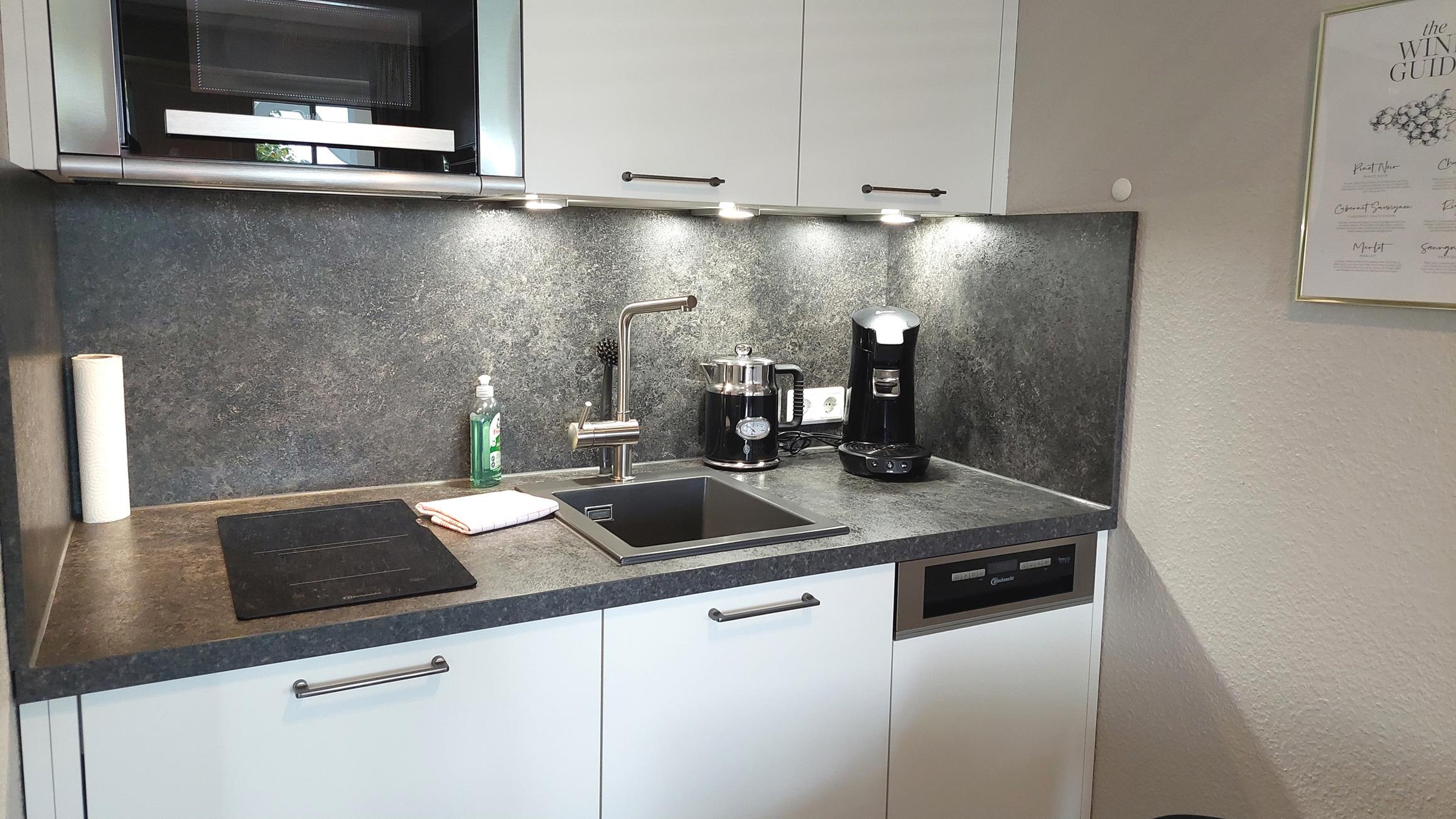 Mit 2 Ceranfeldflächen, Kühlschrank (samt Gefrierfach), Geschirrspüler und Mikrowelle (samt Backfunktion) steht alles zur Verfügung um sich auch im Urlaub selbst zu verpflegen.