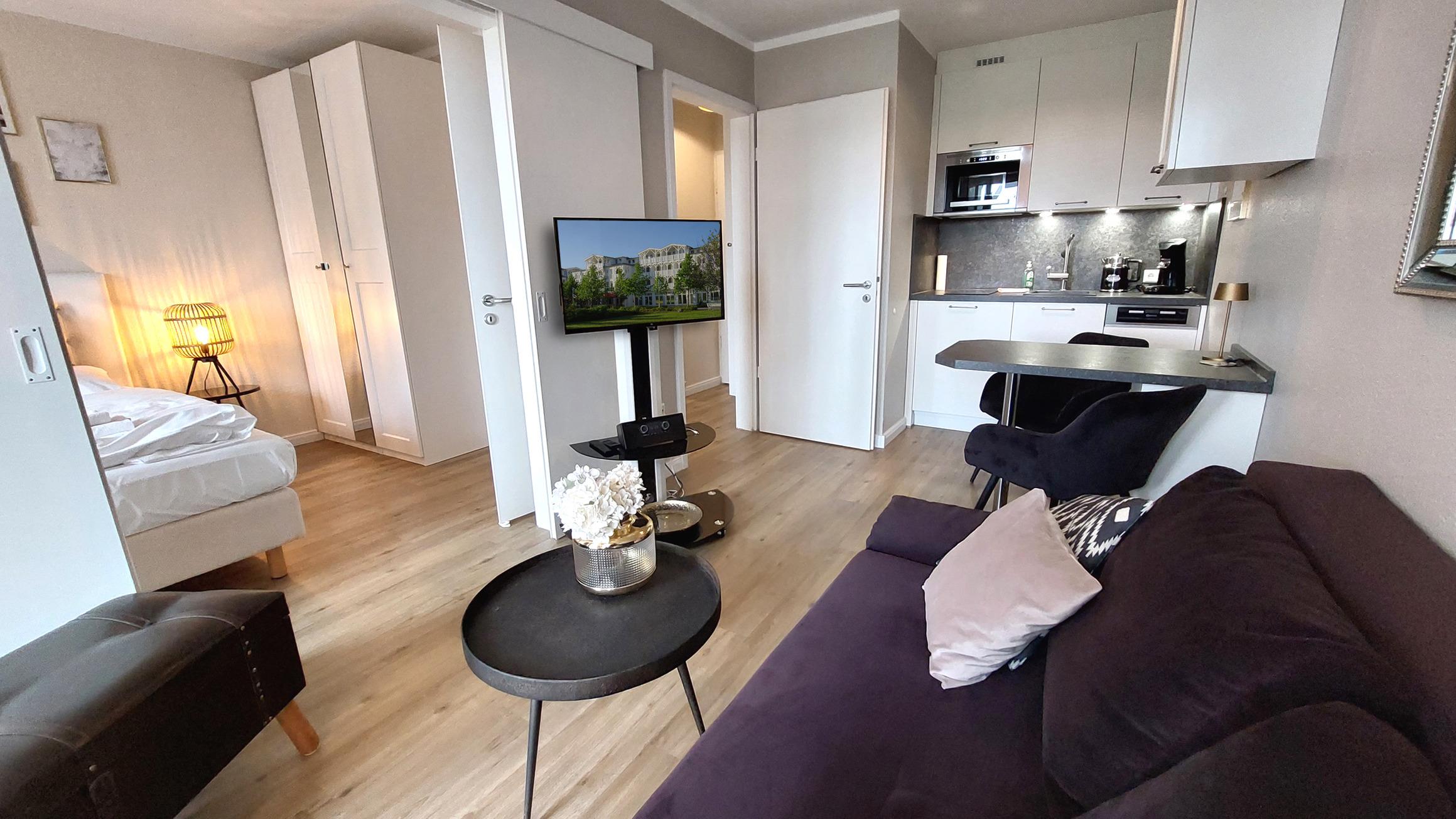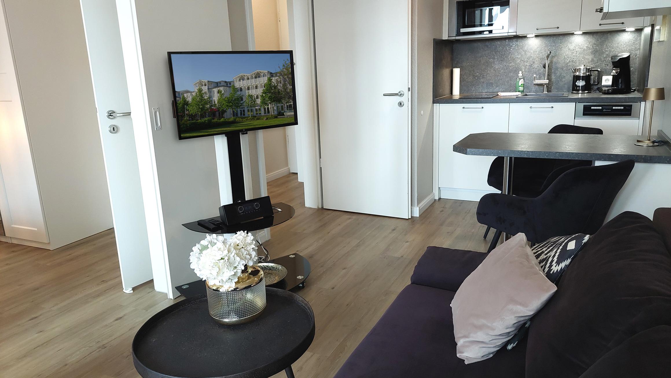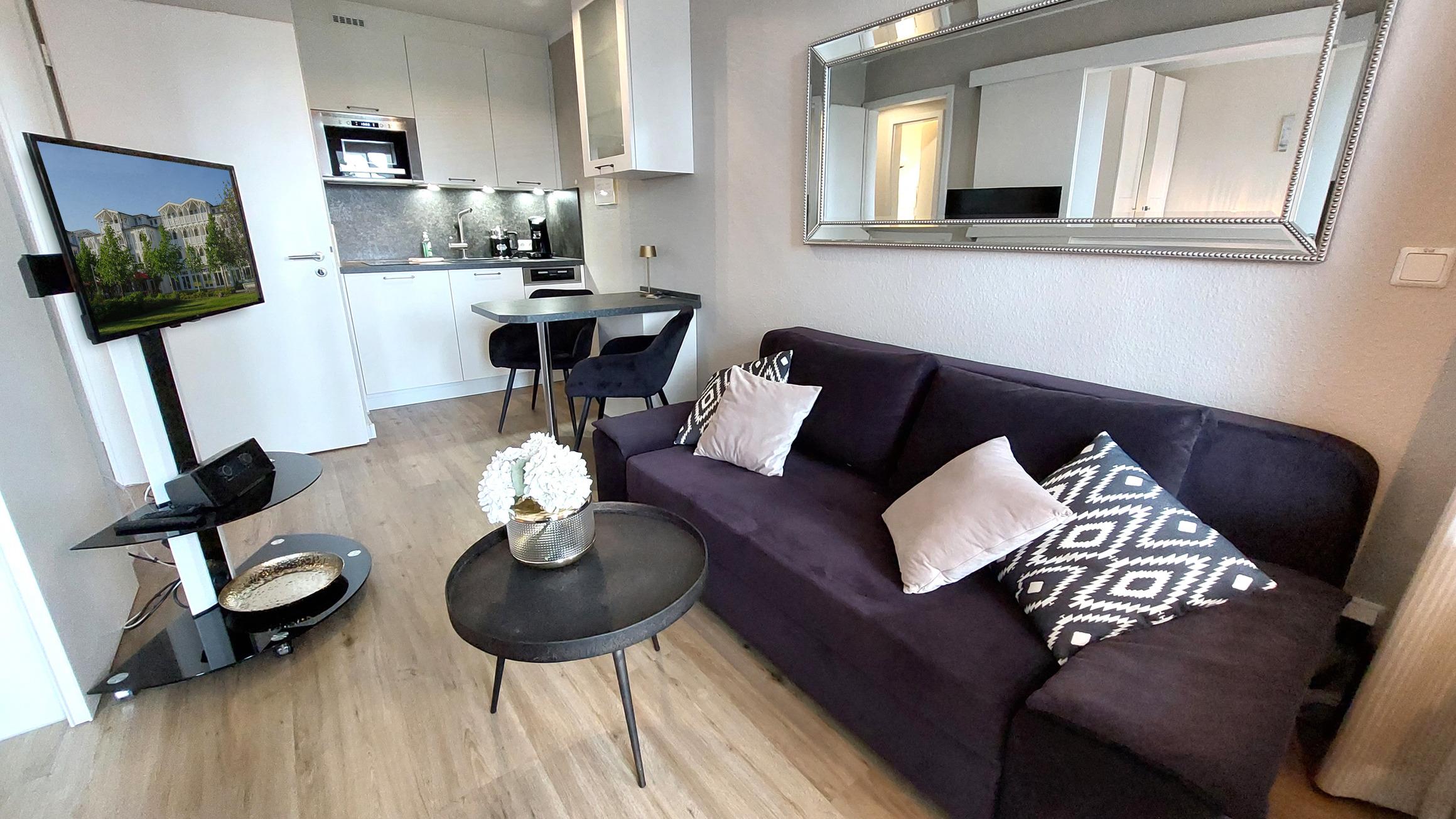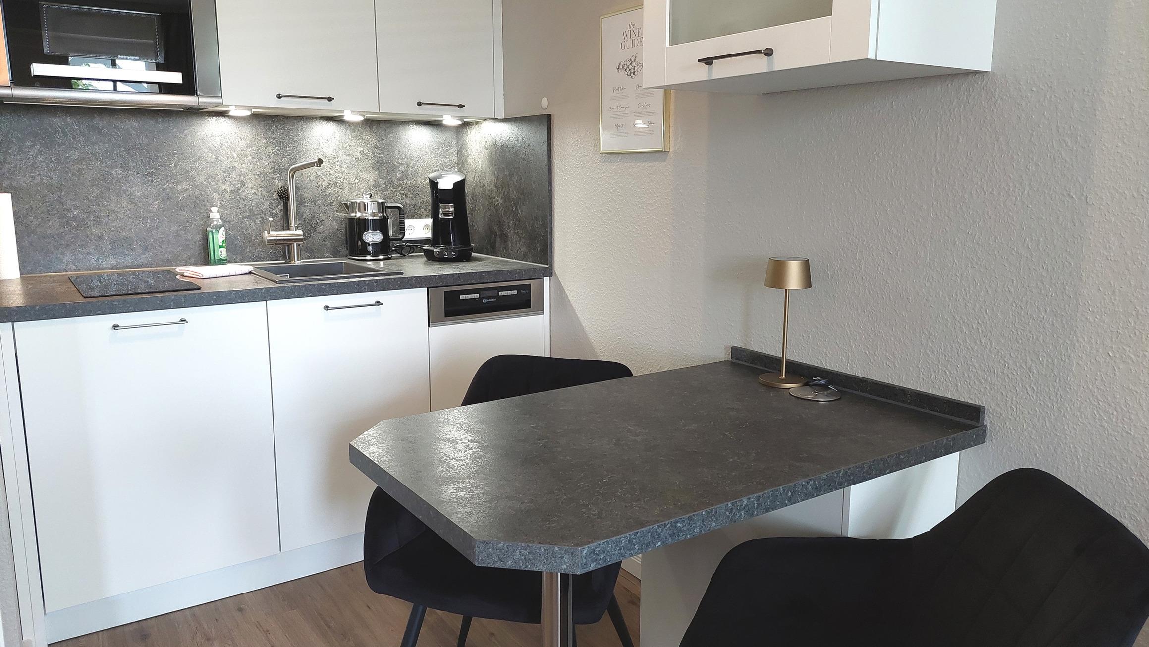 Im gemütlichen Wohnbereich befindet sich eine moderne, offene Küchenzeile samt Esstisch für bis zu 3 Personen.