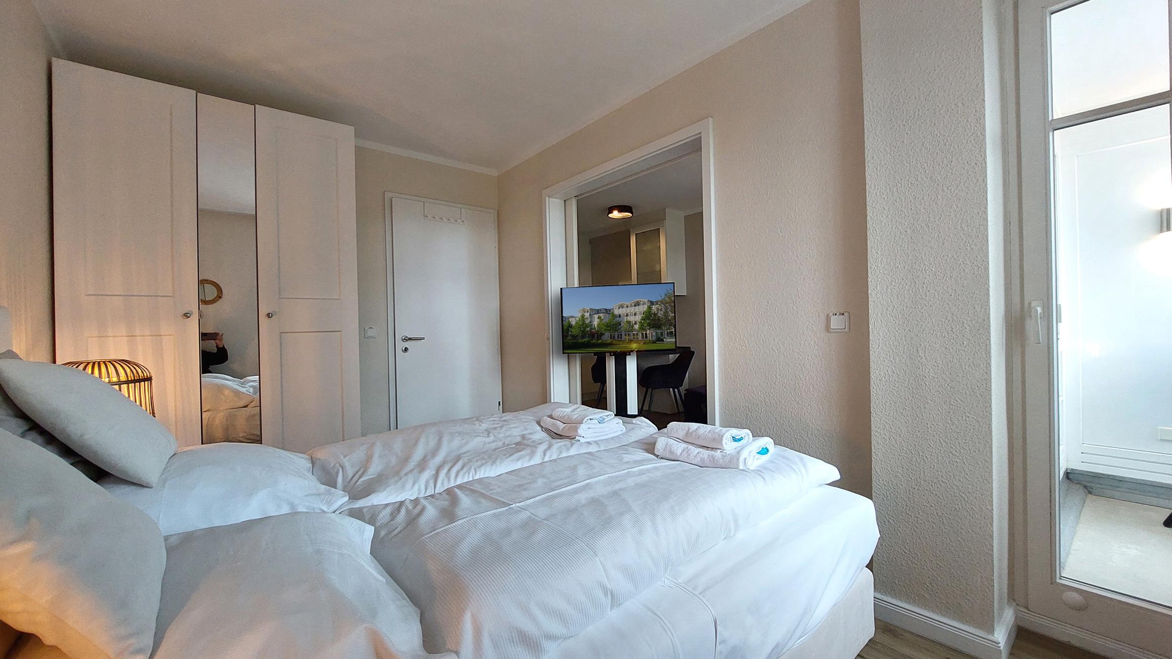 Zudem bietet das Schlafzimmer zusätzlichen Zugang zum Balkon und, via Schiebetür, zum Wohnbereich.