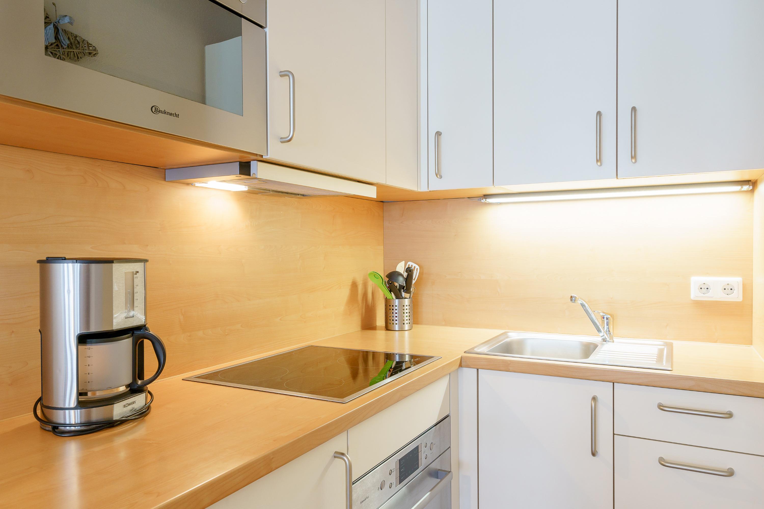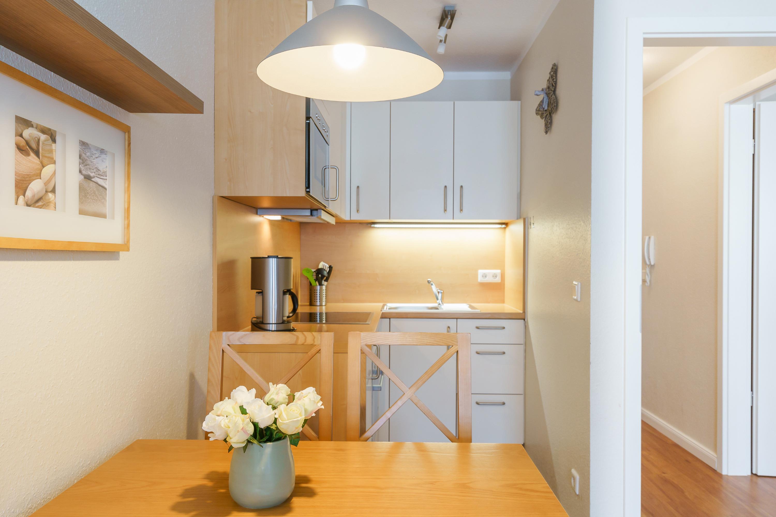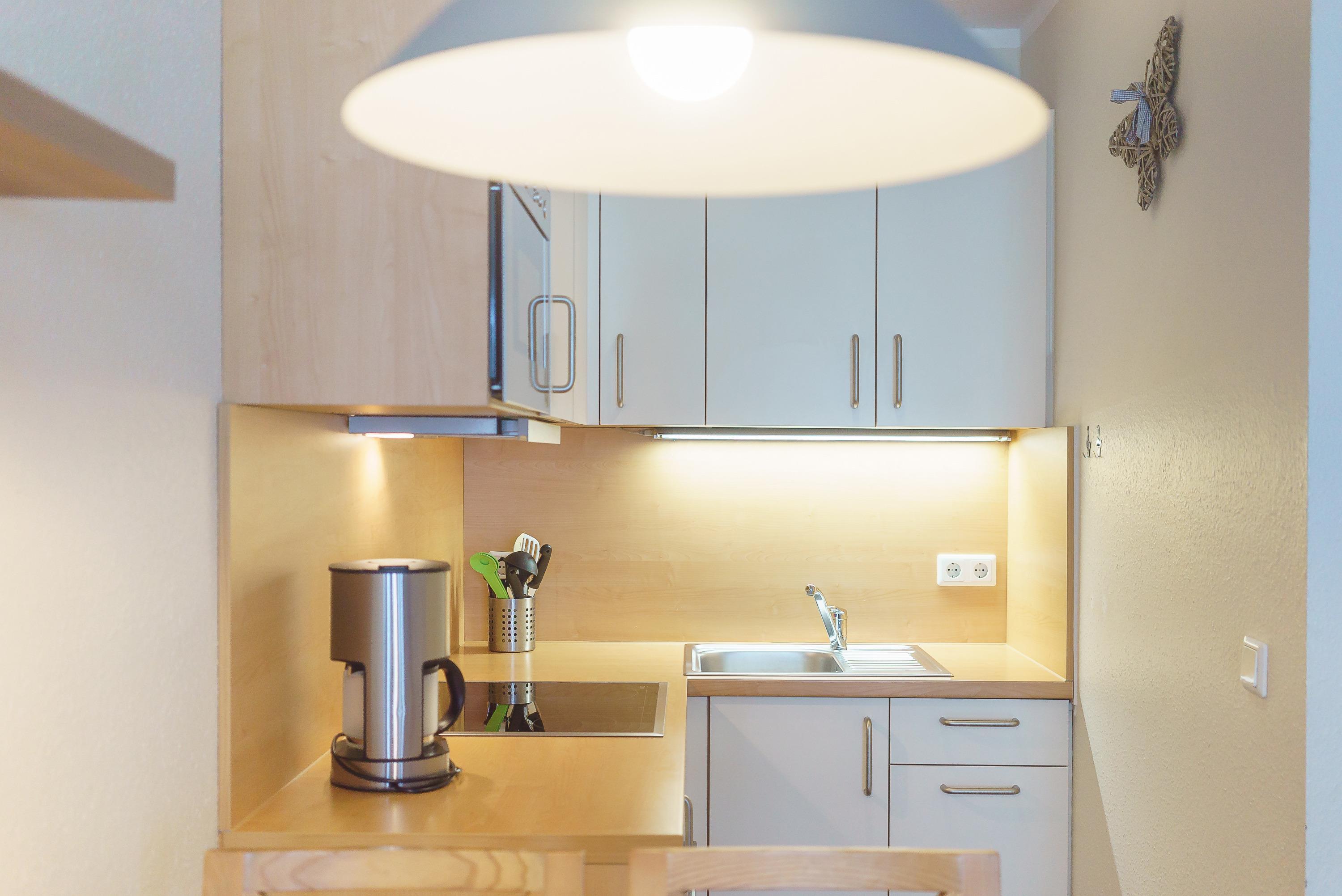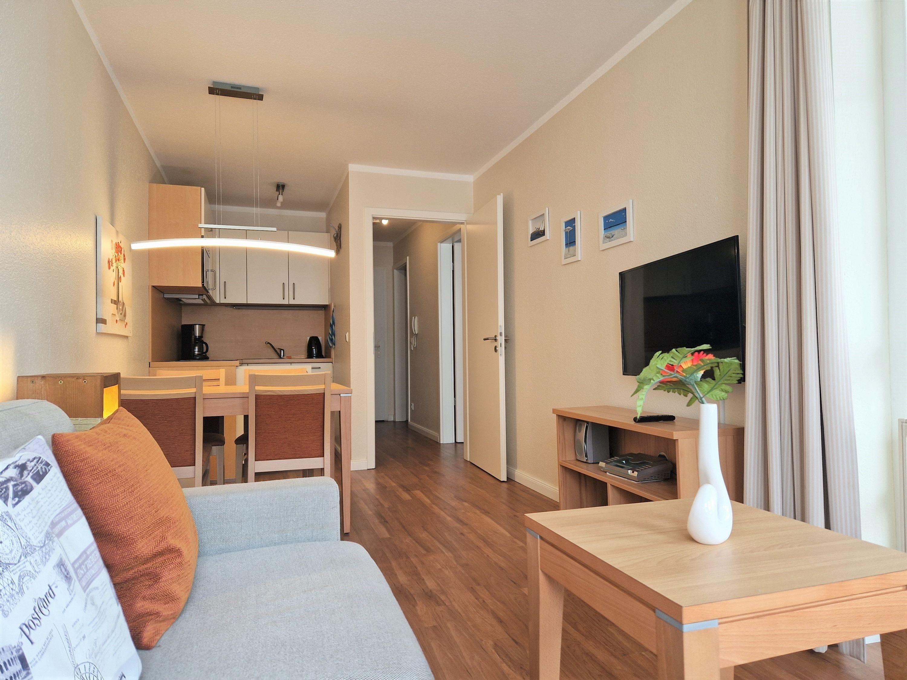 Die Ferienwohnung verfügt über kostenfreies WLAN und die Erstausstattung an Bettwäsche ist inklusive. Das Schlafzimmer mit Verdunklung verfügt über ein Doppelbett, im Wohnzimmer befindet sich zusätzlich eine Doppelschlafcouch. Darüber hinaus verfügt die Ferienwohnung über ein Bad mit Dusche/WC. Die voll ausgestattete, offene Küche mit Mikrowelle, Geschirrspüler, Kaffeemaschine und Toaster lässt keine Wünsche offen. Ein Fernseher inkl. 3 Sky-Sender rundet die Einrichtung ab.