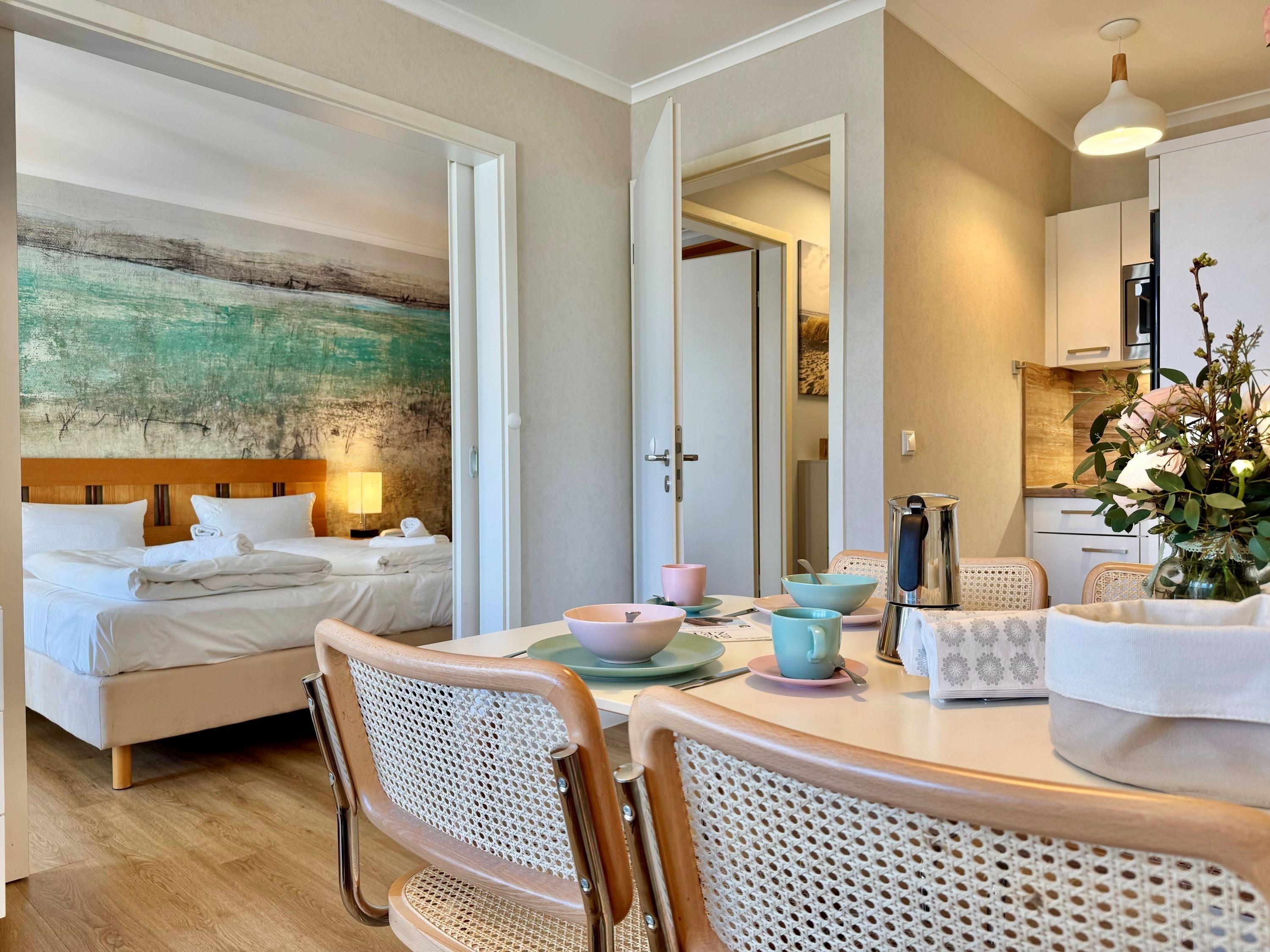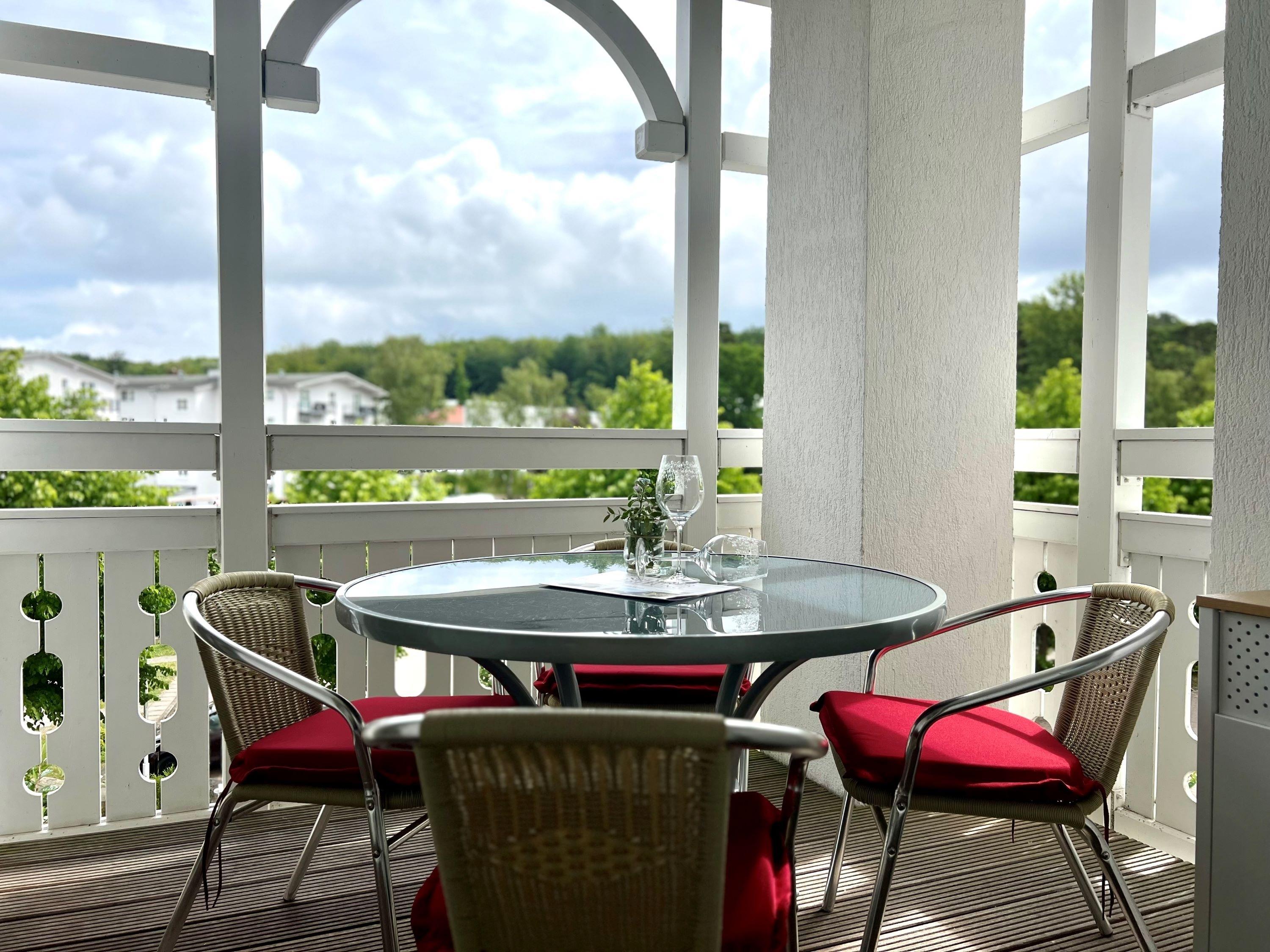 Nach einem erlebnisreichen Urlaubstag können Sie auf dem Balkon in Nordostlage Platz nehmen. Der Ausblick und die Sitzgruppe sorgen hier für ein wunderbares Urlaubsgefühl. Im Nichtraucher-Apartment sind keine Haustiere gestattet.
