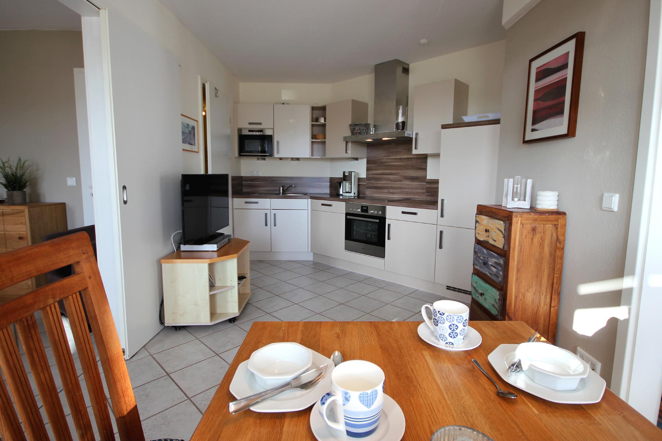 Die attraktive gut ausgestattete Wohnküche mit Cerankochfeld, Backofen, Mikrowelle, Kühl-/Gefrierkombination, Geschirrspüler, Kaffeemaschine, Wasserkocher, Toaster sowie diversen anderen Küchenhelfern lädt zum Kochen und gemeinsamen Essen ein.