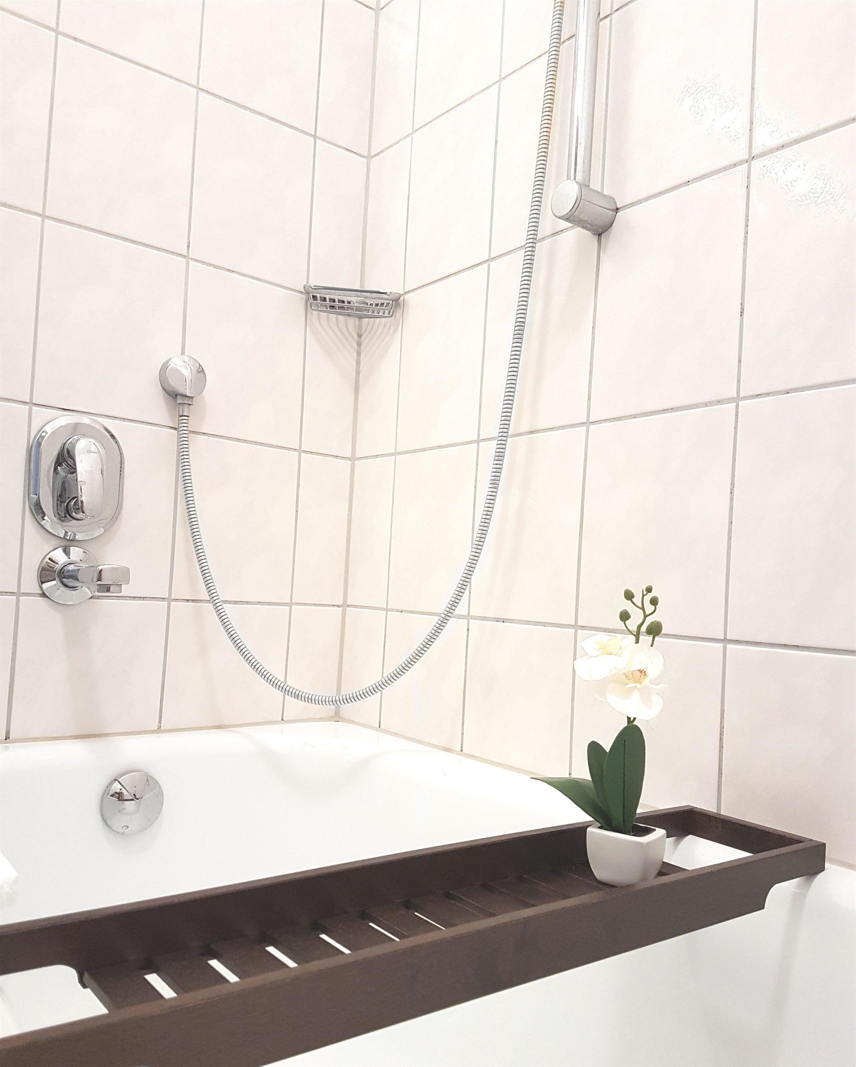 Das Bad besteht aus einer Badewanne mit Dusche und einer Waschmöglichkeit mit Spiegel und Föhn.