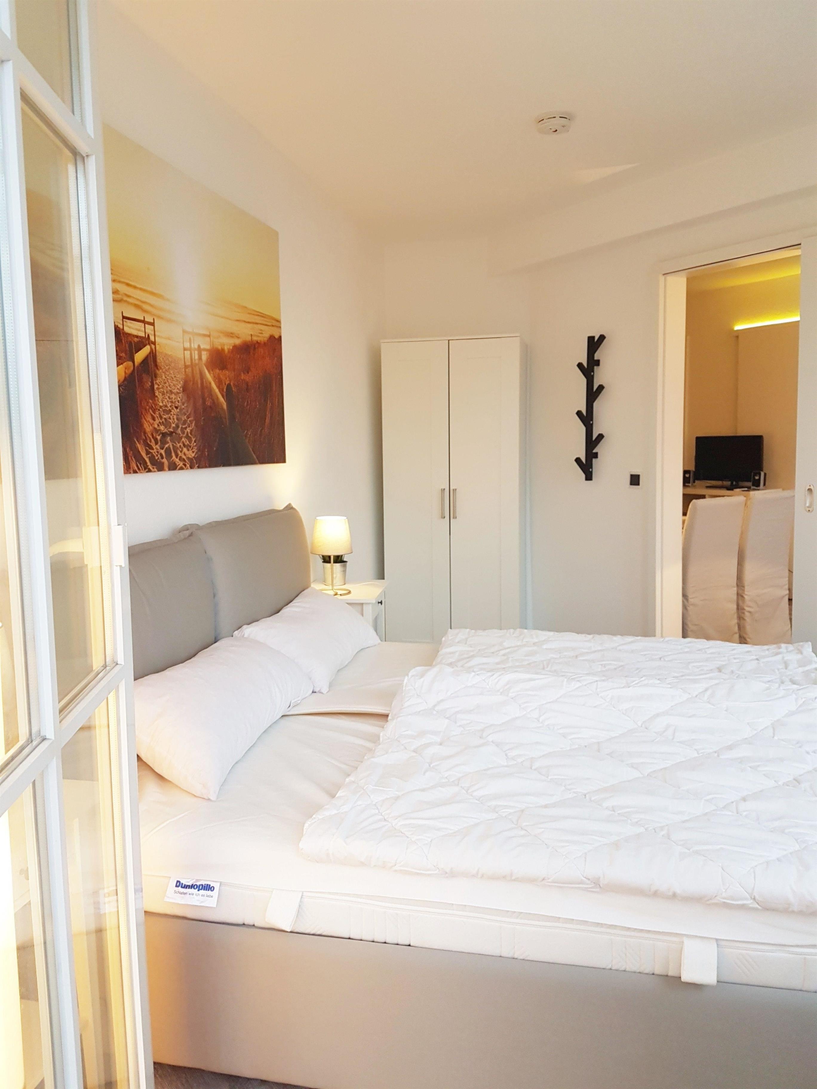 Das freundliche Schlafzimmer mit bodentiefen Fenstern lässt nach dem Aufziehen der Vorhänge direkt die ersten Sonnenstrahlen des Tages hinein. Das Schlafzimmer hat einen separaten eigenen Balkon.