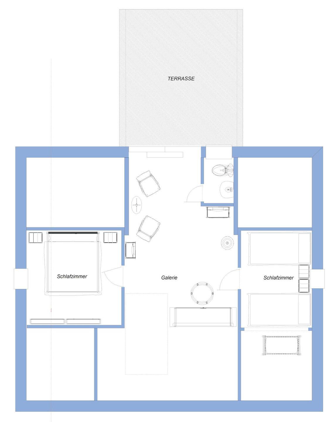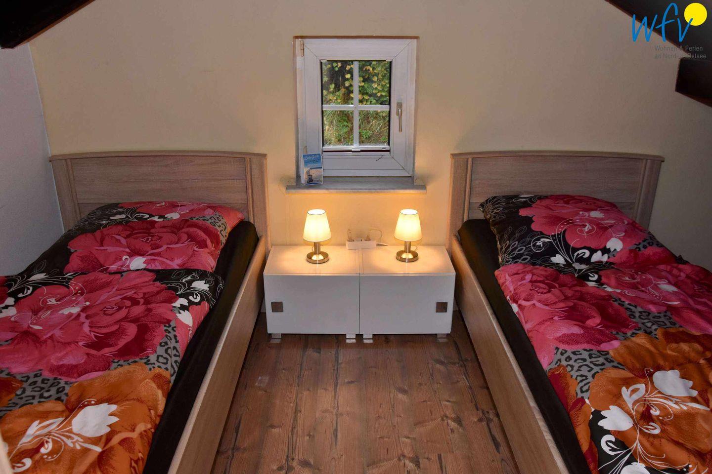 Im Dachgeschoss des Ferienhauses erreichen Sie durch einen lichtdurchfluteten Wohnraum mit Glasdach die zwei separaten Schlafzimmer mit einem Doppelbett bzw. 2 Einzelbetten sowie das zweite WC des Hauses.