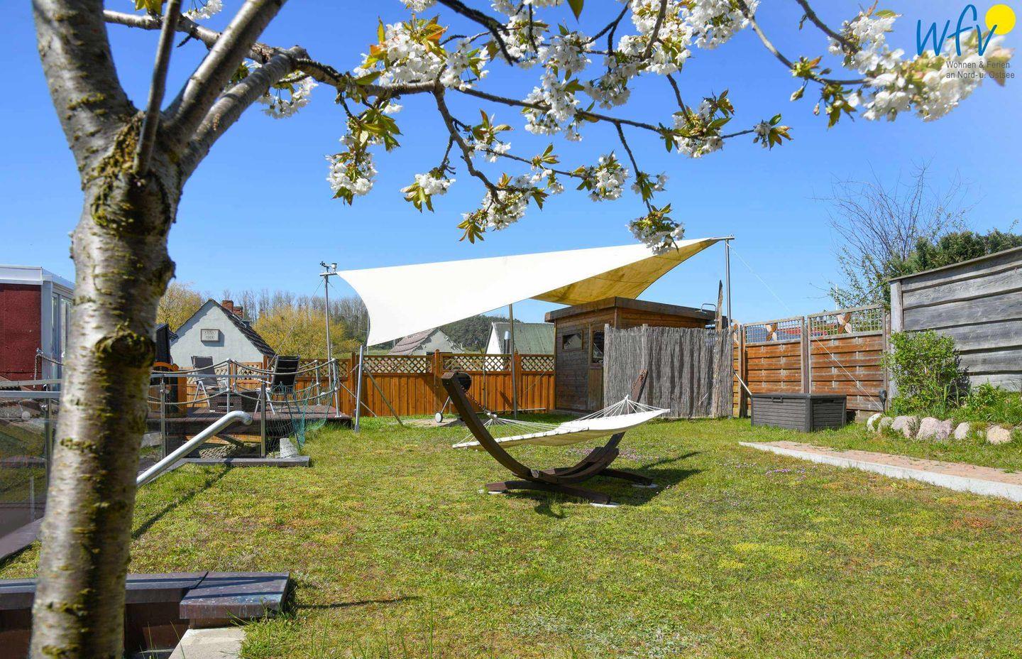 Garten: Gartengrill, Hängematte, Tisch und Stühle, Sonnensegel, Strandkorb