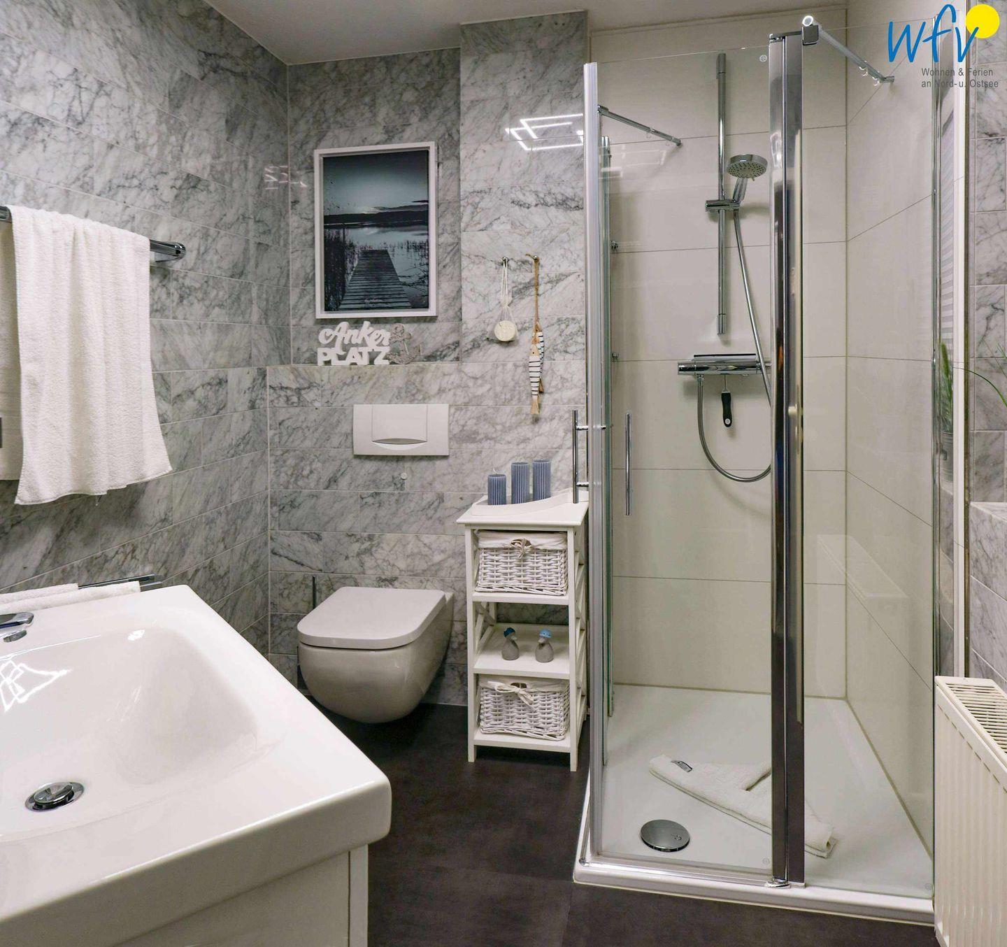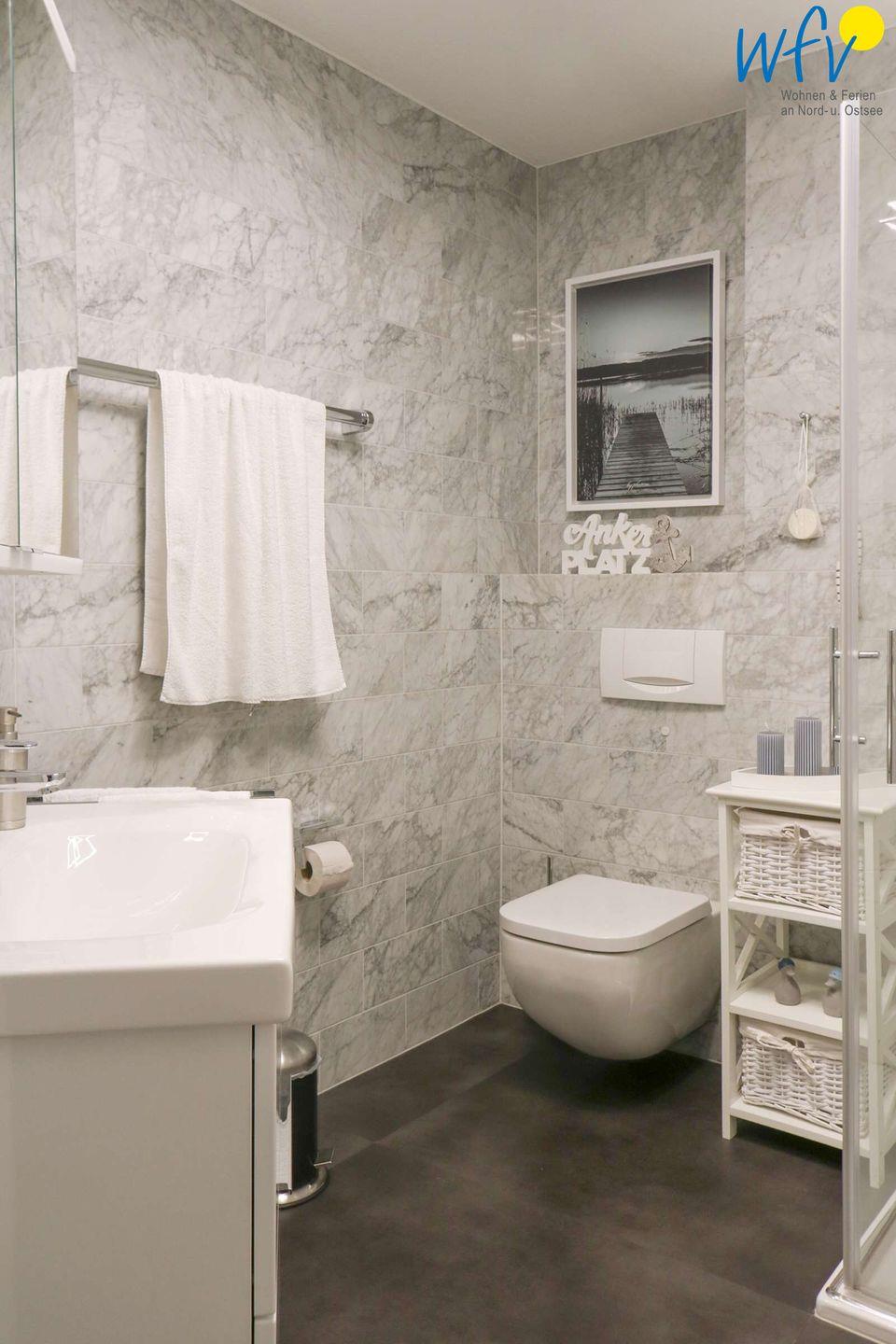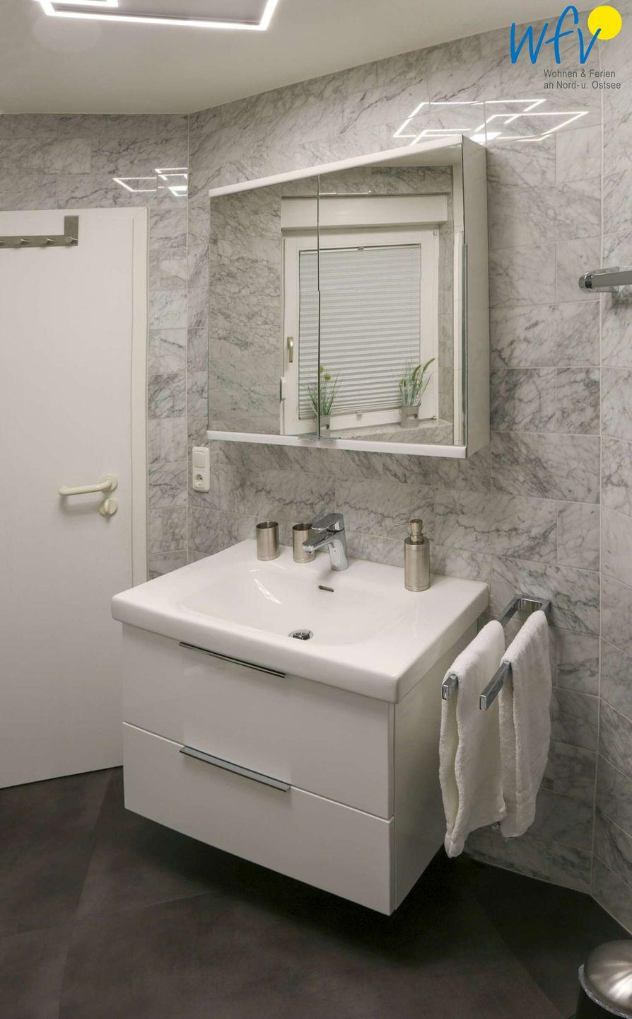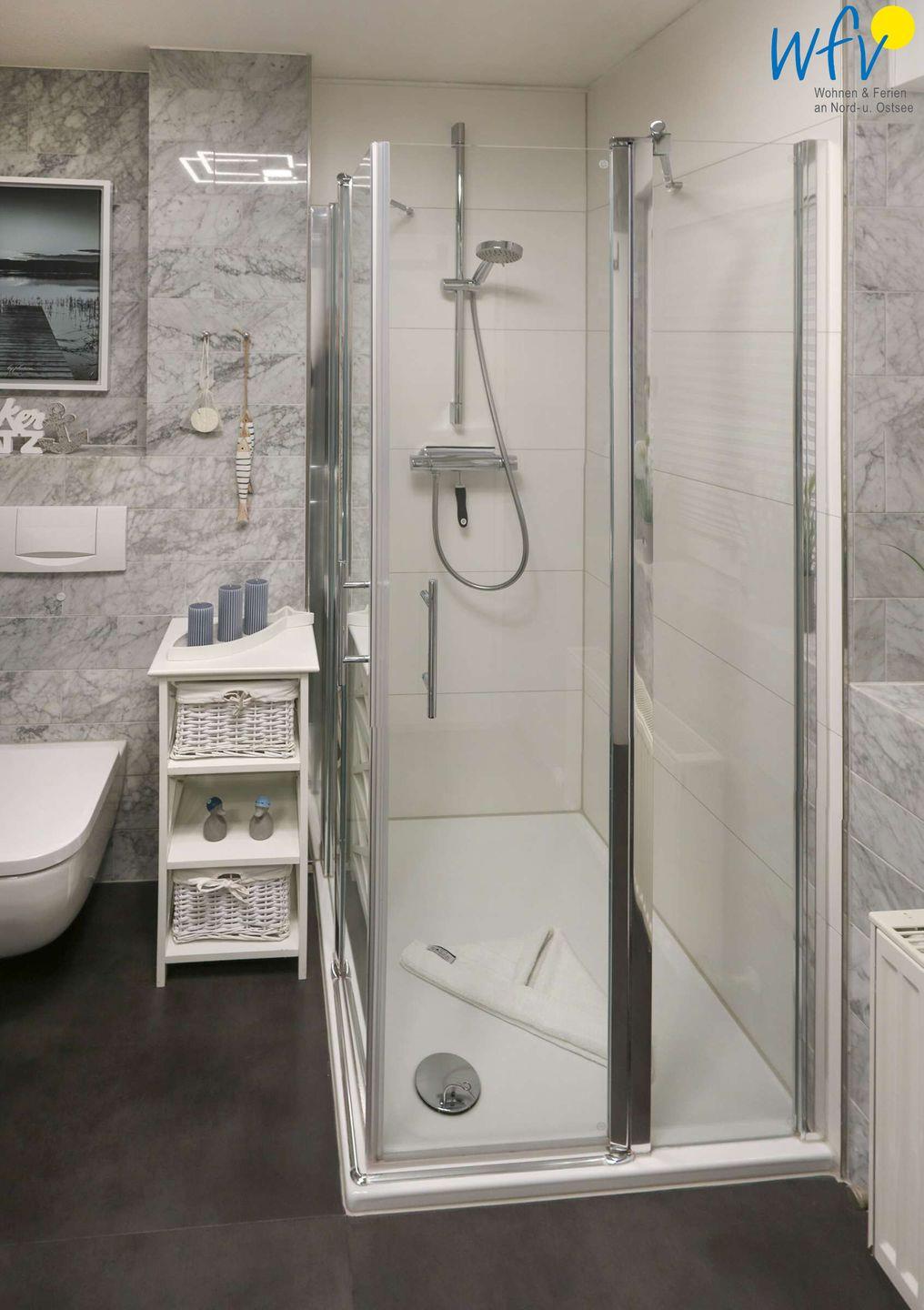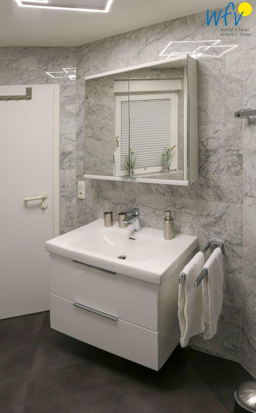 Das Badezimmer mit Dusche ist klar und elegant gehalten. Stilvolles Design macht auch diesen Raum zu einem Wohlfühlort.