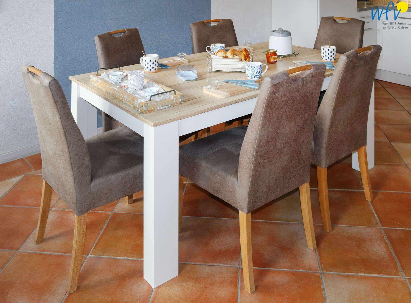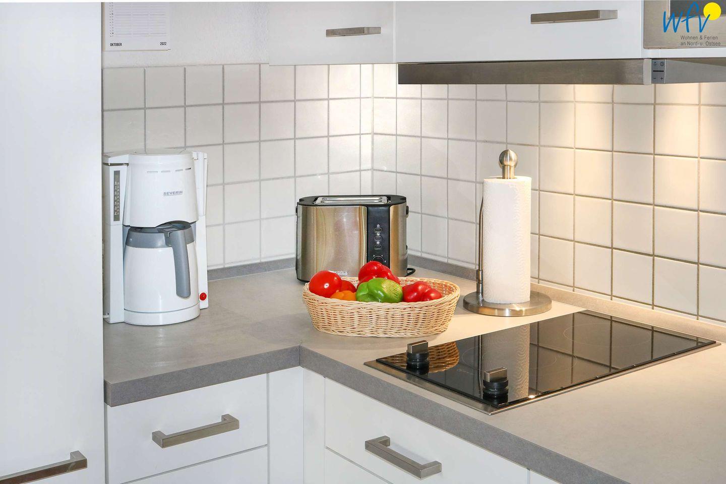 In dem hellen und offenen Wohnbereich mit kompletter Einbauküche (2-Platten-Herd, Mikrowelle, Spülmaschine, Padautomat etc.) und großem Esstisch sowie zwei Sofas, modernem TV (107 cm), Radio und CD-Player lassen sich entspannte Urlaubstage verbringen.
