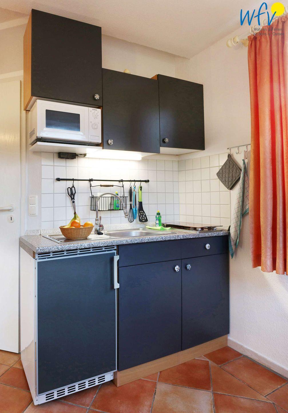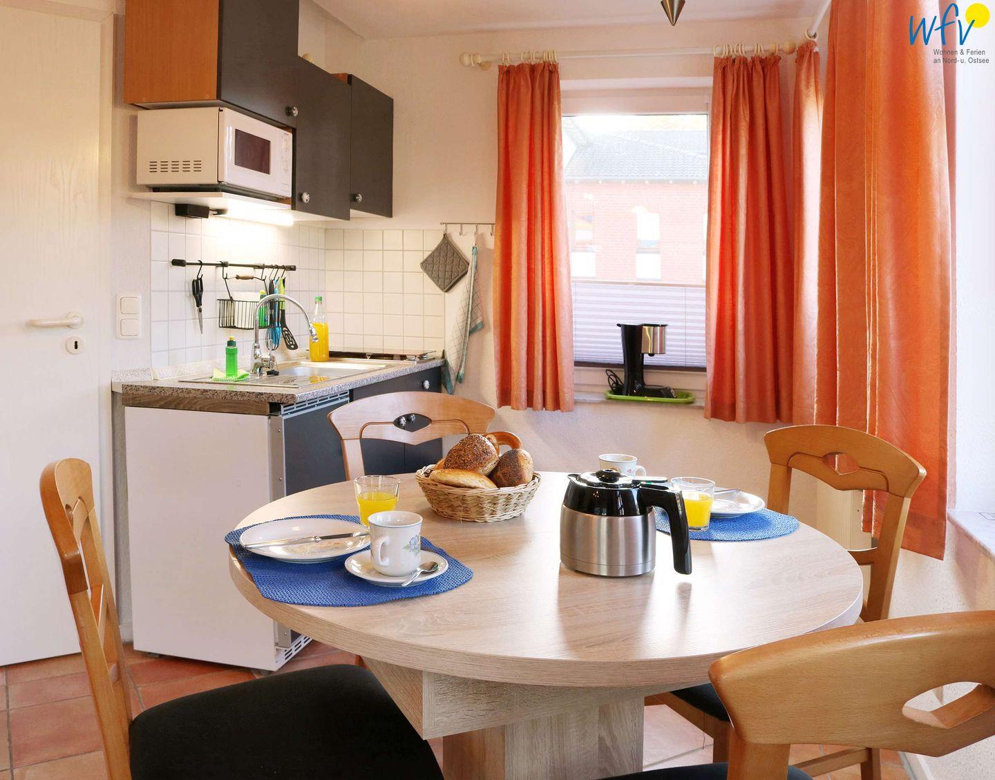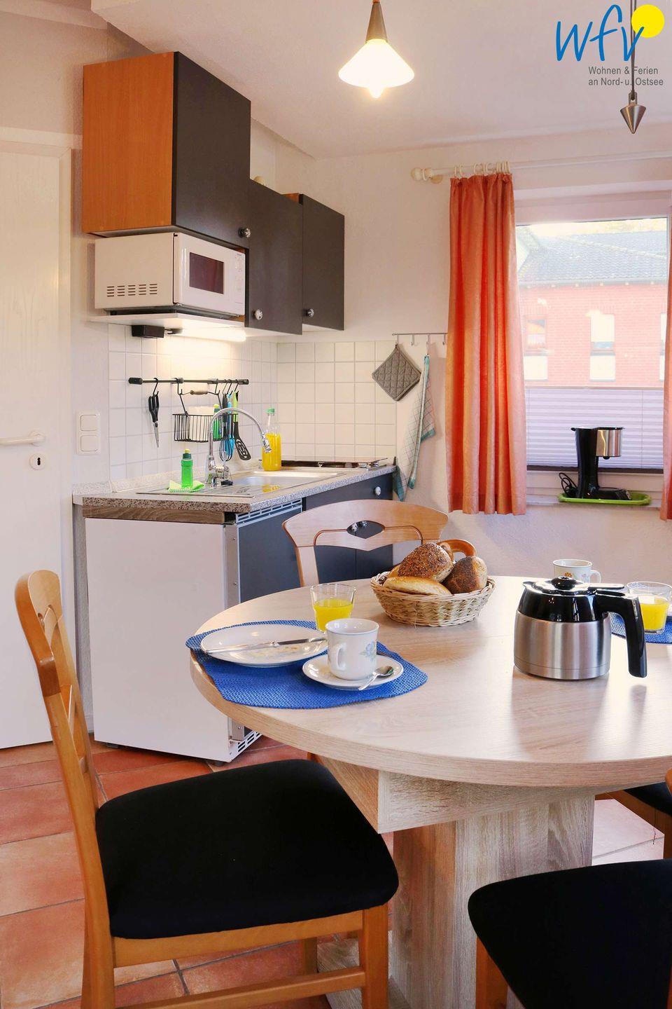 Für warme Frühstückseier, den Snack zwischendurch oder das leckere Abendessen ist die moderne Küchenzeile der Ferienwohnung bestens ausgestattet. Ein Zwei-Plattenherd und eine Mikrowelle sowie alle nötigen Küchenutensilien machen die Selbstverpflegung zum Kinderspiel.
