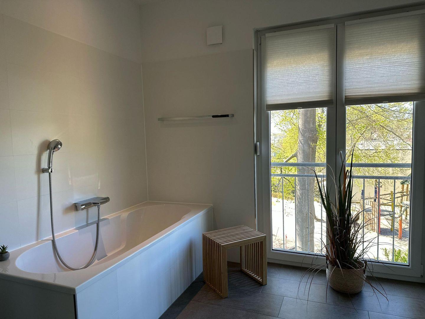 Der Ausblick von der Wohnung geht ins Grüne und auf den örtlichen Kindergartenspielplatz.