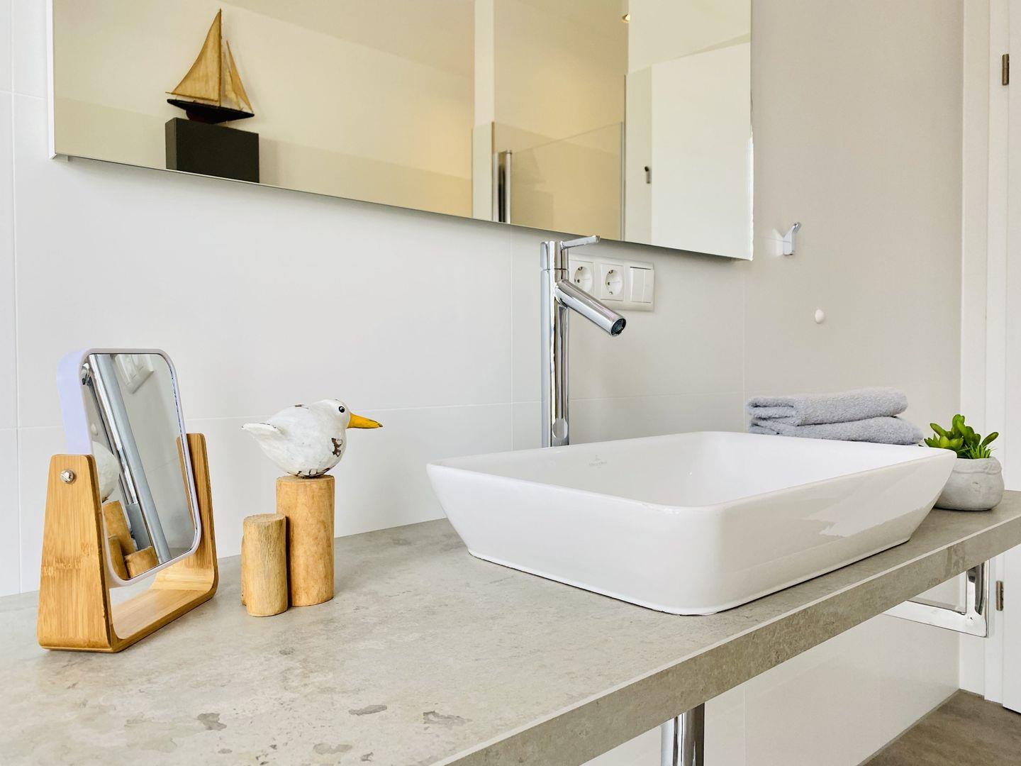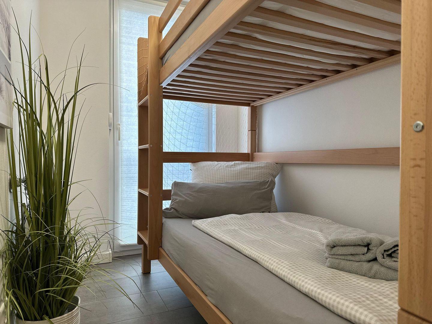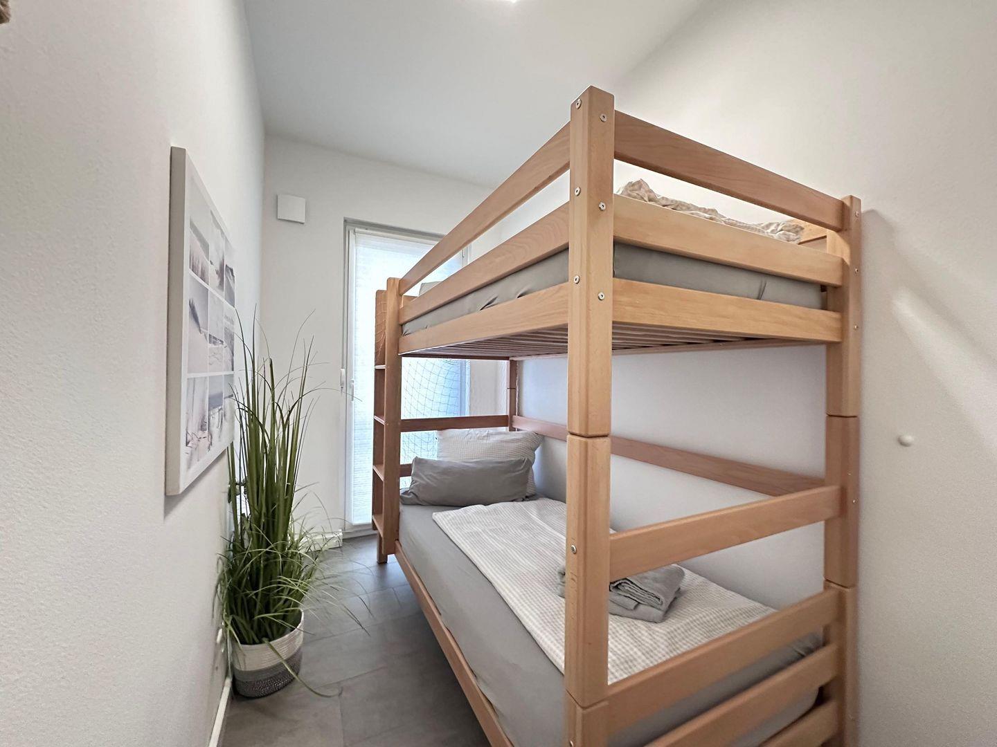 Zur Wohnung gehört eine gepflasterte Terrasse hinter dem Haus mit Windschutz, Grill und Gartenmöbeln, ideal für gemütliche Abende im Freien. Die Wohnung ist nur über eine Außen-Treppe am Haus erreichbar, da diese im Obergeschoss liegt. In der vollausgestatteten Küchenzeile mit Ceranfeld, Geschirrspülmaschine, Backofen, Kühlschrank (mit Gefrierfach), Dunstabzugshaube, Mikrowelle, Wasserkocher, Kaffeemaschine und Toaster finden Sie alles, was Sie für die Zubereitung köstlicher Mahlzeiten benötigen. Das Badezimmer ist mit einer Dusche, einem Waschtisch, einem Handtuchtrockner, einem Fön und einem WC ausgestattet. Zwei Schlafzimmer mit TV, Kleiderschrank und großem Boxspringbett sorgen für erholsame Nächte und sind verdunkelbar. Das 3. Schlafzimmer verfügt über ein Doppelstockbett.