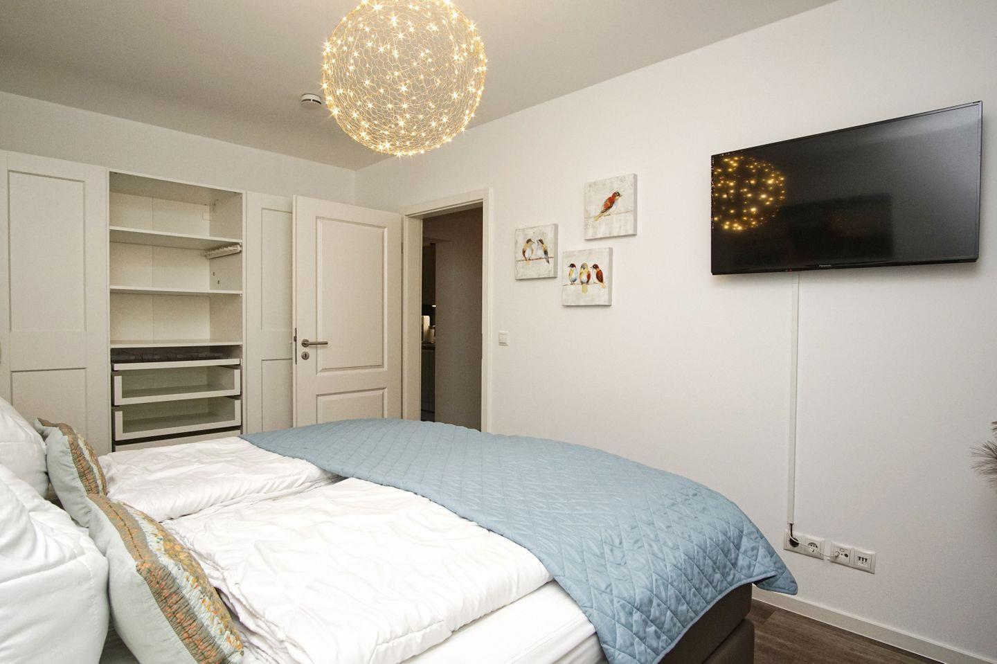 SCHLAFEN // ein Schlafzimmer mit bequemem Doppelbettbett und Flachbild-TV, Couch mit Schlaffunktion im Wohnzimmer ++