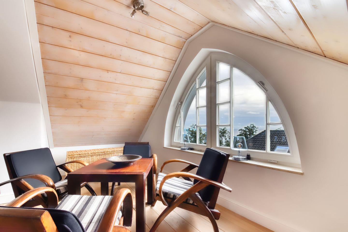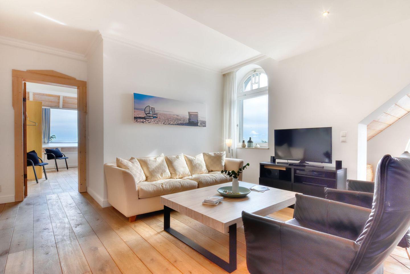 Zu entspannten Abenden lädt das Wohnzimmer mit einer gemütlichen Sitz- und Fernsehecke, Kaminofen und einem Erker im neugotischen Stil ein. Von hier aus haben Sie eine gute Sicht auf die berühmte Selliner Seebrücke. Genießen Sie außerdem die kostenfreie Nutzung des hauseigenen Wellness-Bereiches, der mit Dampf-, Infrarot und finnischer Sauna sowie einem schönen Liegebereich Entspannung pur verspricht.