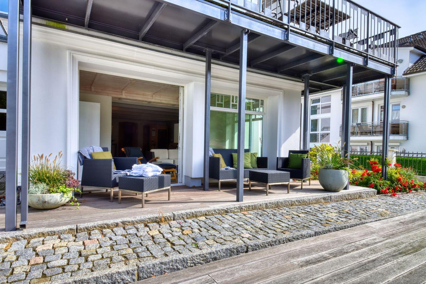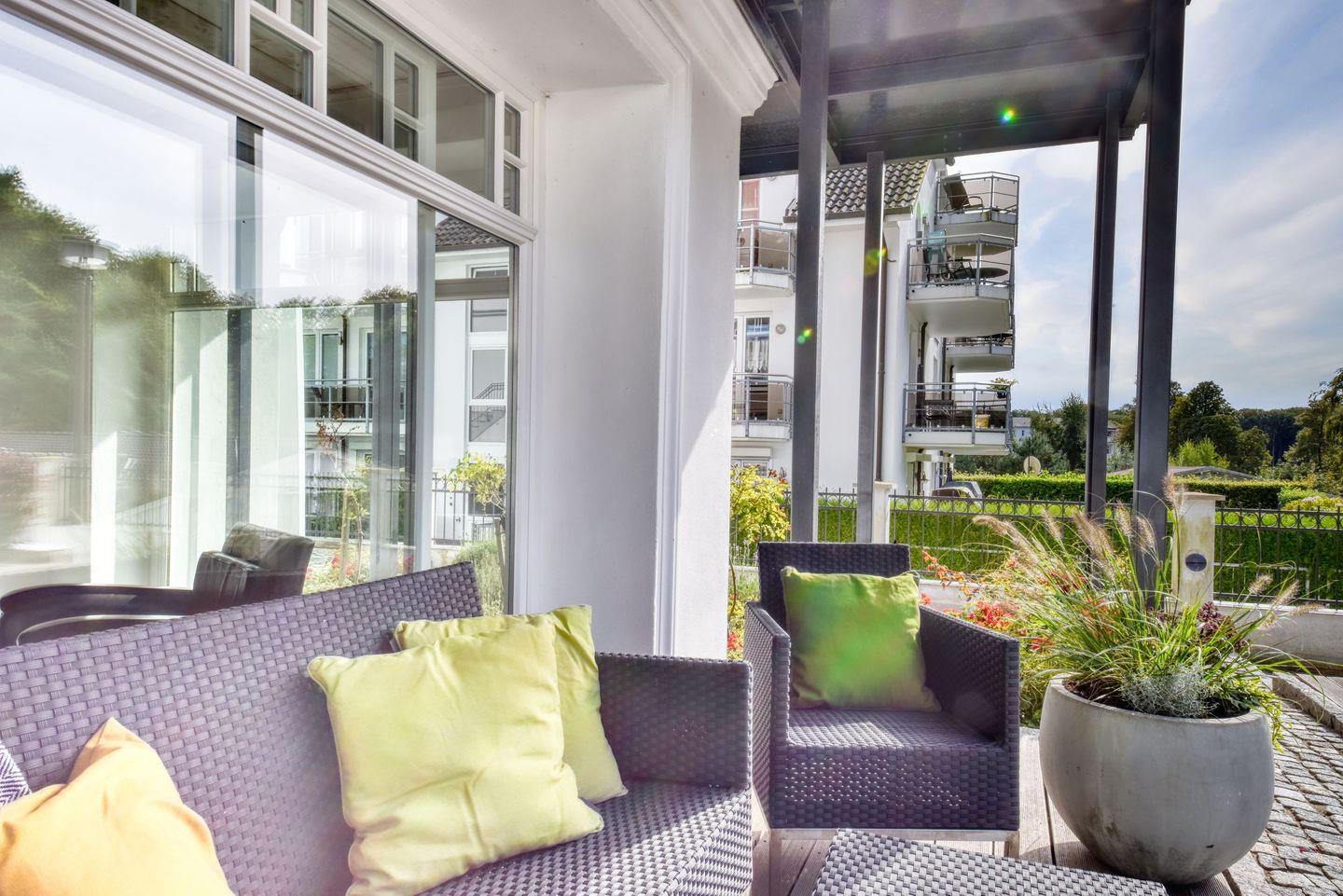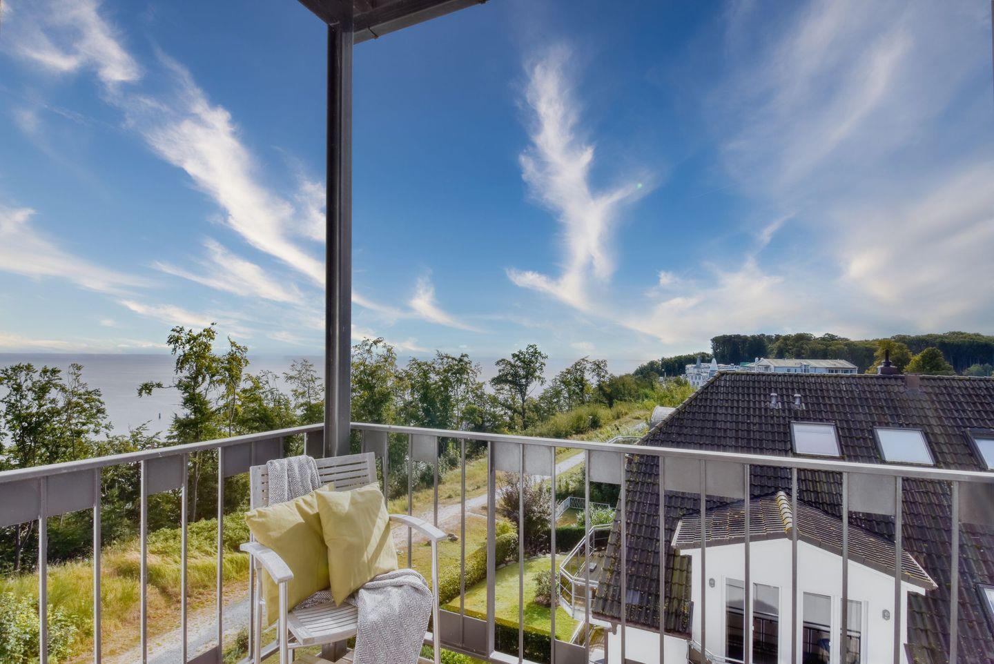 Exklusive Ferienwohnung Bernstein in Sellin mit Meerblick, Sauna, Kamin und drei Balkonen für erholsame Tage an der Ostsee.