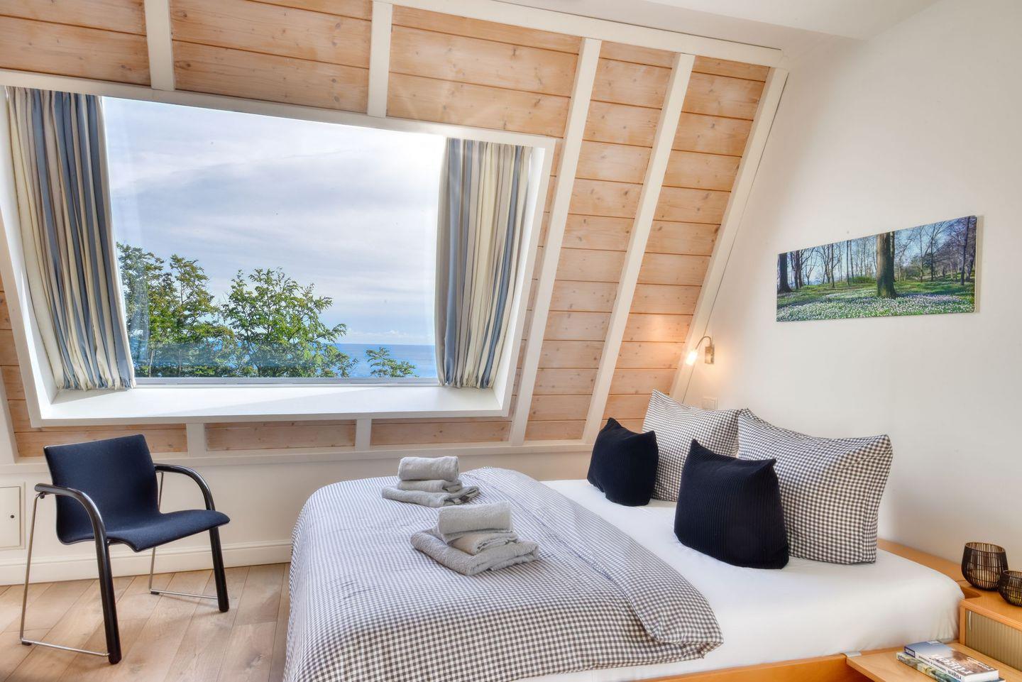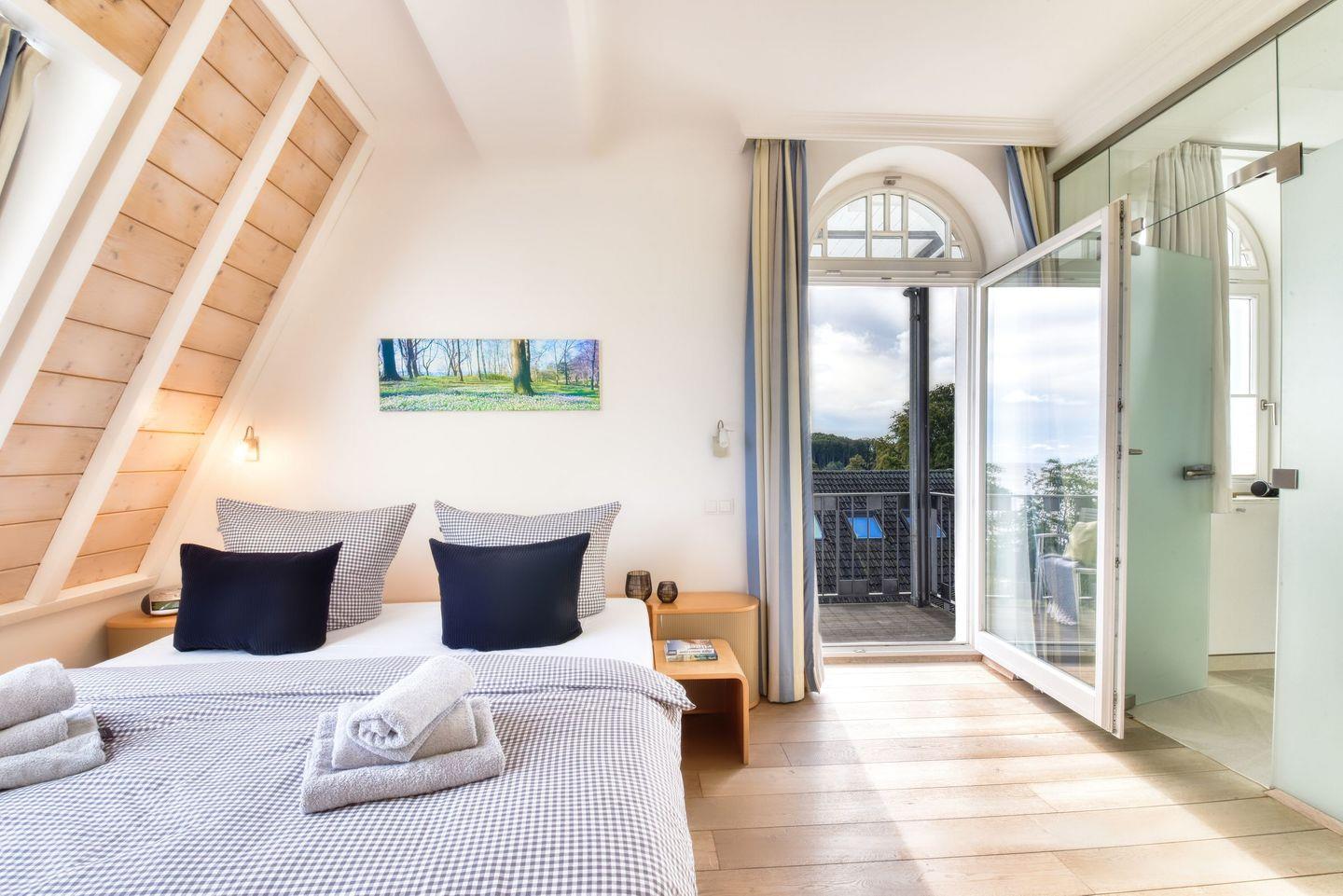Die Wohnung verfügt über zwei stilvoll eingerichtete Schlafzimmer – ein Senior- und ein Juniorzimmer, mit jeweils eigenem Balkon, auf dem Sie morgens das Meer begrüßen und bei frischer Ostseeluft tief durchatmen können. Das große Panoramafenster im Senior-Schlafzimmer schafft eine besonders luxuriöse Atmosphäre und bietet eine atemberaubende Perspektive auf das Meer. Ein stilvolles Ensuite-Badezimmer schließt jeweils an die beiden Schlafzimmer an, ausgestattet mit ebenerdigen Duschen und modernen WC-Anlagen.