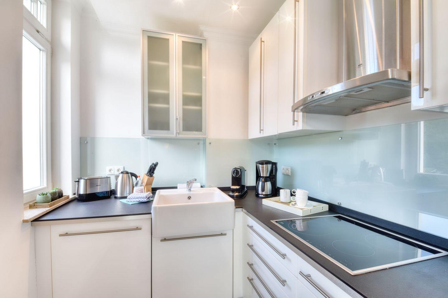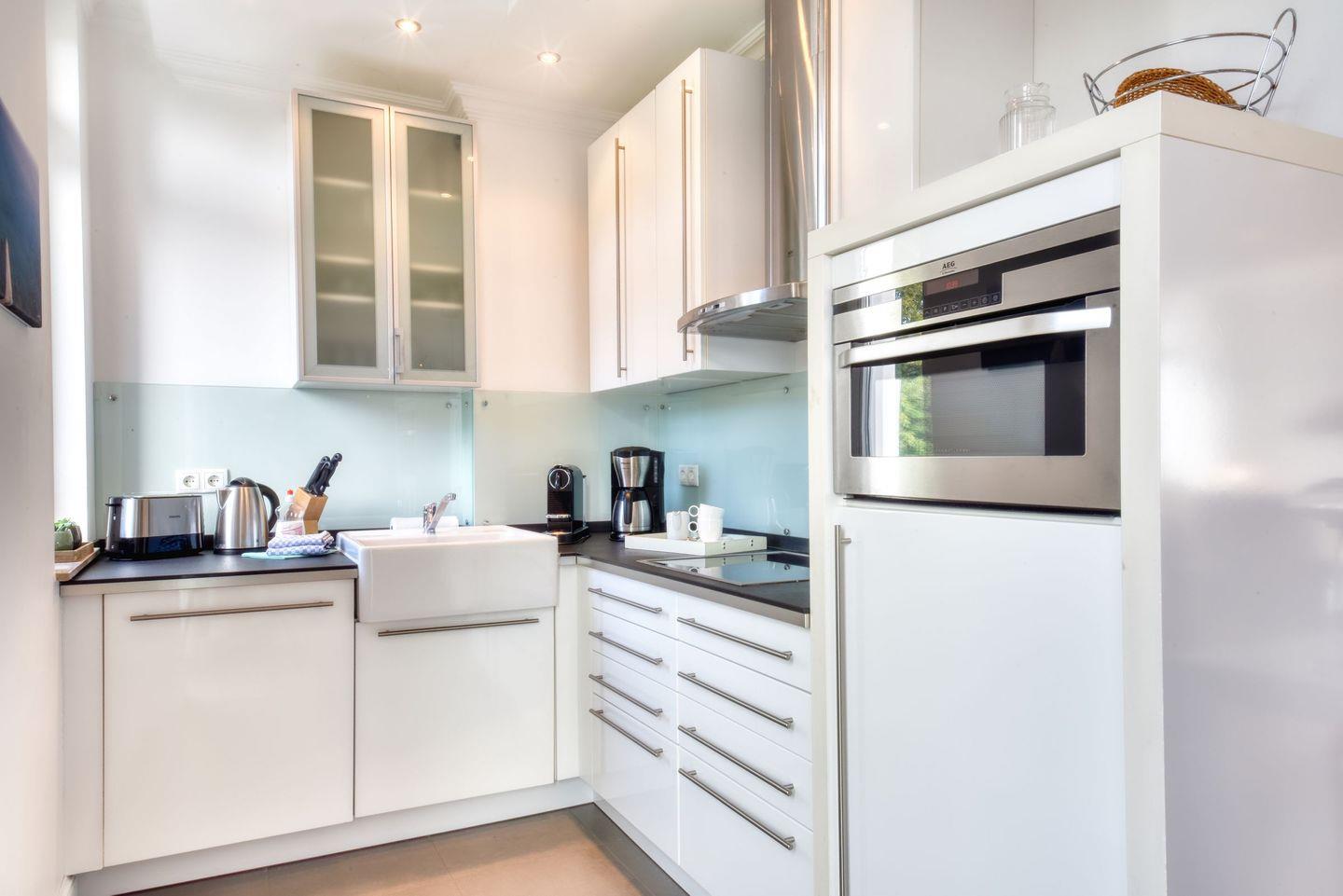 Auch die voll ausgestattete Küche lässt keine Wünsche offen und verfügt über einen E-Herd, eine Kombi-Mikrowelle mit Backofenfunktion, einen Geschirrspüler, sowie eine Kaffee- und eine Nespresso-Maschine für den perfekten Start in den Tag.