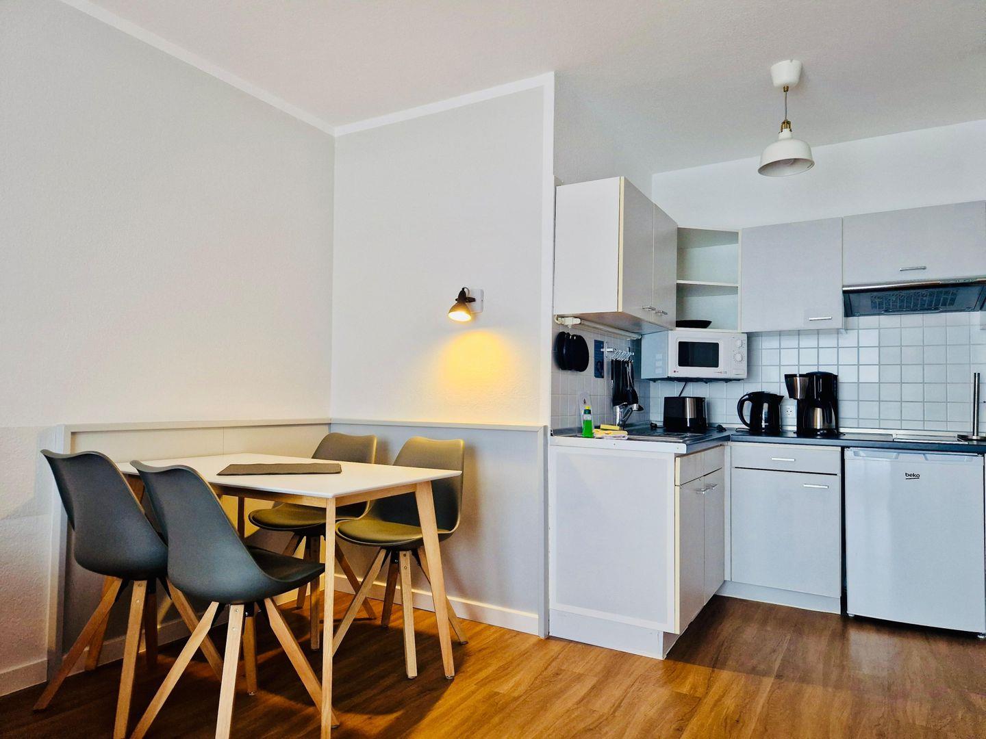 Die Ferienwohnung besteht aus einem gemütlichen Schlafzimmer, einem Wohnzimmer, einer voll ausgestatteten Küchenzeile mit Kühlschrank und Kaffeemaschine sowie einem Badezimmer mit Dusche.