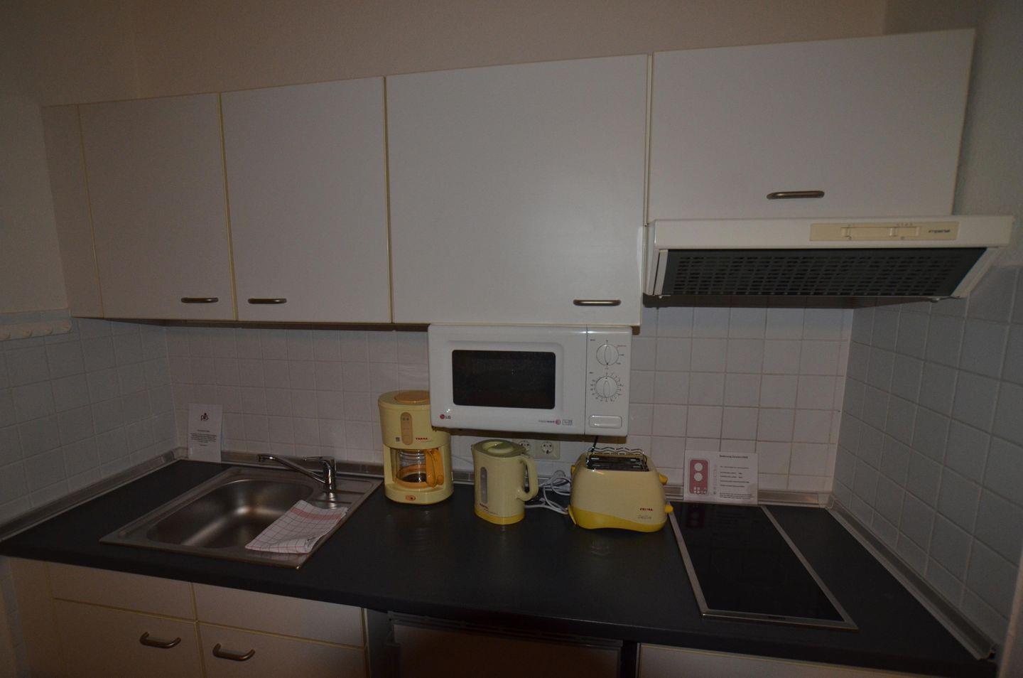 Die Wohnung verfügt über ein gemütliches Schlafzimmer, ein modernes Badezimmer, einen Flachbild-TV mit Kabelkanälen, einen Essbereich, eine voll ausgestattete Küche und einen Balkon mit Stadtblick.