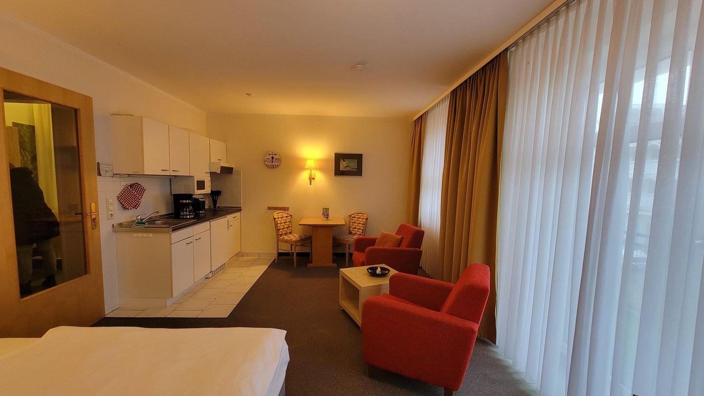 Die Wohnung umfasst einen Essbereich, ein Wohnzimmer mit Flachbild-TV und ein Badezimmer. Die warmen, heimeligen Innenräume schaffen eine gemütliche Atmosphäre.