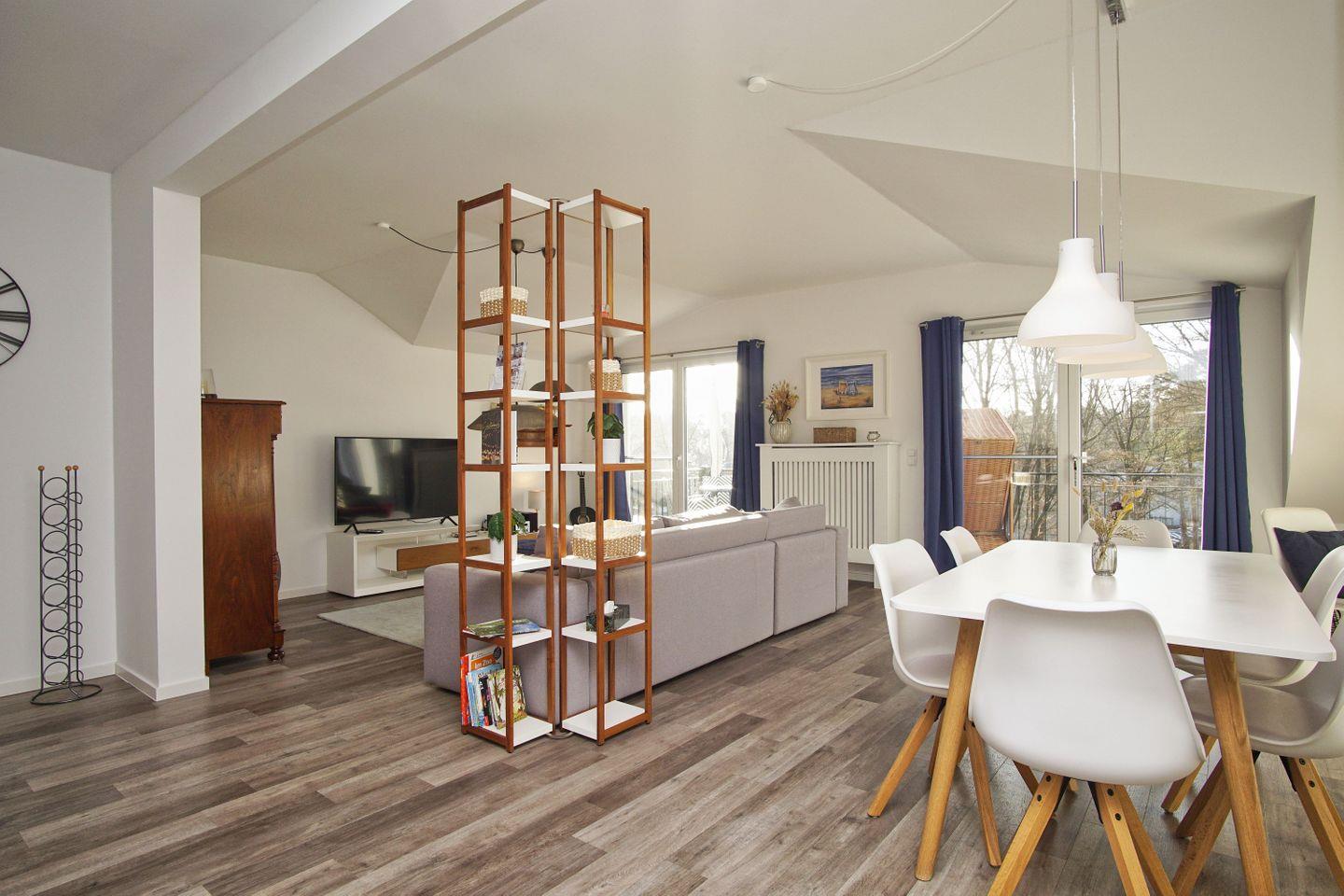 WOHNEN // Wohnraum mit bequemer Sofalandschaft, Smart-TV, Esstisch für 6 Personen, Schreibtisch, Balkon mit Essplatz und Strandkorb ++