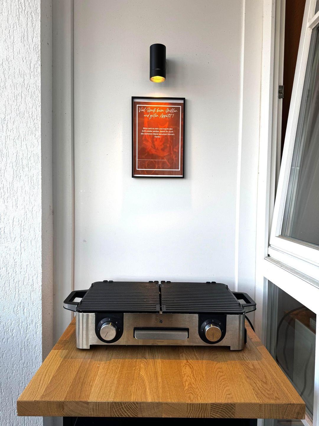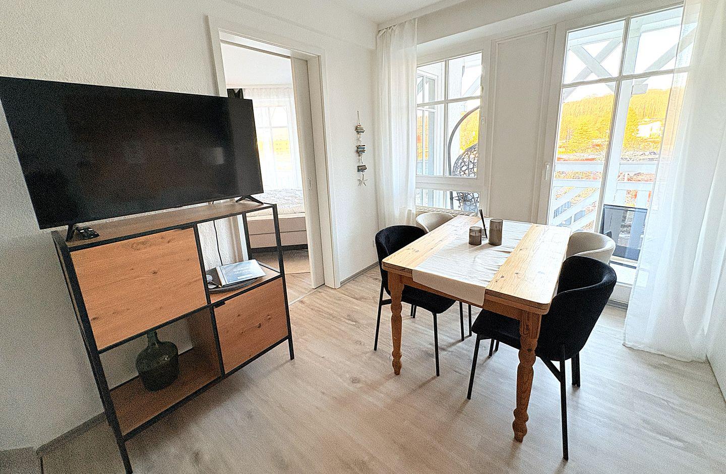 Der offene Wohn-Essbereich strahlt in frischem Weiß mit warmen Farbtönen. Die gemütliche Ecksofa-Einheit (mit Schlaffunktion für 2 Personen) lädt zum Entspannen ein, während der 43-Zoll Smart-TV für Filmabende bereitsteht. Vom Esstisch aus blicken Sie durch die große Glasfront direkt auf den großen Ostbalkon - hier können Sie morgens Kaffee mit Vogelgezwitscher oder abends ein Glas Rügener Bodden-Wein genießen. Tisch und Stühle stehen auf dem Balkon bereit, ergänzt durch einen Grill und einen Hängesessel zum Relaxen.