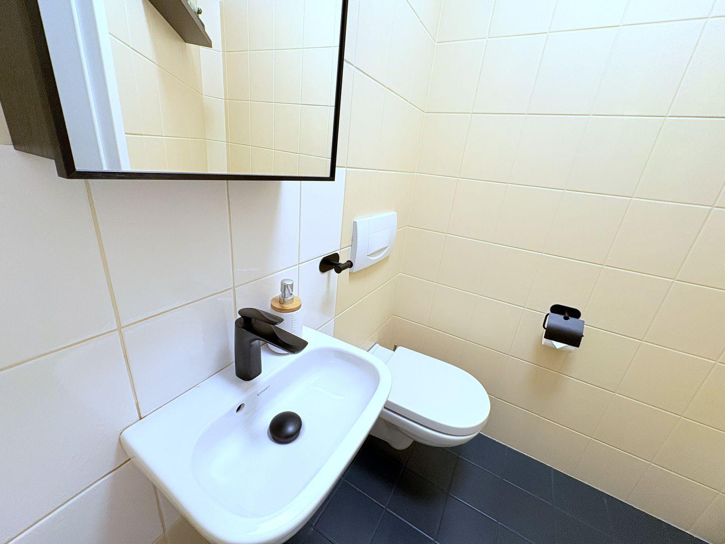 Getrenntes Badezimmer und WC, beide modern gefliest in warmem Sand-Beige: