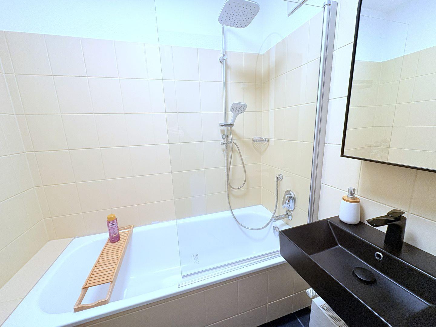 • Badezimmer: Regendusche mit Glasabtrennung, Spiegelschrank, Föhn, 1 Regal für Badutensilien