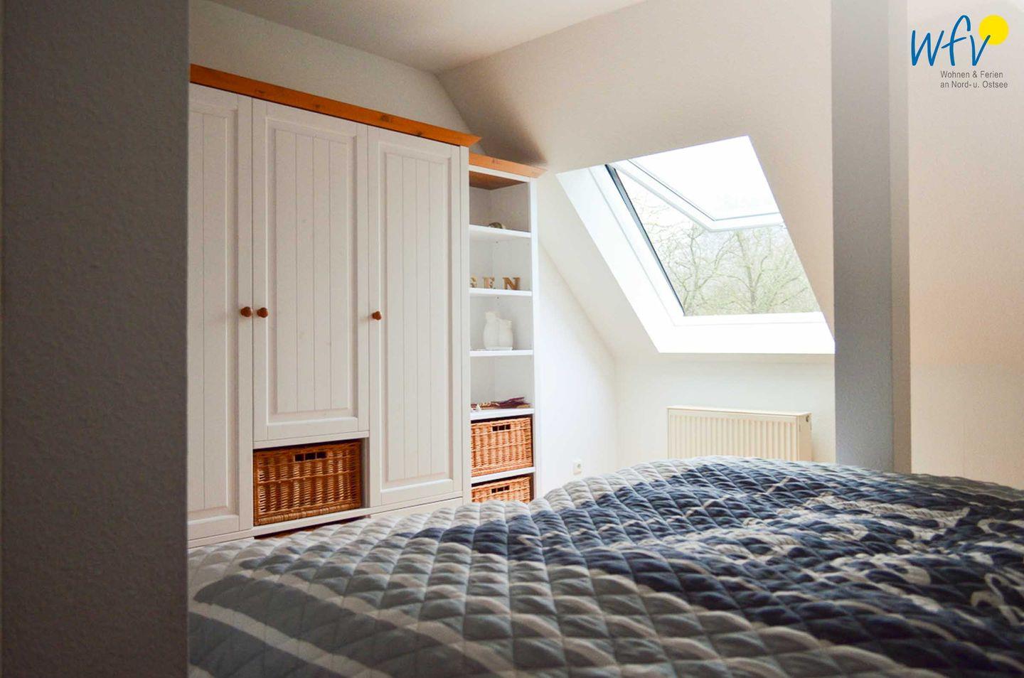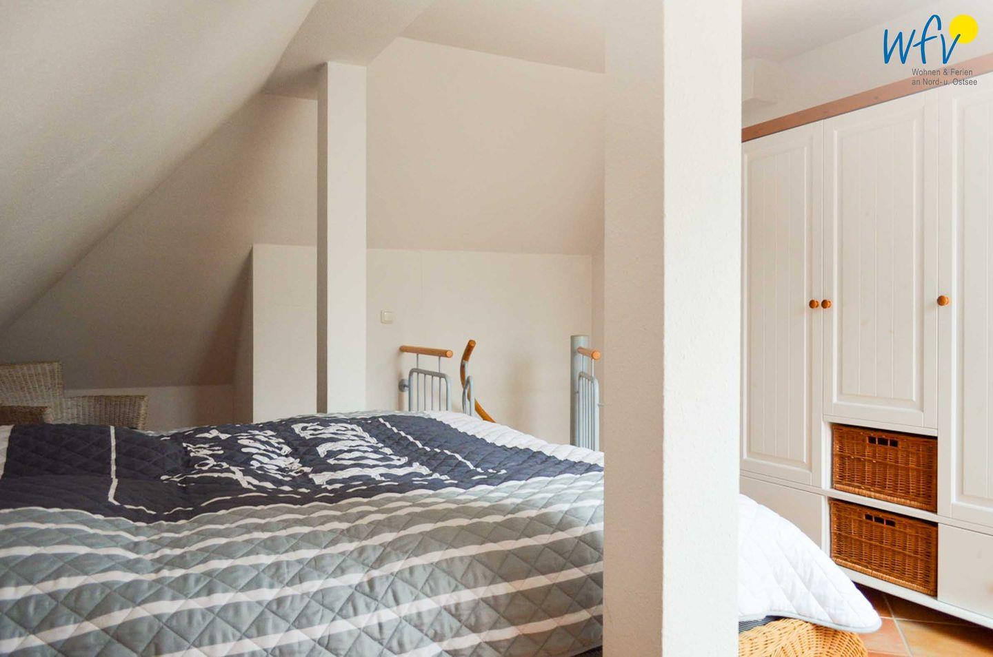 Das im Dachgeschoss gelegene Schlafzimmer verspricht mit einer freundlichen hellen Einrichtung und einem komfortablen Doppelbett (180 x 200 cm) eine angenehme Nachtruhe. Ein geräumiger Kleiderschrank bietet Ihnen Platz für die Urlaubsgarderobe.