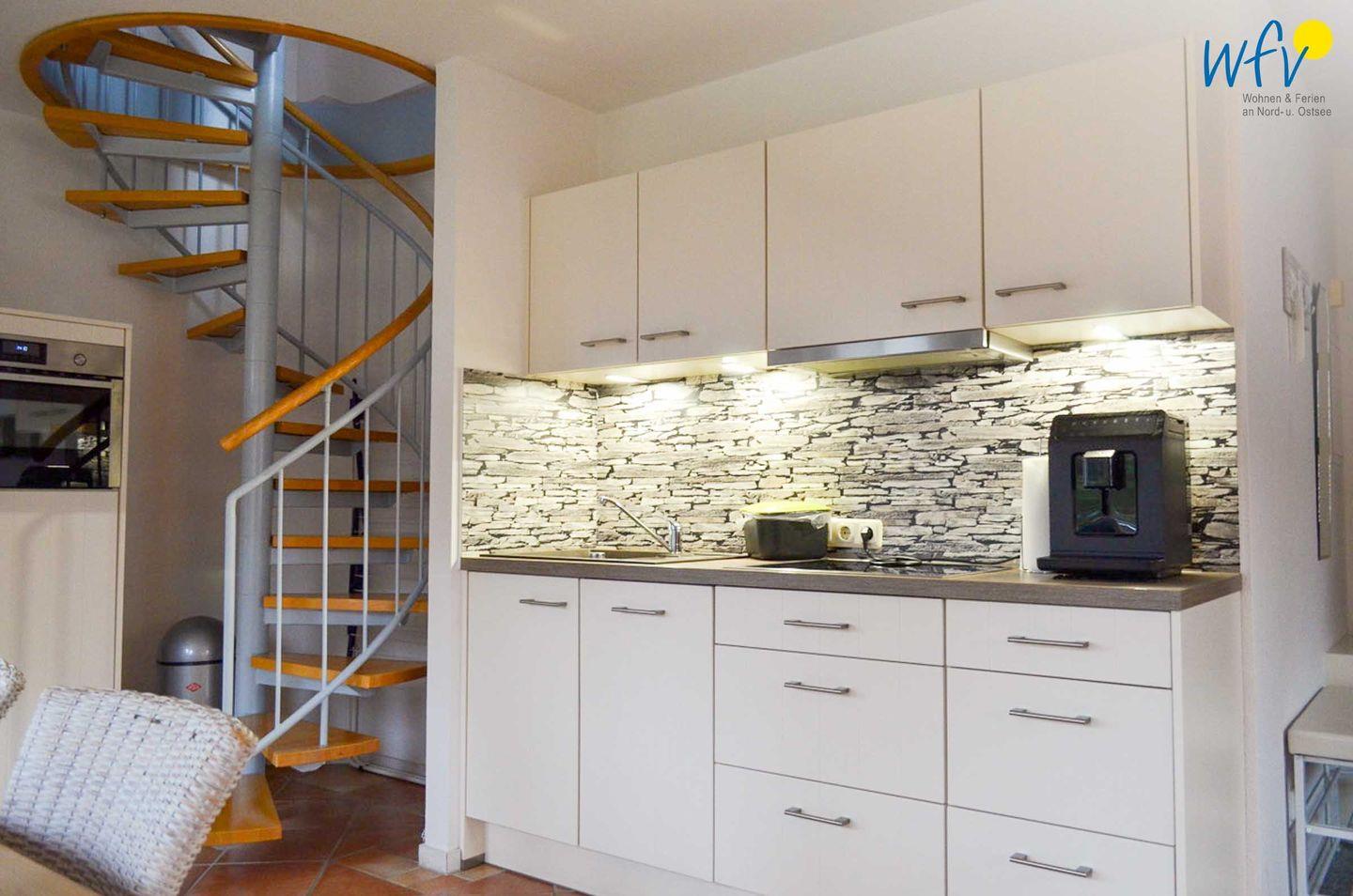 In der modernen offenen Küche lassen sich bequem kleine Snacks für den Ausflug oder leckere Mahlzeiten zubereiten. Ausgestattet ist die Küche u.a. mit 4-Plattenherd, Backofen, Mikrowelle, Geschirrspüler und Kühlschrank mit Gefrierfach sowie mit diversen Kleingeräten (Wasserkocher, Toaster, Mixer etc.). Als Kaffeeliebhaber genießen Sie den Komfort eines Kaffeevollautomaten mit Bohnen. Ein Esstisch lädt zu gemeinsamen Mahlzeiten ein. Zum Ausspannen steht eine gemütliche Couchecke mit TV, Radio und HiFi-Anlage bereit; WLAN und Internet sind ebenfalls vorhanden.
