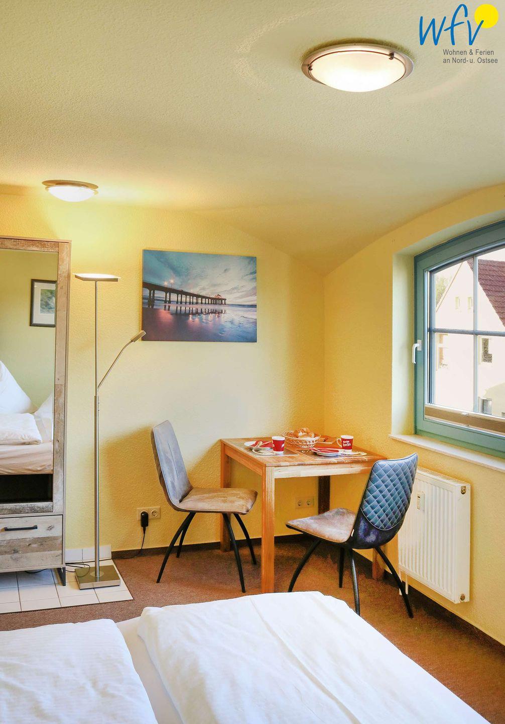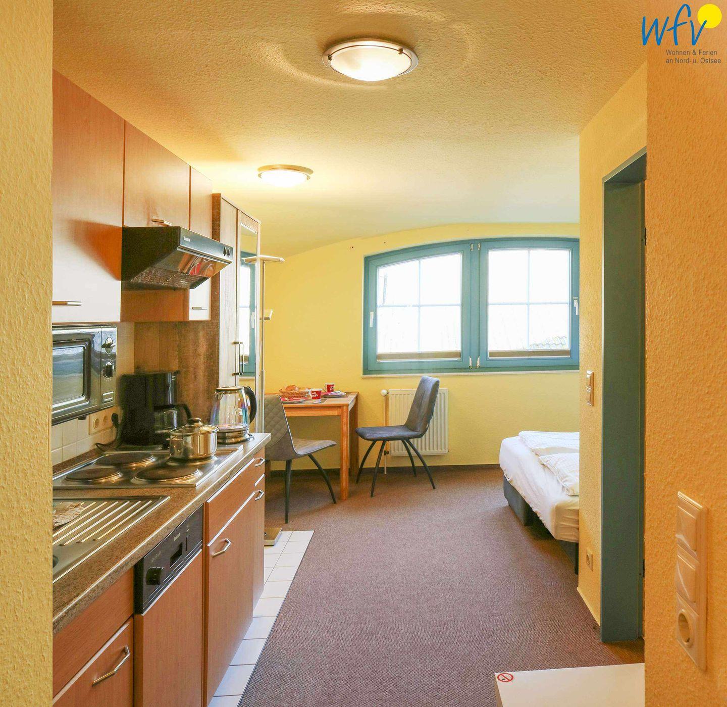 Die Anlage "Ferienappartements Am Neuensiener See" besteht aus 4 terrassenförmig angelegten Häusern mit jeweils nur 6 Wohnungen. Diese Rügener Ferienwohnung ist ideal für den Urlaub zu zweit. Es erwartet Sie ein kombinierter Wohn-/Schlafraum mit einem komfortablen Doppelbett (160 cm x 200 cm), TV, einem Esstisch mit zwei Stühlen und einer Küchenzeile sowie ein gepflegtes Duschbad. Der Esstisch befindet sich gegenüber vom Bett, sodass Sie von hier aus gemütlich TV schauen können. Vom Wohnzimmer aus blicken Sie Richtung Westen auf den Neuensiener See (eingeschränkt).