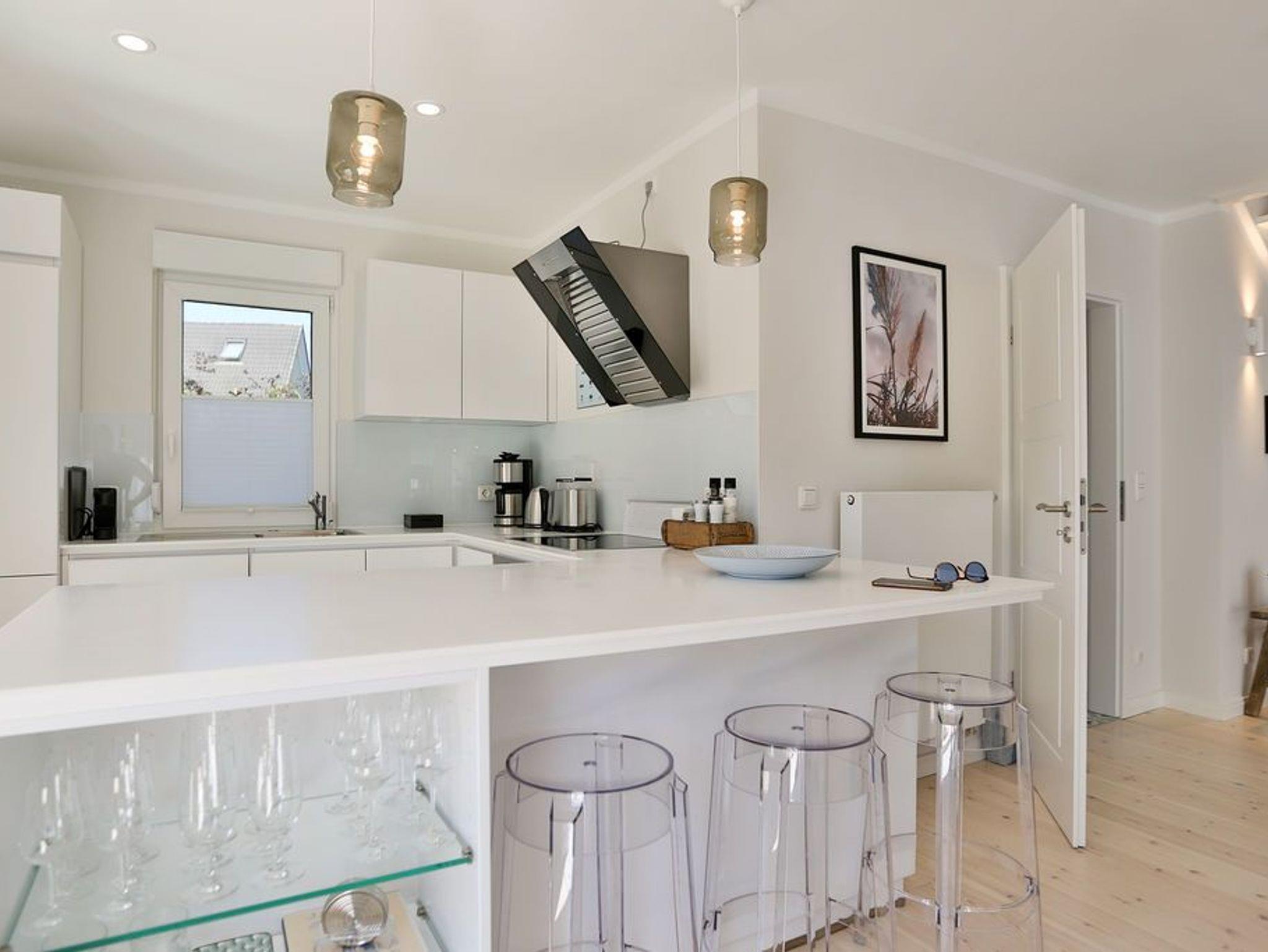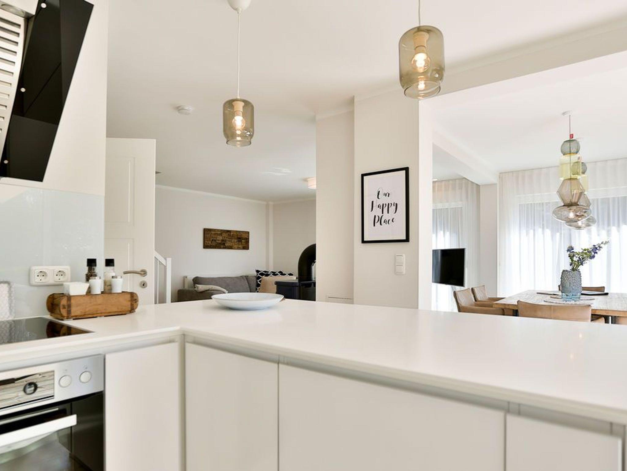 „Hygge“ - das ist der dänische Inbegriff für Idylle, für Gemütlichkeit, für Atmosphäre und Wohlgefühl. Ein stilvolles Ambiente ist ebenso Hygge wie das gemeinsame Zusammensein von Freunden oder der Familie, ein mit Liebe zubereitetes Essen ebenso wie die kleinen Details, die ein Haus heimelig machen - eben hyggelig. Dieses wunderschöne Ferienhaus ganz in der Nähe des Schmollensees in Sellin vereint all das, was Hygge ausmacht. Es ist ein kleines Paradies inmitten einer urig idyllischen Umgebung, ein Rückzugsort für jeden, der einmal raus aus der Hektik der Zeit kommen will. Mit traumhaftem Ausblick auf den See bietet das 100 Quadratmeter große Feriendomizil Platz für fünf Personen und ein Kleinkind bis zwei Jahre (im Kinderreisebett). Auch der geliebte Vierbeiner darf hier mit. Über zwei Etagen erstreckt sich das liebevoll eingerichtete Hygge Hus. Viel Platz für jeden zum Entspannen und Wohlfühlen. Durch die großen, bodentiefen Fenster ist das Haus licht und hell. Naturtöne und viel Weiß geben dem Ambiente eine luftige Atmosphäre. Modernes Wohn-Design im skandinavischen Landhausstil sorgt für die typisch hyggelige Gemütlichkeit. Im Erdgeschoss befindet sich ein geräumiges Wohn-Esszimmer. Ob Flat-TV oder knisterndes Feuer im Kamin-Ofen - Sie haben die Wahl. Romantisch wird?s auf jeden Fall auf der kuscheligen Sofalandschaft. Eine kleine Spielecke befindet sich unter der Treppe zum Obergeschoss. Der Mittelpunkt eines Hauses ist jedoch oftmals der Esstisch. Er ist der Treffpunkt für die ganze Familie, ein Ort, an dem gegessen, getrunken, gelacht und erzählt wird. Genießen Sie die Mahlzeiten am schönen Echtholztisch mit Blick in den Garten und auf den See. Die Vintage-Fliesen, ein extravagantes Lampen-Design und die Accessoires verleihen diesem Platz noch zusätzlich Flair. Vom Wohnzimmer aus können Sie hinaus auf die Sonnenterrasse treten. Hier lässt es sich wunderbar aushalten. Auch zum Grillen. Denn im Garten steht ein Holzkohlegrill. Zum Wohnzimmer hin öffnet sich die Küche - abgeteilt durch eine kleine Theke mit stylischen Charles Ghost Barhockern, auf denen man das Gefühl hat zu schweben. Hier finden Sie alles, was das Köcheherz begehrt. Modernste Markengeräte wie ein Induktionsherd, eine Geschirrspülmaschine, eine Kaffeemaschine (Nespresso) und vieles mehr erleichtert jeden Handgriff. Edles Geschirr steht in den Schränken. Ausgleichend und detailverliebt geht es auch im Obergeschoss zu. Hier befinden sich zwei gemütliche Schlafzimmer - beide mit einem Boxspringdoppelbett (1,80 m x 2,00 m und 1,60 m x 2,00 m) ausgestattet. In einem der beiden Schlafzimmer befindet sich außerdem ein Boxspringeinzelbett (0,90 m x 2,00 m) für die fünfte Person. Ob Schaukelstuhl mit Blick auf den Schmollensee oder die vielen schönen Accessoires - hier fühlt man sich sofort wohl. Einbauschränke bieten viel Ablagefläche. Aus einem der beiden Schlafzimmer haben Sie Zugang zu einem urigen, kleinen Balkon. Das großzügig geschnittene Tageslichtbad hat eine Badewanne, einen Waschtisch und WC. Im Erdgeschoss gibt es ein weiteres Badezimmer mit Dusche und WC. Zum Haus gehört ein Fahrradschuppen und ein Pkw-Stellplatz. Bei Ihrer Anreise sind die Betten bezogen und Handtücher liegen bereit. 1 PKW-Stellplatz befindet sich auf dem Grundstück. Damit der Strand auch noch in greifbare Nähe rückt, kann ein kostenloser Stellplatz in Heringsdorf (Neuer Weg) genutzt werden.