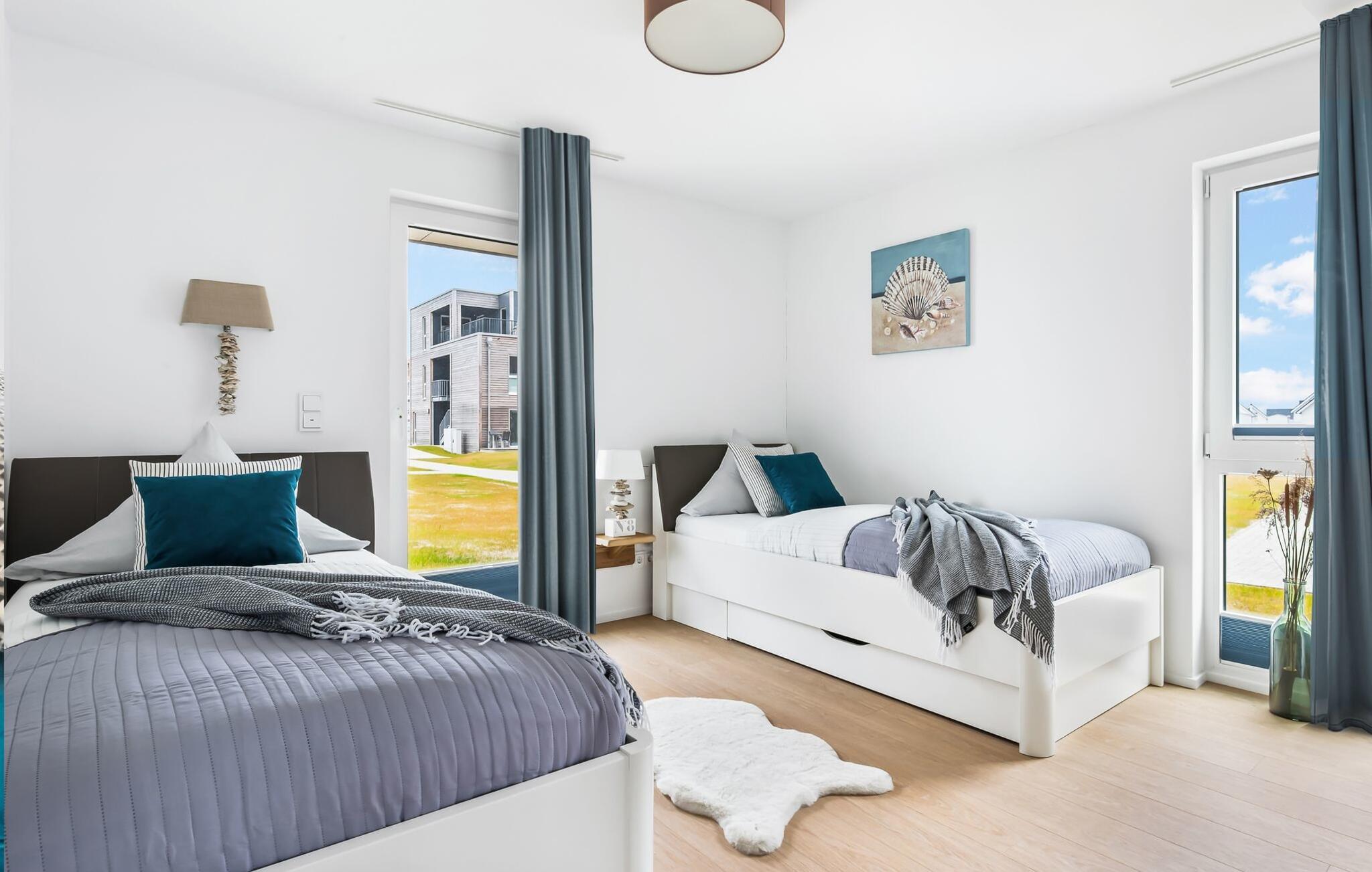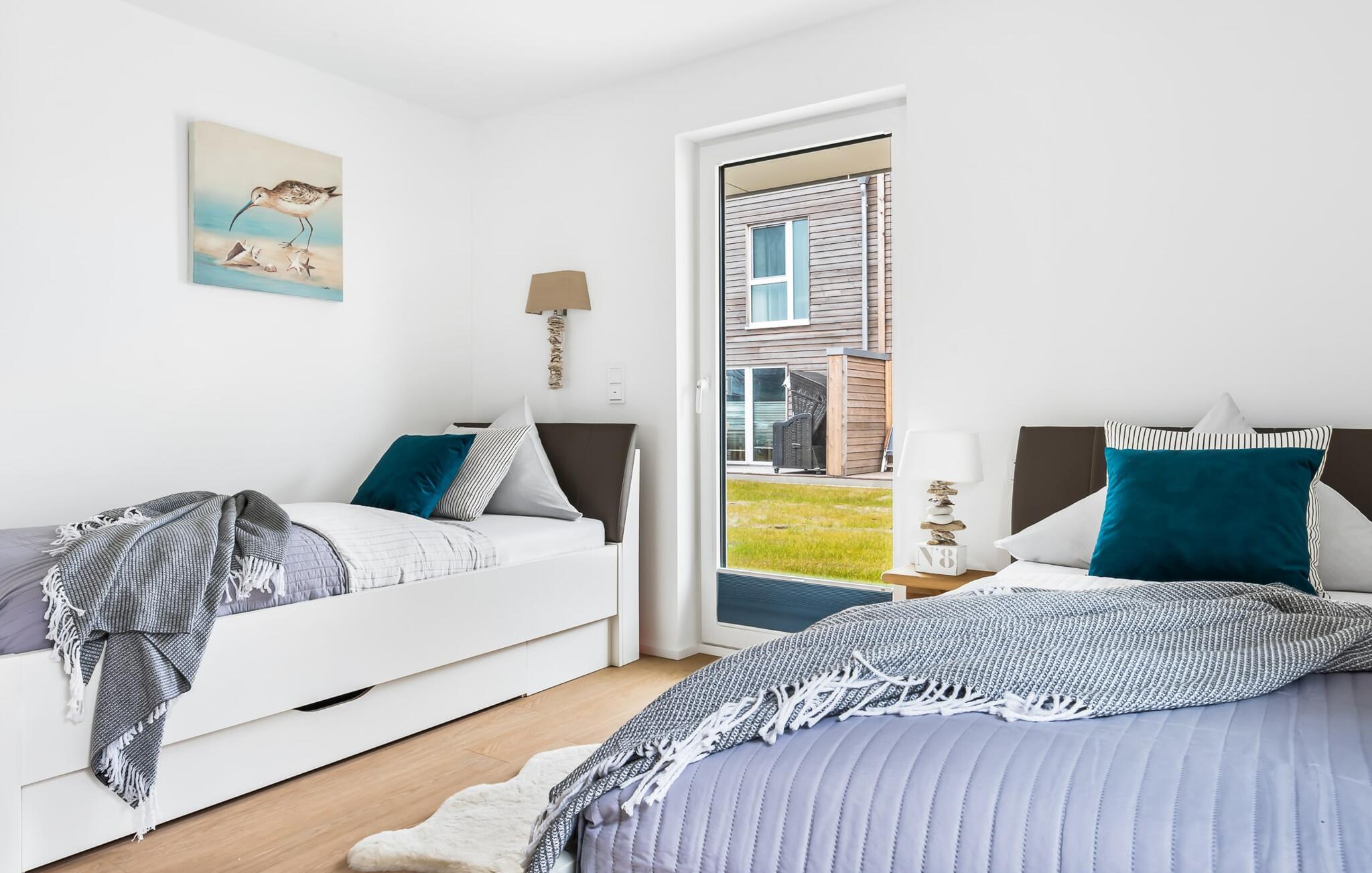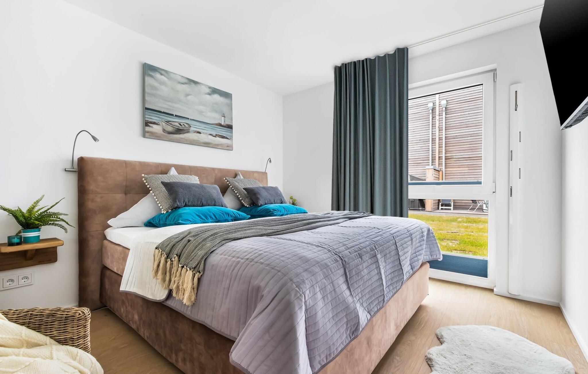 Für die nächtliche Erholung stehen zwei Schlafzimmer mit komfortablen Betten bereit. Das erste Schlafzimmer lädt mit einem Doppelboxspringbett zu erholsamen Nächten ein. Das zweite Schlafzimmer ist mit zwei großen (2 x 1 m) Einzelbetten ausgestattet und verfügt über eine kleine, überdachte Terrasse und für Schietwetter liegen Spiele bereit. Der Hafen ist von beiden Schlafzimmern in Blickweite und regt die Fantasie für Outdoor Unternehmungen an.