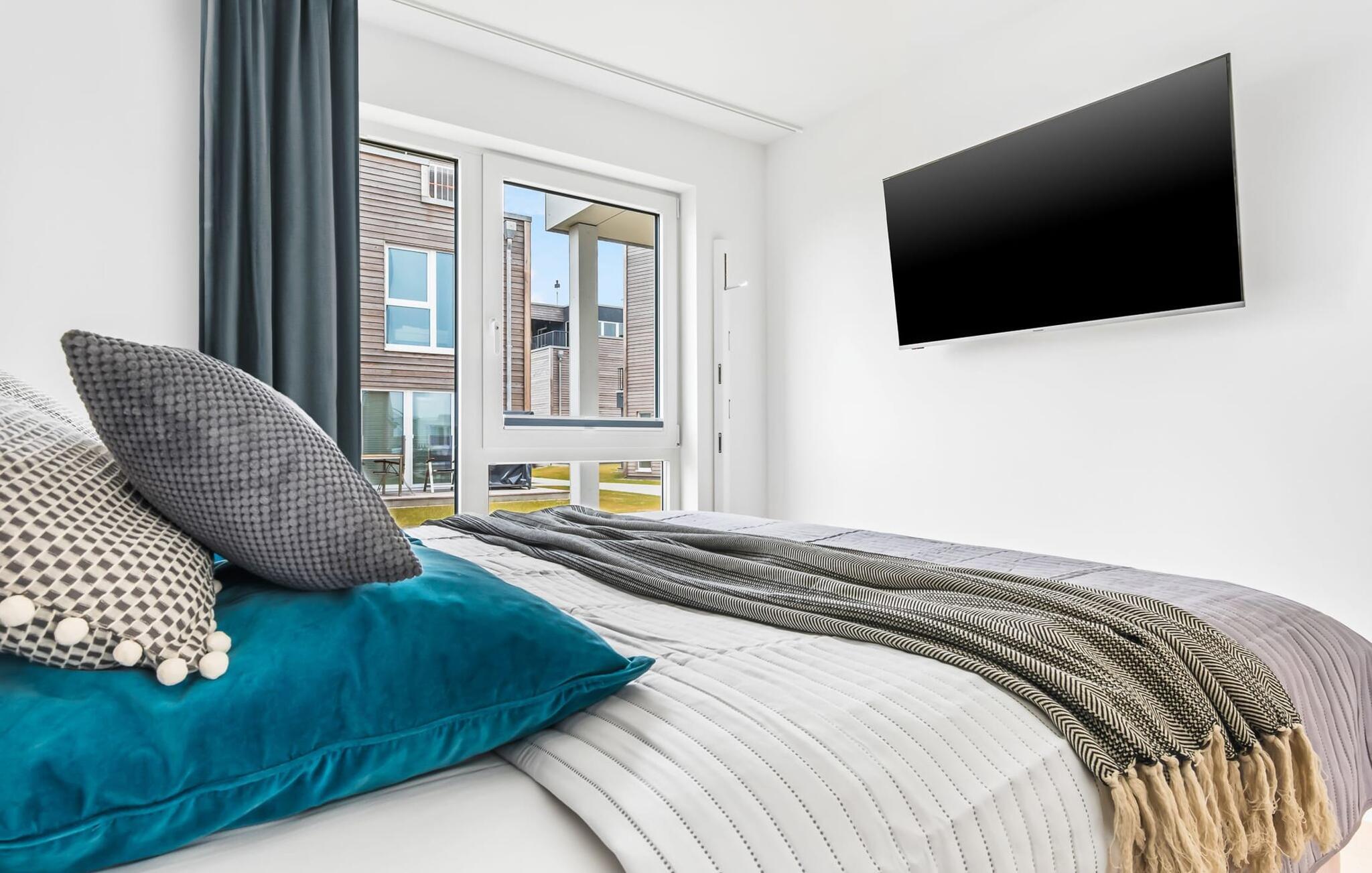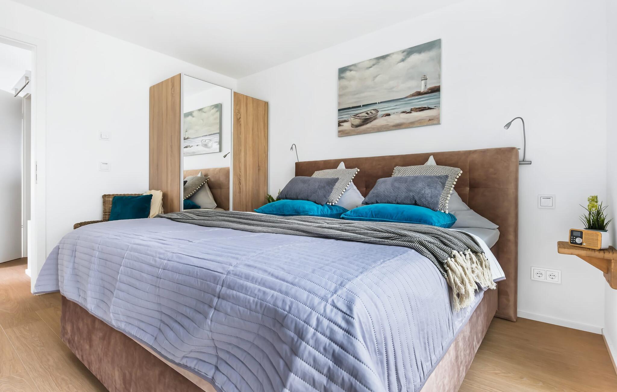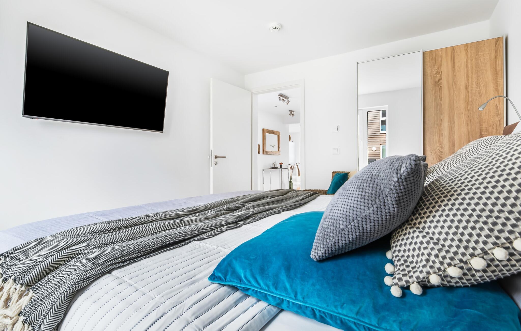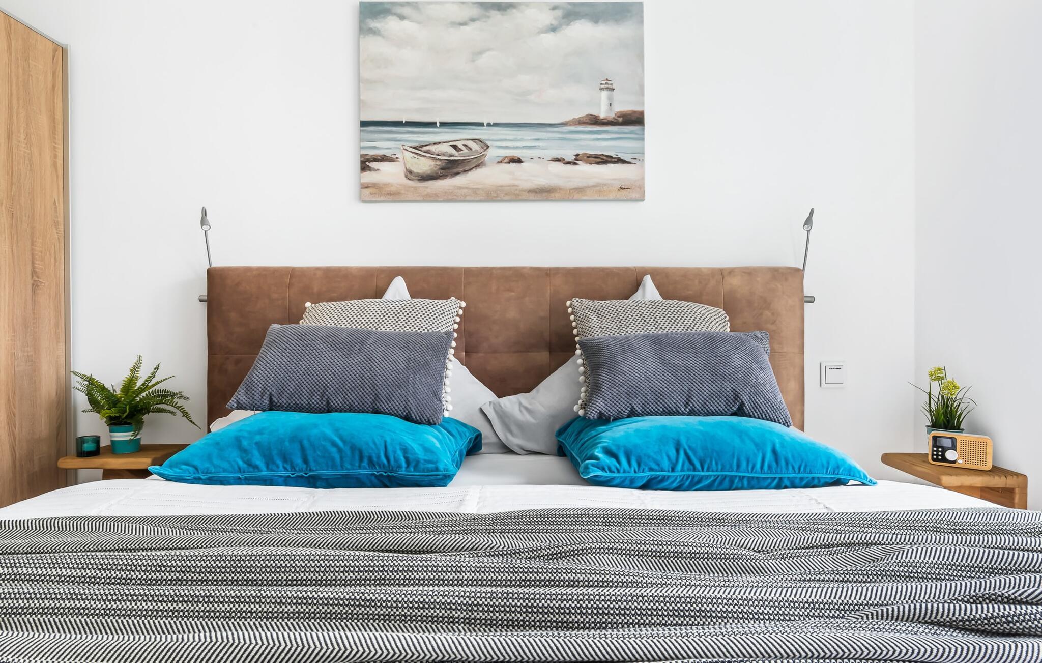 Für die nächtliche Erholung stehen zwei Schlafzimmer mit komfortablen Betten bereit. Das erste Schlafzimmer lädt mit einem Doppelboxspringbett zu erholsamen Nächten ein. Das zweite Schlafzimmer ist mit zwei großen (2 x 1 m) Einzelbetten ausgestattet und verfügt über eine kleine, überdachte Terrasse und für Schietwetter liegen Spiele bereit. Der Hafen ist von beiden Schlafzimmern in Blickweite und regt die Fantasie für Outdoor Unternehmungen an.