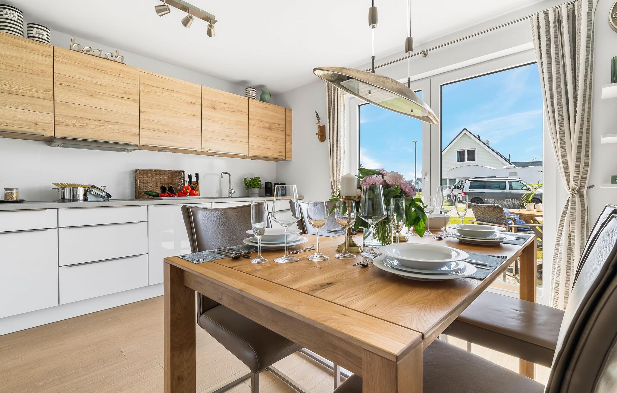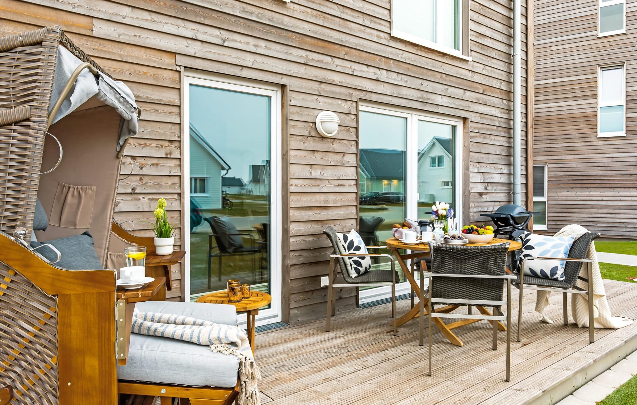 Die integrierte Küche ist perfekt ausgestattet und gemeinsames Kochen macht viel Spaß. Die fertigen Leckereien dann auf der Terrasse genießen oder einen geselligen Grillabend mit dem Elektrogrill einläuten. Direkt vom Wohnbereich der SEUTEN DEERN aus betretet ihr die große Terrasse mit Süd-Ausrichtung. Richtung Sonne ausgerichtet laden die bereitstehenden Gartenmöbel inklusive Strandkorb und Deckchair zu erholsamen Urlaubstagen ein. Das ist Urlaub pur!