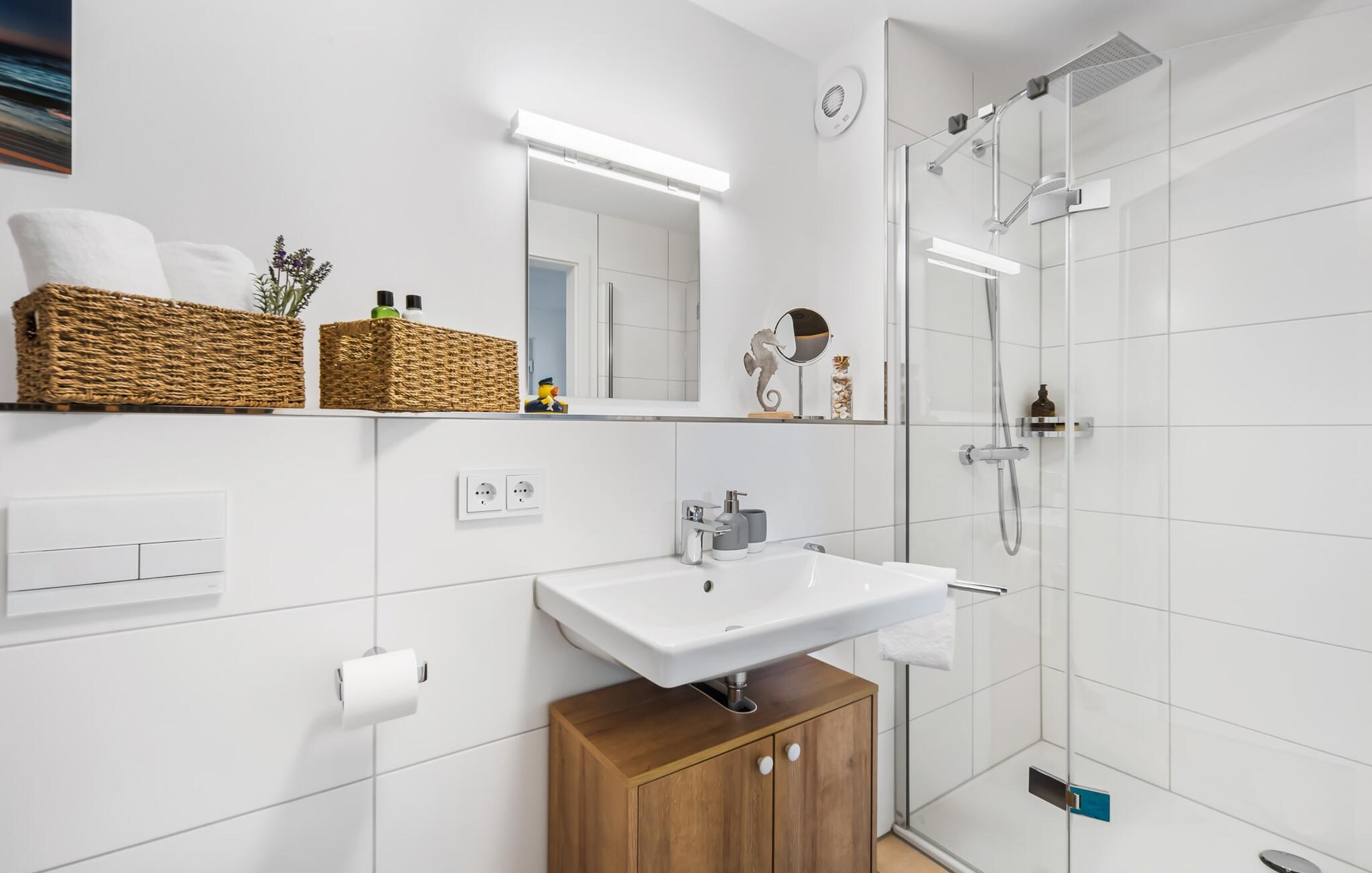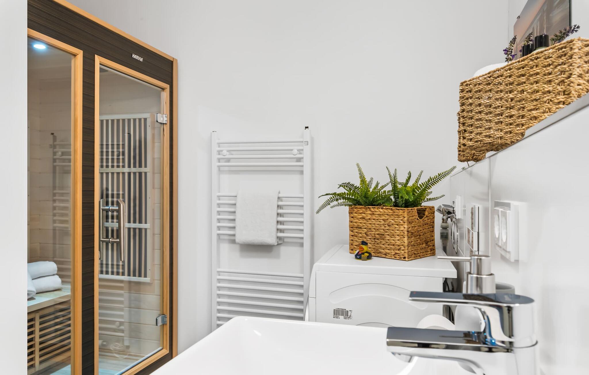 Das Duschbad mit bodengleicher Dusche und einer Infrarot-Sauna sorgt für unvergessliche Wellnessmomente von denen ihr noch lange zehren könnt.
