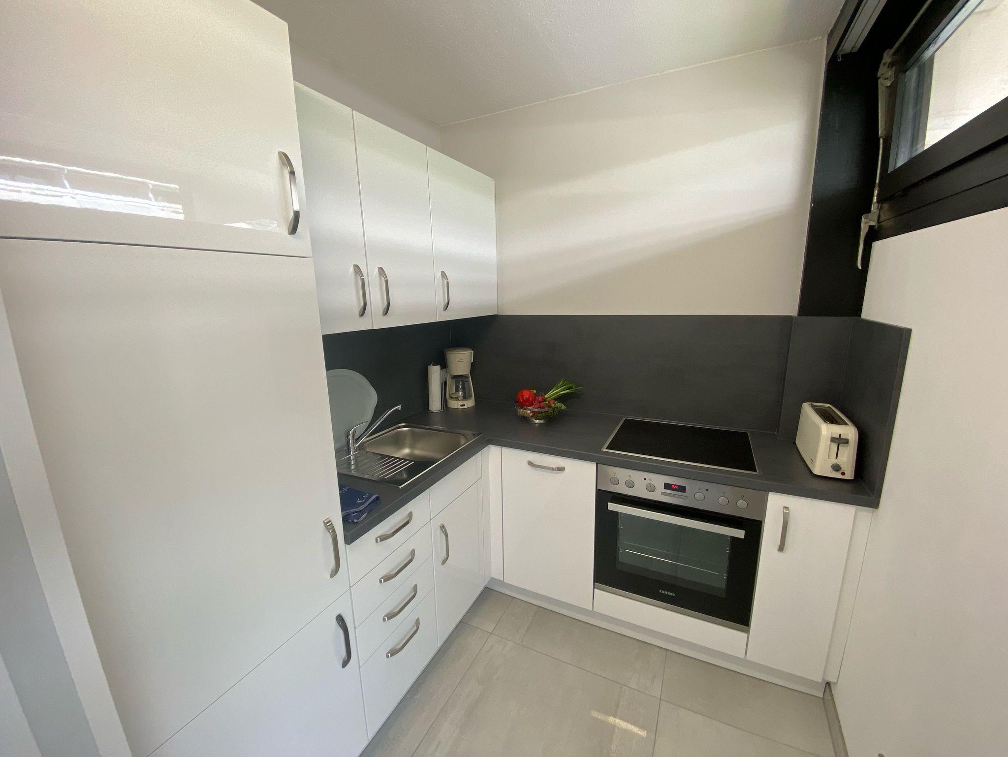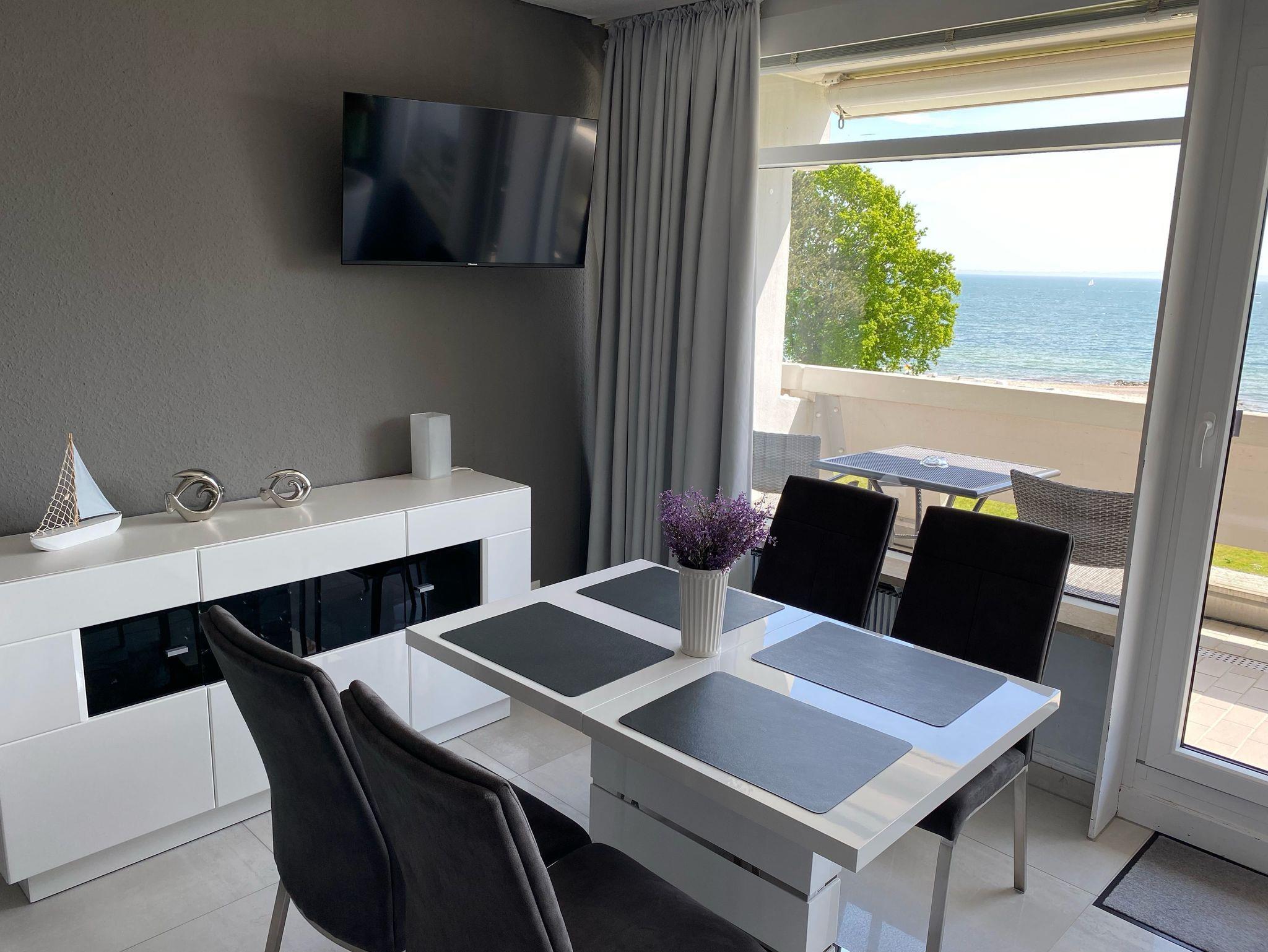 Diese Wohnung wurde im Frühjahr 2023 total renoviert und neu eingerichtet. Die helle, modern eingerichtete Wohnung ist über die gesamte Fläche mit einem hellgrauen Fliesenfußboden ausgestattet. Im Wohnzimmer befindet sich in einer Schlafnische das bequeme Doppel-Box-Spring-bett, von welchem man einen Blick auf die Ostsee genießen kann. Im separaten Schlafzimmer stehen zwei Einzelbetten. Das Duschbad ist ebenso neu gestaltet und vergrößert. Es hat eine bodengleiche Dusche. Die Küche ist in einem separaten Raum untergebracht und verfügt über Geschirrspüler, Backherd und Kühlschrank mit Gefrierfach. Von der Loggia haben Sie einen einzigartigen Panorama Meerblick über die Lübecker Bucht.