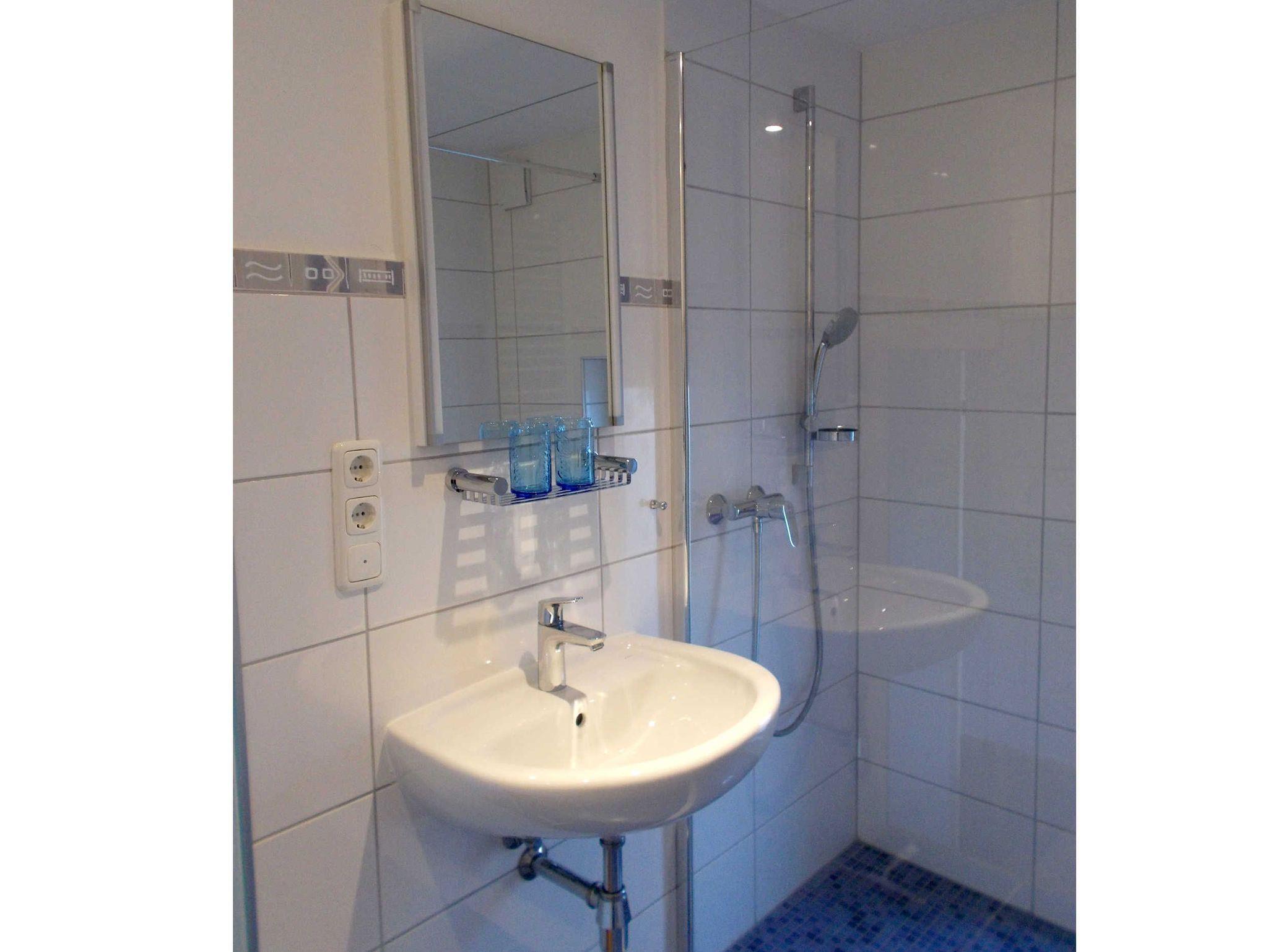 Auf der unteren Wohnebene befindet sich ein Schlafzimmer (Doppelbett) und im Dachgeschoss steht ein weiteres Doppelzimmer mit Aufenthaltsraum zur Verfügung. An das Doppelzimmer (Durchgangszimmer) grenzt ein weiteres kleines Schlafzimmer mit Einzelbett. Ein vorhandenes Kinderbett lässt sich flexibel aufstellen. Im hinteren Bereich der Wohnung bietet eine geräumige und umfangreich ausgestattete Küche die Möglichkeit, sich bei Bedarf selbst zu versorgen.